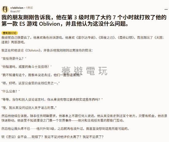 正文摘要:各位冒險者們,準備好踏入泰姆瑞爾的奇幻世界了嗎?Bethesda Softworks 這次端出的《上古卷軸IV:遺忘之都重製版》可說是讓老玩家們回味無窮,新玩家們驚豔連連。這款遊戲最迷人的地方,莫過於它那廣闊無垠的世界,讓你愛去哪就去哪,想做啥就做啥。然而,最近遊戲媒體 gamespark 卻發現了一件跌破大家眼鏡的事:竟然有玩家創下了 3級就破關 的驚人紀錄!這到底是怎麼辦到的?難道是傳說中的「光速通關流」? 這段奇聞軼事來自 Reddit 玩家 Knarz97 的分享。他跟朋友聊到《上古卷軸IV:遺忘之都重製版》時,隨口提到了「競技場」,沒想到朋友的回應讓他瞬間傻眼:「競技場是什麼?」接著,當他們聊到公會的支線任務時,朋友再次展現了「狀況外」的反應:「公會又是什麼?」Knarz97 進一步追問才發現,這位朋友竟然只花了短短 7小時 就把遊戲主線給跑完了,而且等級只有 3級!這簡直是把遊戲當成「跑酷模擬器」,全程只顧著衝向終點,對於主線任務以外的內容,可以說是「一問三不知」,完全錯過了遊戲中豐富的支線劇情、公會任務以及各種隱藏的驚喜。這不禁讓人好奇,這樣玩遊戲的樂趣在哪裡呢?難道是追求極致的效率?還是單純想看看結局長什麼樣子? 這兩位玩家的極端玩法,正好體現了《上古卷軸》系列的高度自由性。無論你是追求效率的「速通玩家」,還是享受過程的「慢活玩家」,都能在這片廣闊的土地上找到屬於自己的樂趣。不過,對於那位3級就破關的玩家,我還是想問一句:你確定你玩的是《上古卷軸IV:遺忘之都重製版》,而不是什麼「湮滅速通模擬器」嗎? 以下廣告滑動後還有帖子內容var custom_call_MIR = function (params) {if ( params === null || params.hasAd === false ) {var divRowSide;for (let index = 0; index < ONEADs.length; index++) {if (ONEADs[index].pub.player_mode === "mobile-inread") {divRowSide = ONEADs[index].pub.slotobj;}}var ins = document.createElement('ins');ins.className = 'clickforceads';ins.setAttribute('style', 'display:inline-block;');ins.setAttribute('data-ad-zone', '18264');divRowSide.appendChild(ins);var js = document.createElement('script');js.async = true;js.type = 'text/javascript';js.setAttribute('src', '//cdn.holmesmind.com/js/init.js');js.onload = function(){console.log('[ONEAD MIR] ClickForce Loaded');};divRowSide.appendChild(js);}};var _ONEAD = {};_ONEAD.pub = {};_ONEAD.pub.slotobj = document.getElementById("oneadMIRDFPTag");_ONEAD.pub.slots = ["div-onead-ad"];_ONEAD.pub.uid = "1000509";_ONEAD.pub.external_url = "https://onead.onevision.com.tw/";_ONEAD.pub.scopes = ["spotbuy", "speed"];_ONEAD.pub.player_mode_div = "div-onead-ad";_ONEAD.pub.player_mode = "mobile-inread";_ONEAD.pub.queryAdCallback = custom_call_MIR;var ONEAD_pubs = ONEAD_pubs || [];ONEAD_pubs.push(_ONEAD);var truvidScript = document.createElement('script'); truvidScript.async = true; truvidScript.setAttribute('data-cfasync','false'); truvidScript.type = 'text/javascript'; truvidScript.src = '//stg.truvidplayer.com/index.php?sub_user_id=597&widget_id=3309&playlist_id=2381&m=a&cb=' + (Math.random() * 10000000000000000); var currentScript = document.currentScript || document.scripts[document.scripts.length - 1]; currentScript.parentNode.insertBefore(truvidScript, currentScript.nextSibling); 常見問題Q&A 為什麼有人可以3級就通關《上古卷軸IV:遺忘之都重製版》? 這主要是因為他們只專注於完成主線任務,忽略了所有支線任務、探索和練功,直接衝向遊戲結局。 3級通關會錯過哪些遊戲內容? 幾乎所有非主線的內容都會錯過,包括公會任務、支線任務、探索地圖、發現隱藏地點、提升技能等級、收集裝備等等。 玩了87小時只有4級是正常的嗎? 這非常不正常,但這代表玩家可能花費大量時間在遊戲初期區域練功、嘗試不同玩法,或是單純享受探索過程而沒有推進主線。 《上古卷軸IV:遺忘之都重製版》的遊戲時長大概是多久? 如果只玩主線,可能數十小時;如果加上支線和探索,輕鬆破百小時甚至數百小時都有可能,取決於玩家的玩法。 這款遊戲的魅力在哪裡? 最大的魅力在於其極高的自由度、廣闊的開放世界、豐富的劇情和任務、以及多樣化的角色發展系統,讓玩家可以自由選擇自己的冒險方式。 👉 GM後台版 遊戲 推薦 ⬇️⬇️⬇️ 快速玩各種二次元動漫手遊app |