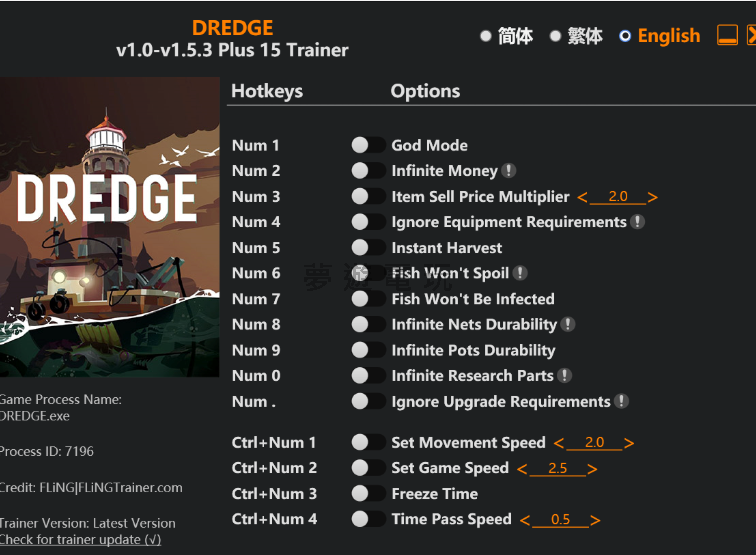 正文摘要:replyreload += ',' + 2385246; 修改器功能介紹 本修改器支援遊戲版本:v1.0-v1.5.3+ 最後更新日期:2025.04.29 共提供15種功能選項 基本功能 (數字鍵) • Num 1 – 無敵模式 • Num 2 – 無限金錢 • Num 3 – 物品售價倍率調整 • Num 4 – 忽略裝備需求 • Num 5 – 即時收穫 • Num 6 – 魚不會腐壞 • Num 7 – 魚不會被感染 • Num 8 – 無限漁網耐久度 • Num 9 – 無限魚籠耐久度 • Num 0 – 無限研究零件 • Num . – 忽略升級需求 進階功能 (Ctrl+數字鍵) • Ctrl+Num 1 – 設定移動速度 • Ctrl+Num 2 – 設定遊戲速度 • Ctrl+Num 3 – 凍結時間 • Ctrl+Num 4 – 時間流逝速度調整 修改器使用教學 1. 下載修改器檔案 2. 運行遊戲,確保遊戲已經啟動 3. 執行修改器程式 4. 使用對應的快捷鍵啟用所需功能 5. 享受遊戲體驗! 注意事項: - 使用修改器前建議先備份存檔 - 某些防毒軟體可能會誤報,可以將修改器加入白名單 - 修改器僅支援v1.0-v1.5.3+版本的遊戲,其他版本可能無法正常使用 下載連結 DREDGE v1.0-v1.5.3 Plus 15 Trainer.exe 所有站內附件皆會附上安全掃描報告請會員查看純淨度百分比後判斷使用(adsbygoogle = window.adsbygoogle || []).push({});相關檔案須知:取得檔案前,請先詳細閱讀文章內容避免不必要錯誤與誤會發生。也可多參考文章討論樓層內容了解附件檔案相關討論資訊。 【此文章部分內容隱藏中】 解除隱藏說明教學點擊下方 繼續閱讀文章 後請仔細觀看文章內容 並依照指示進行下一步最後完成解除隱藏後系統會回到此文章自動顯示隱藏內容~繼續閱讀 常見問題解答 Q1: 修改器無法正常運作怎麼辦? A1: 請確認您的遊戲版本是否為v1.0-v1.5.3+,且修改器版本是最新的2025.04.29版本。如果版本不符,修改器可能無法正常運作。 Q2: 使用修改器會影響遊戲存檔嗎? A2: 一般情況下不會直接影響存檔,但為了安全起見,建議在使用修改器前先備份您的遊戲存檔。 Q3: 為什麼我的防毒軟體會攔截修改器? A3: 修改器程式會修改遊戲記憶體,因此可能被防毒軟體誤判為潛在威脅。您可以將修改器添加到防毒軟體的白名單中。 Q4: 如何使用倍率調整功能? A4: 按下對應的快捷鍵(如Num 3調整物品售價倍率)後,會彈出一個輸入框,您可以在其中輸入想要的倍率數值。例如,輸入2.0會使物品售價提高為原來的兩倍。 Q5: 修改器的「魚不會腐壞」和「魚不會被感染」功能有什麼區別? A5: 「魚不會腐壞」功能可以防止捕獲的魚隨時間流逝而變質,保持新鮮度;而「魚不會被感染」功能則是防止魚被遊戲中的異常現象感染變異,保持正常狀態。兩個功能結合使用可以讓您的漁獲保持最佳狀態。 👉 GM後台版 遊戲 推薦 ⬇️⬇️⬇️ 快速玩各種二次元動漫手遊appreplyreload += ',' + 2385246; |