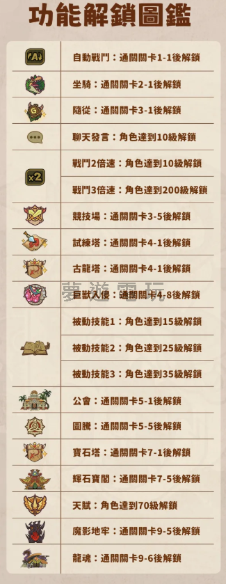 正文摘要:👉 GM後台版 遊戲 推薦 ⬇️⬇️⬇️ 快速玩各種二次元動漫手遊app 新手必看:功能解鎖條件總覽 想要在《恐龍特遣隊》中快速掌握遊戲進度和開放各種功能嗎?本篇攻略為各位玩家整理了完整的功能解鎖條件,讓你清楚了解每個系統何時能夠使用,幫助你在遊戲中更有效率地成長! 關卡進度解鎖功能 遊戲中許多重要功能需要通過主線關卡來解鎖: 自動戰鬥:通關關卡1-1後解鎖 坐騎系統:通關關卡2-1後解鎖 隨從系統:通關關卡3-1後解鎖 競技場:通關關卡3-5後解鎖 試練塔:通關關卡4-1後解鎖 古龍塔:通關關卡4-1後解鎖 巨獸入侵:通關關卡4-8後解鎖 公會系統:通關關卡5-1後解鎖 團戰玩法:通關關卡5-5後解鎖 寶石塔:通關關卡7-1後解鎖 輝石寶閣:通關關卡7-5後解鎖 魔影地宇:通關關卡9-5後解鎖 龍魂系統:通關關卡9-6後解鎖 等級解鎖功能 除了關卡進度外,角色等級也是解鎖部分功能的關鍵: 聊天發言:角色達到10級解鎖 戰鬥2倍速:角色達到10級解鎖 被動技能1:角色達到15級解鎖 被動技能2:角色達到25級解鎖 被動技能3:角色達到35級解鎖 天賦系統:角色達到70級解鎖 戰鬥3倍速:角色達到200級解鎖 功能解鎖優先順序建議 根據遊戲進度和實用性,以下是建議優先解鎖的功能: 自動戰鬥 - 提升刷圖效率的基礎功能 戰鬥2倍速 - 加快戰鬥節奏,節省時間 坐騎系統 - 提升移動速度 被動技能 - 大幅提升角色戰力 競技場 - 獲取重要日常資源 公會系統 - 解鎖團隊玩法和獎勵 以下廣告滑動後還有帖子內容var custom_call_MIR = function (params) {if ( params === null || params.hasAd === false ) {var divRowSide;for (let index = 0; index < ONEADs.length; index++) {if (ONEADs[index].pub.player_mode === "mobile-inread") {divRowSide = ONEADs[index].pub.slotobj;}}var ins = document.createElement('ins');ins.className = 'clickforceads';ins.setAttribute('style', 'display:inline-block;');ins.setAttribute('data-ad-zone', '18264');divRowSide.appendChild(ins);var js = document.createElement('script');js.async = true;js.type = 'text/javascript';js.setAttribute('src', '//cdn.holmesmind.com/js/init.js');js.onload = function(){console.log('[ONEAD MIR] ClickForce Loaded');};divRowSide.appendChild(js);}};var _ONEAD = {};_ONEAD.pub = {};_ONEAD.pub.slotobj = document.getElementById("oneadMIRDFPTag");_ONEAD.pub.slots = ["div-onead-ad"];_ONEAD.pub.uid = "1000509";_ONEAD.pub.external_url = "https://onead.onevision.com.tw/";_ONEAD.pub.scopes = ["spotbuy", "speed"];_ONEAD.pub.player_mode_div = "div-onead-ad";_ONEAD.pub.player_mode = "mobile-inread";_ONEAD.pub.queryAdCallback = custom_call_MIR;var ONEAD_pubs = ONEAD_pubs || [];ONEAD_pubs.push(_ONEAD);var truvidScript = document.createElement('script'); truvidScript.async = true; truvidScript.setAttribute('data-cfasync','false'); truvidScript.type = 'text/javascript'; truvidScript.src = '//stg.truvidplayer.com/index.php?sub_user_id=597&widget_id=3309&playlist_id=2381&m=a&cb=' + (Math.random() * 10000000000000000); var currentScript = document.currentScript || document.scripts[document.scripts.length - 1]; currentScript.parentNode.insertBefore(truvidScript, currentScript.nextSibling); 常見問題Q&A Q1: 如何快速解鎖自動戰鬥功能? A1: 只需完成遊戲的第一個關卡1-1即可解鎖,新手玩家可以在遊戲開始後約5-10分鐘內獲得。 Q2: 戰鬥3倍速需要角色達到200級,有捷徑可以提前解鎖嗎? A2: 目前遊戲中沒有提前解鎖3倍速的方法,這是為了確保玩家在熟悉遊戲機制後再使用更快的戰鬥速度。 Q3: 被動技能對戰力提升有多大幫助? A3: 被動技能是提升角色戰力的重要來源,特別是第三個被動技能可以提供約15-20%的整體戰力提升,建議優先解鎖並升級。 Q4: 公會系統有哪些重要獎勵? A4: 加入公會後可以參與公會副本、公會商店和公會捐獻等活動,獲得獨特的裝備、進化材料和公會幣等資源。 Q5: 天賦系統需要角色70級才能解鎖,有什麼快速升級的方法? A5: 快速升級可以通過完成日常任務、參與活動、挑戰經驗副本以及使用經驗藥水來加速。特別是在經驗翻倍活動期間刷經驗副本效率最高。 |