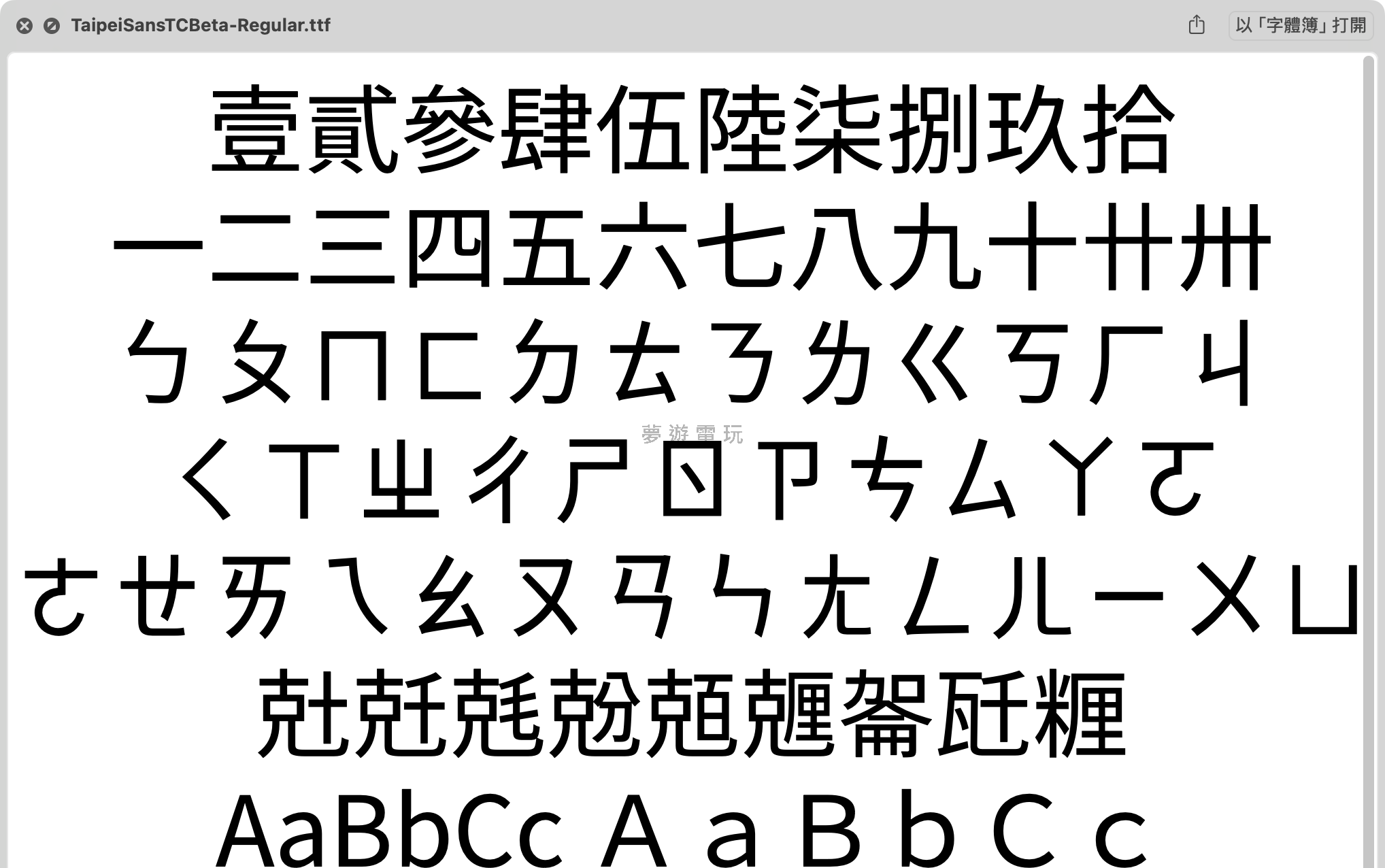正文摘要:版本:1.000 更新日期:2024年05月08日 圖片盡量放在文章開頭。 關於台北黑體 台北黑體是一個較接近遊戲使用者書寫習慣的免費繁體中文字型,在2019年由 JT Foundry 從 Adobe 的思源黑體改作而來。 改善了許多看起來怪怪的、不一致的偏旁或筆畫…,讓整個字型的輸出更有一致性、更接近原本遊戲使用者的書寫方式,並能用於平面出版與印刷。 台北黑體目前僅提供 Light、Regular、Bold 三種字重,可惜後來就沒再繼續了。使用「SIL Open Font License (OFL) 1.1 」開放字型授權的方式,一般使用者、教育單位、商用或其他各種用途都可以免費、無限制使用。 軟體資訊 檔案大小: 59.7 MB 作業系統: windows 7/8/10/11 以下廣告滑動後還有帖子內容var custom_call_MIR = function (params) {if ( params === null || params.hasAd === false ) {var divRowSide;for (let index = 0; index < ONEADs.length; index++) {if (ONEADs[index].pub.player_mode === "mobile-inread") {divRowSide = ONEADs[index].pub.slotobj;}}var ins = document.createElement('ins');ins.className = 'clickforceads';ins.setAttribute('style', 'display:inline-block;');ins.setAttribute('data-ad-zone', '18264');divRowSide.appendChild(ins);var js = document.createElement('script');js.async = true;js.type = 'text/javascript';js.setAttribute('src', '//cdn.holmesmind.com/js/init.js');js.onload = function(){console.log('[ONEAD MIR] ClickForce Loaded');};divRowSide.appendChild(js);}};var _ONEAD = {};_ONEAD.pub = {};_ONEAD.pub.slotobj = document.getElementById("oneadMIRDFPTag");_ONEAD.pub.slots = ["div-onead-ad"];_ONEAD.pub.uid = "1000509";_ONEAD.pub.external_url = "https://onead.onevision.com.tw/";_ONEAD.pub.scopes = ["spotbuy", "speed"];_ONEAD.pub.player_mode_div = "div-onead-ad";_ONEAD.pub.player_mode = "mobile-inread";_ONEAD.pub.queryAdCallback = custom_call_MIR;var ONEAD_pubs = ONEAD_pubs || [];ONEAD_pubs.push(_ONEAD);var truvidScript = document.createElement('script'); truvidScript.async = true; truvidScript.setAttribute('data-cfasync','false'); truvidScript.type = 'text/javascript'; truvidScript.src = '//stg.truvidplayer.com/index.php?sub_user_id=597&widget_id=3309&playlist_id=2381&m=a&cb=' + (Math.random() * 10000000000000000); var currentScript = document.currentScript || document.scripts[document.scripts.length - 1]; currentScript.parentNode.insertBefore(truvidScript, currentScript.nextSibling); 如何下載 以下提供台北黑體的下載連結,方便您安裝使用。 下載連結: 下載連結 (來自 Google Drive) 👉 GM後台版 遊戲 推薦 ⬇️⬇️⬇️ 快速玩各種二次元動漫手遊app |