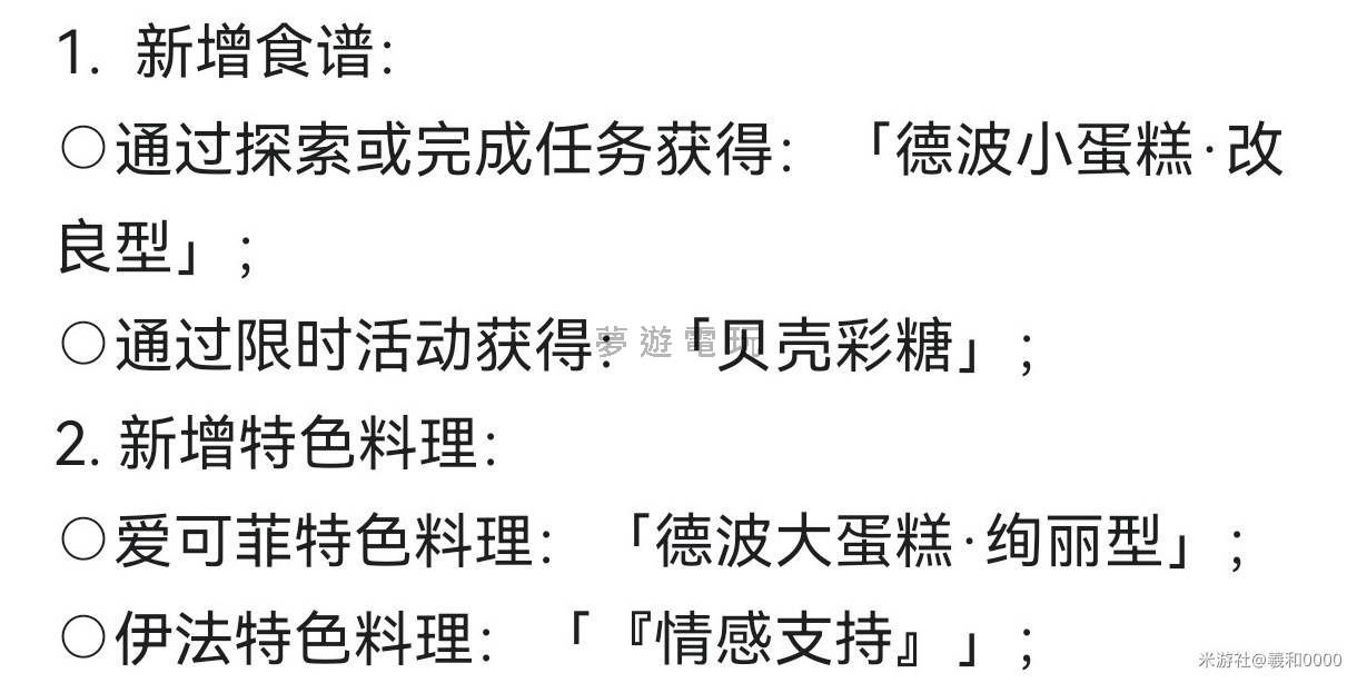 正文摘要:《原神》5.6版本新增食譜與料理總整理 👉 GM後台版 遊戲 推薦 ⬇️⬇️⬇️ 快速玩各種二次元動漫手遊app 另一個新的食譜,是透過完成「愛可菲」的傳說任務最終階段來獲得。請務必將此系列任務全部完成,才能確保取得該食譜。 未解之謎與未來展望 圖中提到有一個食譜是透過探索來獲得,然而目前尚未確認具體的探索地點。可能需要等待後續版本更新或活動上線才會揭曉。 以下廣告滑動後還有帖子內容var custom_call_MIR = function (params) {if ( params === null || params.hasAd === false ) {var divRowSide;for (let index = 0; index < ONEADs.length; index++) {if (ONEADs[index].pub.player_mode === "mobile-inread") {divRowSide = ONEADs[index].pub.slotobj;}}var ins = document.createElement('ins');ins.className = 'clickforceads';ins.setAttribute('style', 'display:inline-block;');ins.setAttribute('data-ad-zone', '18264');divRowSide.appendChild(ins);var js = document.createElement('script');js.async = true;js.type = 'text/javascript';js.setAttribute('src', '//cdn.holmesmind.com/js/init.js');js.onload = function(){console.log('[ONEAD MIR] ClickForce Loaded');};divRowSide.appendChild(js);}};var _ONEAD = {};_ONEAD.pub = {};_ONEAD.pub.slotobj = document.getElementById("oneadMIRDFPTag");_ONEAD.pub.slots = ["div-onead-ad"];_ONEAD.pub.uid = "1000509";_ONEAD.pub.external_url = "https://onead.onevision.com.tw/";_ONEAD.pub.scopes = ["spotbuy", "speed"];_ONEAD.pub.player_mode_div = "div-onead-ad";_ONEAD.pub.player_mode = "mobile-inread";_ONEAD.pub.queryAdCallback = custom_call_MIR;var ONEAD_pubs = ONEAD_pubs || [];ONEAD_pubs.push(_ONEAD);var truvidScript = document.createElement('script'); truvidScript.async = true; truvidScript.setAttribute('data-cfasync','false'); truvidScript.type = 'text/javascript'; truvidScript.src = '//stg.truvidplayer.com/index.php?sub_user_id=597&widget_id=3309&playlist_id=2381&m=a&cb=' + (Math.random() * 10000000000000000); var currentScript = document.currentScript || document.scripts[document.scripts.length - 1]; currentScript.parentNode.insertBefore(truvidScript, currentScript.nextSibling); 《原神》5.6新食譜與料理 常見問題Q&A Q1: 我要怎麼拿到5.6版本新增的食譜? A1: 大部分新食譜是透過完成指定的魔神任務(傳說任務)來獲得。 Q2: 苦水食譜要去哪裡買? A2: 苦水食譜可以在納塔聖火競技場旁邊地下錨點附近的扎卡小吃攤找攤主安夏卡購買。 Q3: 完成愛可菲的傳說任務會拿到什麼? A3: 完成愛可菲傳說任務最後階段,可以獲得一個新的食譜。 Q4: 有食譜是探索就可以拿到的對嗎? A4: 對,圖中有提到一個食譜可以透過探索取得,但目前具體地點還不清楚。 Q5: 5.6版本新增了哪些特別料理? A5: 除了圖中顯示的幾種,還新增了「致水神」和「果果軟糖」。 |