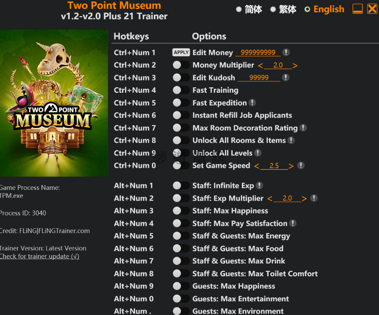 正文摘要:replyreload += ',' + 2386204; 《Two Point Museum 雙點博物館》訓練器介紹 這款針對《雙點博物館》(Two Point Museum)的訓練器提供了21項強大功能,完美支援遊戲v1.2.至v2.0.+版本。本訓練器於2025年5月7日更新,能夠幫助玩家在經營博物館時獲得更多自由度和樂趣,輕鬆解決金錢、資源和人員管理問題。 訓練器功能列表 基本資源功能 (Ctrl+數字鍵) - Ctrl+Num 1 – 編輯金錢 - Ctrl+Num 2 – 金錢倍數增加 - Ctrl+Num 3 – 編輯榮譽幣(Kudosh) - Ctrl+Num 4 – 快速培訓 - Ctrl+Num 5 – 快速考察 - Ctrl+Num 6 – 立即補充求職者 - Ctrl+Num 7 – 房間裝飾評分最大化 - Ctrl+Num 8 – 解鎖所有房間和物品 - Ctrl+Num 9 – 解鎖所有關卡 - Ctrl+Num 0 – 設定遊戲速度 員工與訪客功能 (Alt+數字鍵) - Alt+Num 1 – 員工:無限經驗 - Alt+Num 2 – 員工:經驗倍數增加 - Alt+Num 3 – 員工:幸福度最大化 - Alt+Num 4 – 員工:薪資滿意度最大化 - Alt+Num 5 – 員工和訪客:體力最大化 - Alt+Num 6 – 員工和訪客:飢餓度最大化 - Alt+Num 7 – 員工和訪客:口渴度最大化 - Alt+Num 8 – 員工和訪客:如廁舒適度最大化 - Alt+Num 9 – 訪客:幸福度最大化 - Alt+Num 0 – 訪客:娛樂度最大化 - Alt+Num . – 訪客:環境滿意度最大化 使用方法 - 下載訓練器檔案 - 先啟動《雙點博物館》遊戲,等待遊戲完全載入 - 執行訓練器程式 - 使用對應的快捷鍵啟用你需要的功能 - 享受無憂的博物館經營體驗 遊戲介紹 《雙點博物館》是由Two Point StudIOS開發的模擬經營遊戲,讓玩家扮演博物館館長,建造和管理自己的博物館。玩家需要收集展品、設計展覽、雇用員工、吸引訪客,並確保博物館的財務健康。這款遊戲延續了《雙點醫院》的風格,充滿幽默和挑戰性。 使用本訓練器,你可以輕鬆解決遊戲中的各種困難,專注於創意設計和博物館管理的樂趣部分,打造出理想中的完美博物館! 下載連結 Two Point Museum v1.2-v2.0 Plus 21 Trainer.exe 所有站內附件皆會附上安全掃描報告請會員查看純淨度百分比後判斷使用(adsbygoogle = window.adsbygoogle || []).push({});相關檔案須知:取得檔案前,請先詳細閱讀文章內容避免不必要錯誤與誤會發生。也可多參考文章討論樓層內容了解附件檔案相關討論資訊。 【此文章部分內容隱藏中】 解除隱藏說明教學點擊下方 繼續閱讀文章 後請仔細觀看文章內容 並依照指示進行下一步最後完成解除隱藏後系統會回到此文章自動顯示隱藏內容~繼續閱讀 常見問題解答 Q1: 這個訓練器適用於哪些版本的《雙點博物館》? A1: 本訓練器適用於v1.2.至v2.0.+版本的《雙點博物館》,覆蓋了目前最新的遊戲版本。 Q2: 使用訓練器會影響遊戲存檔嗎? A2: 訓練器只是暫時修改遊戲記憶體中的數值,通常不會直接影響存檔。但建議在使用前先備份你的遊戲存檔,以防萬一。 Q3: 為什麼有些功能無法正常工作? A3: 可能是因為遊戲版本更新導致不相容。請確保你使用的是最新版訓練器,並且遊戲版本與訓練器相符。如果遊戲有更新,可能需要等待訓練器作者更新版本。 Q4: 使用訓練器會被遊戲官方檢測到嗎? A4: 這款訓練器設計用於單人遊戲體驗,不會影響多人遊戲。在單人模式中使用通常是安全的,但若遊戲有線上功能,請謹慎使用。 Q5: 如何關閉已啟用的訓練器功能? A5: 通常只需再次按下相應的快捷鍵即可關閉該功能。如果無法關閉,可以嘗試重新啟動遊戲。 👉 GM後台版 遊戲 推薦 ⬇️⬇️⬇️ 快速玩各種二次元動漫手遊app replyreload += ',' + 2386204; |