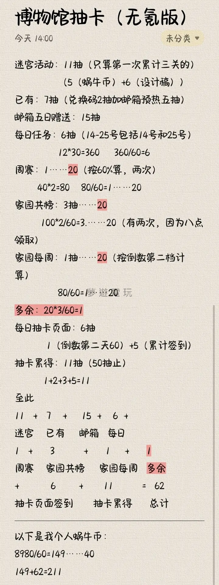 博物館抽卡攻略(零課金版) 想知道在《我的休閒時光》中零元黨如何湊足足夠抽卡次數嗎?這篇攻略幫你算好每一張抽卡的來源!以下是各來源的抽卡數量計算: 迷宮活動獲得11抽(僅計算第一次累計三關的獎勵):