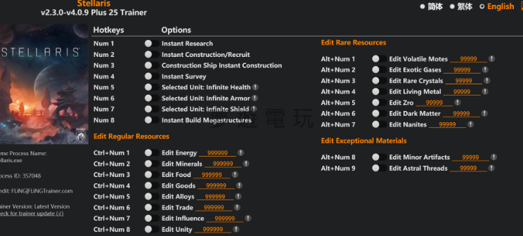 正文摘要:replyreload += ',' + 2387130; Stellaris 恆星戰役修改器介紹 《Stellaris 恆星戰役》是一款廣受好評的太空策略遊戲,而這款修改器將為您帶來更加豐富的遊戲體驗!本修改器適用於遊戲版本 2.3.0 至 v4.0.9+,最後更新時間為 2025.05.14,提供多達25種強大功能,讓您在浩瀚宇宙中無往不利。 Stellaris 修改器功能一覽 基本功能選項: - Num 1 – 即時研究完成 - Num 2 – 即時建造/招募 - Num 3 – 建設船即時建造 - Num 4 – 即時勘察 - Num 5 – 選中單位:無限生命值 - Num 6 – 選中單位:無限裝甲值 - Num 7 – 選中單位:無限護盾值 - Num 8 – 即時建造巨型結構 編輯常規資源: - Ctrl+Num 1 – 編輯能源點數 - Ctrl+Num 2 – 編輯礦物 - Ctrl+Num 3 – 編輯食物 - Ctrl+Num 4 – 編輯消費品 - Ctrl+Num 5 – 編輯合金 - Ctrl+Num 6 – 編輯貿易值 - Ctrl+Num 7 – 編輯影響力 - Ctrl+Num 8 – 編輯凝聚力 編輯稀有資源: - Alt+Num 1 – 編輯易變粒子 - Alt+Num 2 – 編輯異星氣體 - Alt+Num 3 – 編輯稀有晶體 - Alt+Num 4 – 編輯活性金屬 - Alt+Num 5 – 編輯佐羅物質 - Alt+Num 6 – 編輯暗物質 - Alt+Num 7 – 編輯奈米粒子 編輯特殊材料: - Alt+Num 8 – 編輯次要文物 - Alt+Num 9 – 編輯星際絲線 Stellaris 修改器下載方式 修改器檔案名稱:Stellaris v2.3.0-v4.0.9 Plus 25 Trainer.exe 下載連結: 所有站內附件皆會附上安全掃描報告請會員查看純淨度百分比後判斷使用(adsbygoogle = window.adsbygoogle || []).push({});相關檔案須知:取得檔案前,請先詳細閱讀文章內容避免不必要錯誤與誤會發生。也可多參考文章討論樓層內容了解附件檔案相關討論資訊。 【此文章部分內容隱藏中】 解除隱藏說明教學點擊下方 繼續閱讀文章 後請仔細觀看文章內容 並依照指示進行下一步最後完成解除隱藏後系統會回到此文章自動顯示隱藏內容~繼續閱讀 Stellaris 修改器使用教學 1. 下載修改器檔案後,請先確保您的遊戲版本在支援範圍內(2.3.0-v4.0.9+) 2. 關閉所有防毒軟體,因為修改器可能會被誤判為威脅 3. 先啟動遊戲,待遊戲完全載入後 4. 執行修改器程式 5. 使用對應的快捷鍵啟用您需要的功能 6. 享受解鎖後的遊戲體驗! Stellaris 修改器常見問題與解答 (FAQ) 問:這個修改器是否支援最新版本的《Stellaris 恆星戰役》? 答:是的,根據資料顯示,本修改器支援遊戲版本從2.3.0到v4.0.9+,並於2025.05.14更新。 問:使用修改器會不會導致遊戲存檔損壞? 答:建議在使用修改器前先備份您的遊戲存檔,以防萬一。一般來說,單機模式下使用較為安全。 問:為什麼我的防毒軟體會攔截修改器? 答:修改器通常會修改遊戲記憶體,因此可能被防毒軟體誤判為潛在威脅。使用時可暫時關閉防毒軟體或將修改器加入例外清單。 問:如何正確啟用資源編輯功能? 答:先在遊戲中打開資源介面,然後按下對應的快捷鍵組合(如Ctrl+Num 1編輯能源點數),接著在彈出的視窗中輸入您想要的數值。 問:修改器可以在多人遊戲中使用嗎? 答:不建議在多人遊戲中使用修改器,這可能會被視為作弊行為,並可能導致您被踢出遊戲或遭到封禁。 問:如果修改器與遊戲不相容該怎麼辦? 答:請確認您的遊戲版本是否在支援範圍內。如果遊戲有更新,可能需要等待修改器開發者發布相容的新版本。 👉 GM後台版 遊戲 推薦 ⬇️⬇️⬇️ 快速玩各種二次元動漫手遊appreplyreload += ',' + 2387130; |