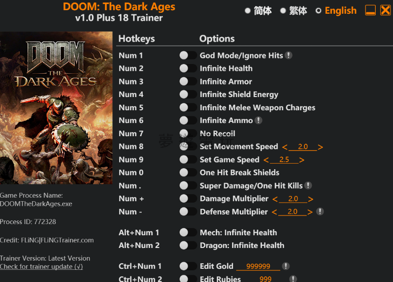 正文摘要:replyreload += ',' + 2387131; 《Doom: The Dark Ages》修改器介紹 《毀滅戰士:黑暗時代》(Doom: The Dark Ages) 修改器現已推出,提供18項強大功能,讓您在遊戲中擁有更多樂趣!此修改器完全免費下載,支援遊戲版本v1.0+,最後更新日期為2025年5月13日。 《Doom: The Dark Ages》修改器功能列表 基本功能 (數字鍵): - Num 1 – 無敵模式/無視傷害 - Num 2 – 無限生命值 - Num 3 – 無限護甲 - Num 4 – 無限護盾能量 - Num 5 – 無限近戰武器充能 - Num 6 – 無限彈藥 - Num 7 – 無後座力 - Num 8 – 設定移動速度 - Num 9 – 設定遊戲速度 - Num 0 – 一擊破盾 - Num . – 超級傷害/一擊必殺 - Num + – 傷害倍率調整 - Num - – 防禦倍率調整 特殊載具功能 (Alt+數字鍵): - Alt+Num 1 – 機甲:無限生命值 - Alt+Num 2 – 龍:無限生命值 資源修改 (Ctrl+數字鍵): - Ctrl+Num 1 – 修改金幣數量 - Ctrl+Num 2 – 修改紅寶石數量 - Ctrl+Num 3 – 修改幽靈石數量 《Doom: The Dark Ages》修改器下載方式 要使用這款功能強大的《毀滅戰士:黑暗時代》修改器,只需點擊下方連結即可免費下載完整版: 下載連結: 所有站內附件皆會附上安全掃描報告請會員查看純淨度百分比後判斷使用(adsbygoogle = window.adsbygoogle || []).push({});相關檔案須知:取得檔案前,請先詳細閱讀文章內容避免不必要錯誤與誤會發生。也可多參考文章討論樓層內容了解附件檔案相關討論資訊。 【此文章部分內容隱藏中】 解除隱藏說明教學點擊下方 繼續閱讀文章 後請仔細觀看文章內容 並依照指示進行下一步最後完成解除隱藏後系統會回到此文章自動顯示隱藏內容~繼續閱讀 《Doom: The Dark Ages》修改器使用教學 1. 下載修改器檔案 2. 在執行遊戲前先開啟修改器 3. 進入遊戲後,使用對應的按鍵組合啟動您需要的功能 4. 享受遊戲中的各種解鎖功能! 常見問題與解答 (FAQ) 問:這個修改器是否適用於所有版本的《Doom: The Dark Ages》? 答:根據說明,此修改器支援v1.0+版本,但最佳相容性為2025年5月13日更新的版本。 問:使用修改器會導致遊戲帳號被封嗎? 答:建議只在單人模式中使用此修改器,在多人遊戲或線上模式中使用可能會導致帳號受到處罰。 問:為什麼我的防毒軟體會警告此檔案? 答:修改器程式通常會被防毒軟體誤判為潛在威脅,因為它們需要修改遊戲記憶體。您可以將檔案加入防毒軟體的例外清單。 問:如何同時啟用多個修改功能? 答:您可以同時按下不同的按鍵組合來啟用多個功能,例如同時使用無限生命和無限彈藥。 問:如果修改器無法正常運作該怎麼辦? 答:請確認您是以管理員身分執行修改器,並且遊戲版本與修改器相容。如果仍有問題,可能需要等待更新版本的修改器。 問:資源修改功能如何使用? 答:按下對應的Ctrl+數字鍵組合後,會彈出一個輸入框,您可以在其中輸入想要的資源數量。 👉 GM後台版 遊戲 推薦 ⬇️⬇️⬇️ 快速玩各種二次元動漫手遊appreplyreload += ',' + 2387131; |