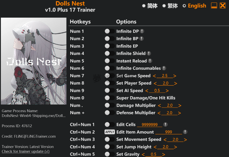 正文摘要:replyreload += ',' + 2387132; Dolls Nest 修改器介紹 這是一款針對《Dolls Nest》遊戲的強大修改工具,提供多達17種功能選項,讓您的遊戲體驗更加豐富多彩。最新版本支援遊戲v1.0+,並於2025年5月12日更新。這款修改器由風靈月影團隊開發,完全免費提供下載。 Dolls Nest 修改器功能列表 基本功能快捷鍵: • Num 1 – 無限 DP • Num 2 – 無限 BP • Num 3 – 無限 EP • Num 4 – 無限護盾 • Num 5 – 即時重新裝填 • Num 6 – 無限消耗品 • Num 7 – 設定遊戲速度 • Num 8 – 設定玩家速度 • Num 9 – 設定 AI 速度 • Num 0 – 超級傷害/一擊必殺 • Num . – 傷害倍數調整 • Num + – 防禦倍數調整 進階功能快捷鍵: • Ctrl+Num 1 – 編輯細胞數量 • Ctrl+Num 2 – 編輯物品數量 • Ctrl+Num 3 – 設定移動速度 • Ctrl+Num 4 – 設定跳躍高度 • Ctrl+Num 5 – 設定重力參數 Dolls Nest 修改器下載與安裝教學 1. 點擊下方的下載連結,獲取最新版「Dolls Nest v1.0 Plus 17 Trainer.exe」修改器 2. 下載完成後,將檔案解壓縮到您選擇的資料夾 3. 先啟動《Dolls Nest》遊戲 4. 再運行修改器程式 5. 使用上述快捷鍵啟用您需要的功能 下載連結: 所有站內附件皆會附上安全掃描報告請會員查看純淨度百分比後判斷使用(adsbygoogle = window.adsbygoogle || []).push({});相關檔案須知:取得檔案前,請先詳細閱讀文章內容避免不必要錯誤與誤會發生。也可多參考文章討論樓層內容了解附件檔案相關討論資訊。 【此文章部分內容隱藏中】 解除隱藏說明教學點擊下方 繼續閱讀文章 後請仔細觀看文章內容 並依照指示進行下一步最後完成解除隱藏後系統會回到此文章自動顯示隱藏內容~繼續閱讀 Dolls Nest 修改器使用注意事項 • 使用修改器前請確保已關閉所有防毒軟體,以避免誤判 • 建議在單人模式中使用此修改器,避免在多人遊戲中使用可能導致帳號被封禁 • 某些功能可能需要管理員權限才能正常運作 • 如遇到遊戲版本更新,可能需要等待修改器更新以支援新版本 常見問題與解答 (FAQ) 問:這個修改器會影響我的遊戲存檔嗎? 答:一般情況下不會,但建議在使用前先備份您的遊戲存檔,以防萬一。 問:為什麼我啟動修改器後沒有反應? 答:請確保您先啟動遊戲,再啟動修改器。同時,嘗試以管理員身份運行修改器。 問:修改器與最新版本的遊戲相容嗎? 答:此修改器支援v1.0+版本,如果遊戲有重大更新,可能需要等待修改器更新。 問:使用修改器會被遊戲開發商檢測到嗎? 答:單人遊戲模式下使用一般不會有問題,但多人遊戲中使用有被檢測的風險。 問:如何關閉已啟用的功能? 答:再次按下相同的快捷鍵即可關閉該功能。 問:為什麼某些功能在我的遊戲中無效? 答:可能是遊戲版本不相容,或該功能需要特定條件才能生效。請嘗試重新啟動遊戲和修改器。 👉 GM後台版 遊戲 推薦 ⬇️⬇️⬇️ 快速玩各種二次元動漫手遊appreplyreload += ',' + 2387132; |