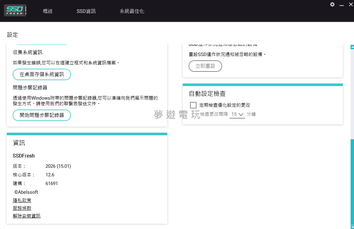 正文摘要:版本:v15.01.61691 更新日期:2024年05月19日 固態硬碟優化工具 Abelssoft SSD Fresh Plus 2026 功能深入整理 SSD Fresh Plus 是一款專為優化固態硬碟(SSD)而設計的強大工具,其主要目標是有效延長 SSD 的使用壽命並顯著提升其運行效能。這款軟體專精於管理與調整 Windows 系統中與 SSD 相關的各項設定,確保您的固態硬碟能以最佳狀態運作。 主要功能特色 SSD 狀態監控(SMART) 透過讀取 SMART 資料,SSD Fresh Plus 能精確顯示您的 SSD 健康狀態,並提供壽命使用預估,讓您隨時掌握硬碟的狀況。 下載鏈接 Free Download: Abelssoft SSD Fresh Plus 2026 下載 https://katfile.com/j0hyafcoua43 免責聲明與使用提示 - 本人所分享之軟體,皆為網上搜集轉載而來,連結僅供網友學習交流用途,本人不承擔任何技術及版權相關責任。 - 若您喜歡此軟體,請於試用後24小時內刪除,請勿作為商業用途,否則您將自行承擔所有法律責任! - 部分註冊機或補丁可能因其特殊性而被防毒軟體誤判為病毒,請使用者審慎評估風險後再決定是否執行。 - 如本頁內容有任何不妥之處,或侵犯了您的合法權益,煩請留言告知以便刪除相關內容。 - 請大家低調使用,切勿對外散佈。強烈建議支持原版軟體、尊重著作權,並遵守相關法律條約,請購買正版,謝謝! - 所有提供的破解版軟體,防毒軟體皆可能出現報毒情況,使用風險請自行承擔。 👉 GM後台版 遊戲 推薦 ⬇️⬇️⬇️ 快速玩各種二次元動漫手遊app |
