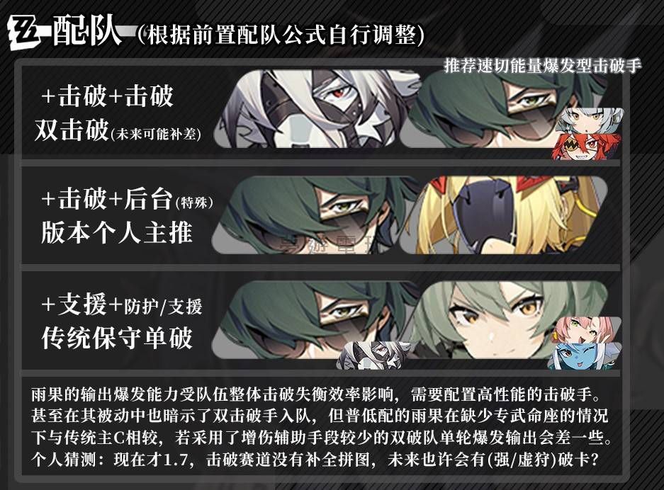正文摘要:雨果配隊推薦 在《絕區零》這款遊戲裡,如果你的主輸出角色是雨果,那麼他在組隊上會需要一些輔助角色的支援。如果你還不曉得要怎麼幫雨果選隊友的話,可以參考接下來的組隊建議喔! 👉 GM後台版 遊戲 推薦 ⬇️⬇️⬇️ 快速玩各種二次元動漫手遊app 《絕區零》雨果_常見問題Q&A - 問:雨果的主要定位是什麼? 答:雨果在隊伍中主要扮演輸出角色。 - 問:幫雨果配隊時,需要注意什麼? 答:需要搭配能提供支援的輔助角色。 - 問:這篇文章的配隊建議是針對哪個角色? 答:是針對雨果這個角色。 以下廣告滑動後還有帖子內容var custom_call_MIR = function (params) {if ( params === null || params.hasAd === false ) {var divRowSide;for (let index = 0; index < ONEADs.length; index++) {if (ONEADs[index].pub.player_mode === "mobile-inread") {divRowSide = ONEADs[index].pub.slotobj;}}var ins = document.createElement('ins');ins.className = 'clickforceads';ins.setAttribute('style', 'display:inline-block;');ins.setAttribute('data-ad-zone', '18264');divRowSide.appendChild(ins);var js = document.createElement('script');js.async = true;js.type = 'text/javascript';js.setAttribute('src', '//cdn.holmesmind.com/js/init.js');js.onload = function(){console.log('[ONEAD MIR] ClickForce Loaded');};divRowSide.appendChild(js);}};var _ONEAD = {};_ONEAD.pub = {};_ONEAD.pub.slotobj = document.getElementById("oneadMIRDFPTag");_ONEAD.pub.slots = ["div-onead-ad"];_ONEAD.pub.uid = "1000509";_ONEAD.pub.external_url = "https://onead.onevision.com.tw/";_ONEAD.pub.scopes = ["spotbuy", "speed"];_ONEAD.pub.player_mode_div = "div-onead-ad";_ONEAD.pub.player_mode = "mobile-inread";_ONEAD.pub.queryAdCallback = custom_call_MIR;var ONEAD_pubs = ONEAD_pubs || [];ONEAD_pubs.push(_ONEAD);var truvidScript = document.createElement('script'); truvidScript.async = true; truvidScript.setAttribute('data-cfasync','false'); truvidScript.type = 'text/javascript'; truvidScript.src = '//stg.truvidplayer.com/index.php?sub_user_id=597&widget_id=3309&playlist_id=2381&m=a&cb=' + (Math.random() * 10000000000000000); var currentScript = document.currentScript || document.scripts[document.scripts.length - 1]; currentScript.parentNode.insertBefore(truvidScript, currentScript.nextSibling); |