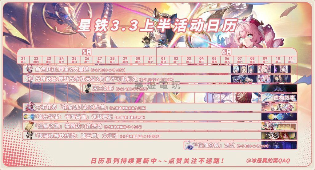 各位開拓者們,《崩壞:星穹鐵道》3.3版本即將強勢推出,想知道這次有哪些超值活動、全新的五星角色、以及滿滿的星瓊獎勵等著你嗎?別擔心,這篇攻略將帶你一次看懂3.3版本的精彩內容,讓你不再錯過任何一個提升戰力