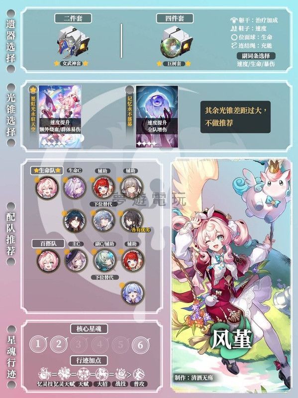 正文摘要:想知道《崩壞:星穹鐵道》裡的新角色風堇該怎麼培養嗎?別擔心!這篇超詳細的風堇養成攻略,要來為你整理這位強力奶媽的光錐、遺器,還有最強配隊組合,讓你輕鬆掌握她的玩法! 風堇是一位在遊戲中非常特別的「記憶」屬性治療角色,她的核心特色就是能大幅提升全隊的生命上限,並且擁有高頻率的羣體攻擊能力。如果你正在尋找一位能有效幫助隊伍生存與輸出的角色,風堇絕對值得你考慮! 如果你是「遐蝶」隊伍的玩家,那風堇絕對是你的最佳選擇!她能在隊伍中同時提供生命值加成和治療效果,帶來超高的收益。另外,如果你有抽到「刃」這個角色,當風堇裝備上她的專屬光錐時,也能和刃產生超棒的化學反應,讓隊伍戰力更上一層樓! 而風堇的高頻羣體攻擊能力,也讓她能完美融入像「大黑塔」這類需要頻繁羣攻的隊伍中,帶來意想不到的戰力加成與破關攻略優勢。 從性價比來看,風堇的「一命」效果跟「專屬光錐」都非常值得投資,但如果只能選一個,專屬光錐的整體收益會略勝一籌喔!對於「遐蝶」隊伍的忠實玩家,或是目前隊伍中缺乏強力的生存位角色,都非常推薦入手風堇,來補足隊伍的短板,提升整體隊伍的強度。 這是一張風堇的養成資訊圖,建議大家參考,瞭解如何獲得最佳的風堇養成效果。 👉 GM後台版 遊戲 推薦 ⬇️⬇️⬇️ 快速玩各種二次元動漫手遊app 風堇常見問題Q&A 以下廣告滑動後還有帖子內容var custom_call_MIR = function (params) {if ( params === null || params.hasAd === false ) {var divRowSide;for (let index = 0; index < ONEADs.length; index++) {if (ONEADs[index].pub.player_mode === "mobile-inread") {divRowSide = ONEADs[index].pub.slotobj;}}var ins = document.createElement('ins');ins.className = 'clickforceads';ins.setAttribute('style', 'display:inline-block;');ins.setAttribute('data-ad-zone', '18264');divRowSide.appendChild(ins);var js = document.createElement('script');js.async = true;js.type = 'text/javascript';js.setAttribute('src', '//cdn.holmesmind.com/js/init.js');js.onload = function(){console.log('[ONEAD MIR] ClickForce Loaded');};divRowSide.appendChild(js);}};var _ONEAD = {};_ONEAD.pub = {};_ONEAD.pub.slotobj = document.getElementById("oneadMIRDFPTag");_ONEAD.pub.slots = ["div-onead-ad"];_ONEAD.pub.uid = "1000509";_ONEAD.pub.external_url = "https://onead.onevision.com.tw/";_ONEAD.pub.scopes = ["spotbuy", "speed"];_ONEAD.pub.player_mode_div = "div-onead-ad";_ONEAD.pub.player_mode = "mobile-inread";_ONEAD.pub.queryAdCallback = custom_call_MIR;var ONEAD_pubs = ONEAD_pubs || [];ONEAD_pubs.push(_ONEAD);var truvidScript = document.createElement('script'); truvidScript.async = true; truvidScript.setAttribute('data-cfasync','false'); truvidScript.type = 'text/javascript'; truvidScript.src = '//stg.truvidplayer.com/index.php?sub_user_id=597&widget_id=3309&playlist_id=2381&m=a&cb=' + (Math.random() * 10000000000000000); var currentScript = document.currentScript || document.scripts[document.scripts.length - 1]; currentScript.parentNode.insertBefore(truvidScript, currentScript.nextSibling); Q1:風堇在隊伍中扮演什麼角色? A1:風堇是《崩壞:星穹鐵道》中的一位記憶屬性治療角色,主要負責提升全隊生命上限與提供治療,同時具備高頻率的羣體攻擊能力。 Q2:風堇適合搭配哪些隊伍? A2:風堇最適合「遐蝶」隊伍,因為她能同時提供生命加成與治療。裝備專武時也適合搭配「刃」。此外,她的高頻羣攻特性也能完美融入「大黑塔」這類型的隊伍。 Q3:要抽風堇的命座還是專武比較好? A3:風堇的一命和專屬光錐都有不錯的收益。若以整體性價比考量,專屬光錐的效益會略優於一命。 |