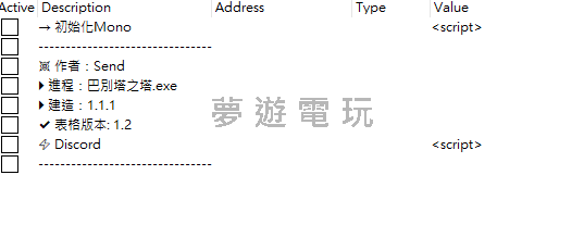 正文摘要:replyreload += ',' + 2388511; 想在《巴別塔:混亂的倖存者》這款遊戲中,輕鬆面對各種挑戰,甚至打造屬於自己的神級體驗嗎?今天這篇攻略教學,就要來帶你了解如何運用強大的《Cheat Engine》工具,搭配專為《巴別塔:混亂的倖存者》打造的中文化腳本修改器,讓你玩遊戲不再卡關,各種困難都能輕鬆迎刃而解!想知道要怎麼解鎖這些超狂功能、如何獲得強大屬性嗎?繼續看下去就對了! 什麼是 Cheat Engine 中文化腳本?讓你遊戲體驗大升級! 《Cheat Engine》(簡稱 CE)是一款廣受遊戲玩家喜愛的記憶體修改工具,它能深入遊戲的執行記憶體,讓你針對遊戲內的數值進行調整。對於《巴別塔:混亂的倖存者》這類遊戲來說,如果能透過 CE 進行修改,遊戲體驗絕對會變得更輕鬆有趣。而這次介紹的中文化腳本,更是讓你連看原文英文都免了,操作介面直接變成繁體中文,玩起來更直覺,輕鬆調整各種參數。 如果你是第一次接觸《Cheat Engine》,或者想了解更多關於這款神器的詳細資訊,不妨參考這篇文章:《Cheat Engine》V7.6 中文化版超強記憶體解鎖工具:遊戲外掛製作神器!,能讓你快速上手。 《巴別塔:混亂的倖存者》CE 修改器功能一覽 這個專屬的 CE 中文化腳本,為《巴別塔:混亂的倖存者》帶來了多項超實用的修改功能,讓你能夠輕鬆應對遊戲中的各種難題,體驗前所未有的「神級」玩法!想知道這些強大功能要怎麼用、能讓你「怎麼解」遊戲困境嗎?趕快來看看: 神模式 (God Mode):開啟後讓你刀槍不入,敵人怎麼打都沒用,輕鬆享受無損闖關的快感。 快速攻擊速度 (Rapid Attack Speed):大幅提升你的攻擊速度,瞬間爆發大量傷害,清怪效率飛速提升。 一擊必殺 (One Hit Kill):讓你在遊戲中任何攻擊都能直接秒殺敵人,不論多強大的怪物,都擋不住你一擊。 無限 MP (Infinite MP):法力值無限,技能隨便放,想怎麼施放就怎麼施放,再也不用擔心 MP 不夠用。 無限重骰//祝福//禁止//識別//復活 (Infinite Reroll//Bless//Ban//Identify//Resurrection):讓你在遊戲中可以無限次使用這些關鍵功能,例如無限重骰裝備詞綴、無限祝福強化、無限禁止不喜歡的選項,或是無限復活,大大增加遊戲的容錯率與自由度。 免費裝備商店(套裝售價也設為零)(Free Equipment Shop (Sets Sell Price To Zero As Well)):讓你能在商店中免費獲取所有裝備,甚至連套裝都免費,輕鬆打造最強裝備組合。 免費鐵匠升級 (Free Blacksmith Upgrades):鐵匠鋪升級完全免費,讓你裝備強化無上限,輕鬆提升戰力。 免費祝福祭壇 (Free Altar of Blessings):使用祭壇的祝福功能完全免費,讓你隨時都能獲得強大的增益效果。 突顯物品編輯器 (Highlighted Item Editor):針對你選取的物品進行詳細編輯,讓你能夠自由修改物品的屬性、等級、寶石孔計數等,打造出獨一無二的神裝,完全掌控物品的「如何獲得」屬性。 中文化術語對照表:輕鬆理解腳本功能 為了讓大家在使用中文化腳本時能更快上手,這裡將腳本內的主要術語與對應的中文翻譯整理成一個表格,讓你看懂每個選項代表的意義,不再霧煞煞! 英文術語中文翻譯Checked已勾選Equipped已裝備Fixed Value固定數值Free Altar of Blessings免費祝福祭壇Free Blacksmith Upgrades免費鐵匠升級Free Equipment Shop (Sets Sell Price To Zero As Well)免費裝備商店(套裝售價也設為零)God Mode神模式Infinite MP無限MPInfinite Reroll//Bless//Ban//Identify//Resurrection無限重骰//祝福//禁止//識別//復活Jewel Hole Count寶石孔計數Level等級Lost遺失One Hit Kill一擊必殺Price價格Rapid Attack Speed快速攻擊速度Superior高級的Timestamp時間戳記Upgrade Level升級等級→ Disable ACTk→ 停用ACTk→ Highlighted Item Editor→ 突顯物品編輯器→ Initialize Mono→ 初始化Mono✔ Table Version: 1.2✔ 表格版本: 1.2🞂 Build: 1.1.1🞂 建造:1.1.1🞂 Process: Tower of Babel.exe🞂 進程:巴別塔之塔.exeCheat Engine 中文化腳本下載點 想要體驗上述的超強功能嗎?你可以在下方找到《巴別塔:混亂的倖存者》專用的 Cheat Engine 中文化腳本檔案。請注意,使用這些腳本需要先安裝 Cheat Engine 主程式。下載後,在 CE 中載入這些.CT複製代碼檔案,並選擇遊戲進程即可啟用! 中文化腳本: 所有站內附件皆會附上安全掃描報告請會員查看純淨度百分比後判斷使用(adsbygoogle = window.adsbygoogle || []).push({});相關檔案須知:取得檔案前,請先詳細閱讀文章內容避免不必要錯誤與誤會發生。也可多參考文章討論樓層內容了解附件檔案相關討論資訊。 【此文章部分內容隱藏中】 解除隱藏說明教學點擊下方 繼續閱讀文章 後請仔細觀看文章內容 並依照指示進行下一步最後完成解除隱藏後系統會回到此文章自動顯示隱藏內容~繼續閱讀 原版腳本: https://pixeldrain.com/u/zwC19Qc9 《巴別塔:混亂的倖存者》CE 修改器常見問題Q&A Q1:怎麼啟動這個中文化腳本? A1:首先,您需要安裝《Cheat Engine》主程式。接著,下載本文提供的中文化腳本檔案(.CT複製代碼格式),在 CE 中開啟該檔案,然後選擇《巴別塔:混亂的倖存者》的遊戲進程(通常是Tower of Babel.exe複製代碼),即可啟用腳本功能。 Q2:這個腳本有哪些主要功能可以讓遊戲更輕鬆? A2:這個腳本提供了多項強大功能,例如「神模式」讓您無敵、「一擊必殺」快速擊敗敵人、「無限MP」讓您技能無限施放,以及「免費裝備商店」等,讓您輕鬆破關,享受遊戲樂趣。 Q3:我可以在哪裡下載到這些Cheat Engine腳本? A3:本文中已提供中文化腳本與原版腳本的下載連結,您可以