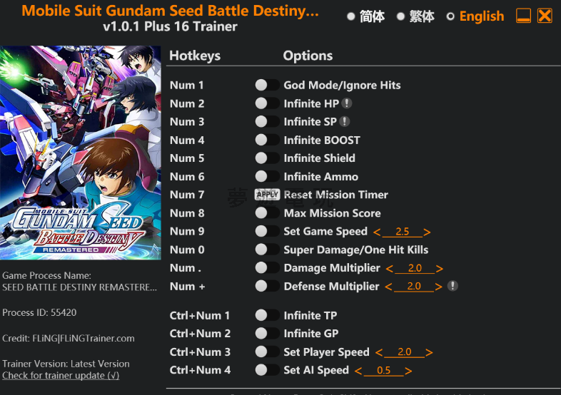 正文摘要:replyreload += ',' + 2389545; 想要在《機動戰士GUNDAM SEED:戰鬥命運》中體驗更爽快的戰鬥嗎?這款由風靈月影製作的修改器絕對是你的最佳選擇!支援最新版本v1.0.1+,提供多達16種強大功能,讓你在駕駛鋼彈時能夠盡情享受戰鬥的快感。 👉 GM後台版 遊戲 推薦 ⬇️⬇️⬇️ 快速玩各種二次元動漫手遊app 修改器功能詳細介紹 這款修改器提供了豐富的功能選項,讓玩家可以根據自己的需求來調整遊戲體驗。以下是完整的功能列表: 基礎戰鬥功能 Num 1 – 無敵模式/忽略攻擊 開啟後你的機體將不會受到任何傷害,可以放心地衝鋒陷陣。 Num 2 – 無限血量 血量永遠保持滿格,再也不用擔心被擊墜。 Num 3 – 無限SP值 特殊技能可以無限使用,盡情釋放你的必殺技。 Num 4 – 無限推進器 BOOST能量永不耗盡,想飛多久就飛多久。 Num 5 – 無限護盾 護盾永遠不會破損,提供最強防護。 Num 6 – 無限彈藥 所有武器彈藥無限,火力全開轟炸敵人。 任務相關功能 Num 7 – 重置任務計時器 可以重新設定任務時間,不用擔心時間不夠。 Num 8 – 最大任務分數 直接獲得滿分評價,輕鬆完成所有挑戰。 遊戲體驗調整 Num 9 – 設定遊戲速度 可以加快或放慢遊戲節奏,適合不同的遊戲風格。 Num 0 – 超級傷害/一擊必殺 攻擊力大幅提升,敵人一碰就倒。 Num . – 傷害倍數調整 自由調整攻擊傷害的倍率。 Num + – 防禦倍數調整 調整防禦力的倍率,打造最適合的戰鬥體驗。 進階功能 Ctrl+Num 1 – 無限TP TP點數永遠用不完。 Ctrl+Num 2 – 無限GP 遊戲幣無限,想買什麼就買什麼。 Ctrl+Num 3 – 設定玩家速度 調整自己機體的移動速度。 Ctrl+Num 4 – 設定AI速度 調整敵方AI的行動速度,增加或降低遊戲難度。 修改器下載與安裝教學 下載連結 修改器檔案:Mobile Suit Gundam Seed Battle Destiny Remastered v1.0.1 Plus 16 Trainer.exe 下載點: 所有站內附件皆會附上安全掃描報告請會員查看純淨度百分比後判斷使用(adsbygoogle = window.adsbygoogle || []).push({});相關檔案須知:取得檔案前,請先詳細閱讀文章內容避免不必要錯誤與誤會發生。也可多參考文章討論樓層內容了解附件檔案相關討論資訊。 【此文章部分內容隱藏中】 解除隱藏說明教學點擊下方 繼續閱讀文章 後請仔細觀看文章內容 並依照指示進行下一步最後完成解除隱藏後系統會回到此文章自動顯示隱藏內容~繼續閱讀 安裝步驟 1. 點擊上方下載連結,下載修改器檔案 2. 將下載的檔案解壓縮到任意資料夾 3. 確保遊戲已經安裝並可以正常執行 4. 先啟動遊戲,進入主選單或開始遊戲 5. 切換到修改器,以系統管理員身分執行 6. 當修改器顯示「遊戲已偵測」時,即可開始使用各項功能 使用注意事項 - 建議在使用修改器前先備份存檔 - 部分防毒軟體可能會誤報,請加入白名單 - 修改器僅支援遊戲版本v1.0.1+ - 使用時請確保遊戲在前景執行 機動戰士GUNDAM SEED戰鬥命運修改器常見問題Q&A Q1:修改器無法啟動怎麼辦? A:請確認是否以系統管理員身分執行,並檢查防毒軟體是否阻擋了檔案。 Q2:功能按鍵沒有反應? A:請確保遊戲在前景執行,並且遊戲版本為v1.0.1+。部分功能需要在戰鬥中才能使用。 Q3:使用修改器會影響存檔嗎? A:建議使用前先備份存檔,雖然修改器通常不會損壞存檔,但為了安全起見還是要備份。 Q4:可以在線上模式使用嗎? A:不建議在線上模式使用修改器,可能會導致帳號被封鎖。 Q5:修改器支援其他版本的遊戲嗎? A:此修改器專為v1.0.1+版本設計,其他版本可能無法正常使用。 replyreload += ',' + 2389545; |
