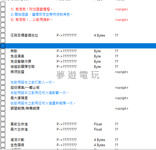 正文摘要:replyreload += ',' + 2389555; 👉 GM後台版 遊戲 推薦 ⬇️⬇️⬇️ 快速玩各種二次元動漫手遊app Bloodshed CE 修改器功能介紹 這個 CE 修改器是專為 Bloodshed Steam v1.0.4 build 255 SKIDROW 版本製作的強大工具。修改器提供了豐富的功能,讓玩家能夠更輕鬆地享受遊戲體驗。 修改器新增了生存時間指針以及 Banisher、Holder 和獎勵任務收集品(紅色星星)指針,讓玩家能夠更精確地控制遊戲進度。 CE 中文化工具下載 想要使用這個修改器,你需要先安裝 Cheat Engine。推薦使用 V7.6 中文化版本,這是一款超強的記憶體解鎖工具,被譽為遊戲外掛製作神器! 《Cheat Engine》V7.6 中文化版超強記憶體解鎖工具:遊戲外掛製作神器! https://www.game735.com/thread-416920-1-1.html 修改器檔案下載 Bloodshed 修改器檔案下載連結: 所有站內附件皆會附上安全掃描報告請會員查看純淨度百分比後判斷使用(adsbygoogle = window.adsbygoogle || []).push({});相關檔案須知:取得檔案前,請先詳細閱讀文章內容避免不必要錯誤與誤會發生。也可多參考文章討論樓層內容了解附件檔案相關討論資訊。 【此文章部分內容隱藏中】 解除隱藏說明教學點擊下方 繼續閱讀文章 後請仔細觀看文章內容 並依照指示進行下一步最後完成解除隱藏後系統會回到此文章自動顯示隱藏內容~繼續閱讀 檔案名稱:Bloodshed-v1.1_ZH.CT 修改器使用教學 基本操作步驟 激活修改器:首先激活修改器並附加到遊戲進程 開始遊戲:啟動遊戲,選擇存檔並等待控制角色 啟用指針:激活修改器以啟用所有指針功能 特殊功能使用注意事項 超級傷害功能:在啟用腳本之前需要先用任何火槍攻擊敵人一次 瞬間裝彈功能:在啟用腳本之前需要先用任何火槍重新裝彈一次 快捷鍵操作:按 F2 可以切換緊湊模式和完整視圖模式 修改器功能詳細說明 戰鬥相關功能 - 超級傷害/一擊必殺 - 最大準確度 - 瞬間裝彈/無需裝彈 - 無敵模式 - 免疫傷害 - 免疫智慧炸彈 - 被追蹤導彈忽略 移動系統功能 - 無限跳躍 - 移動速度調整 - 奔跑速度調整 - 翻滾速度調整 - 玩家重力調整 - 跳躍力量調整 遊戲數值功能 - 金錢/寶石修改 - 經驗值調整 - 等級修改 - 生命值調整 - 復活次數修改 - 擊殺數統計 收集品功能 - 金色頭骨 - 紅色星星收集 - Banisher 收集品 - Holder 收集品 修改器中文化對照表 為了方便遊戲玩家使用,以下是主要功能的中英文對照: 英文功能名稱中文翻譯Super damage / One Hit Kill超級傷害/一擊必殺Instant reload / No reload瞬間裝彈/無需裝彈Unlimited Jump無限跳躍Money / Gems金錢/寶石Experience經驗值Golden Skulls金色頭骨Red stars紅色星星Survival Objective生存目標以下廣告滑動後還有帖子內容var custom_call_MIR = function (params) {if ( params === null || params.hasAd === false ) {var divRowSide;for (let index = 0; index < ONEADs.length; index++) {if (ONEADs[index].pub.player_mode === "mobile-inread") {divRowSide = ONEADs[index].pub.slotobj;}}var ins = document.createElement('ins');ins.className = 'clickforceads';ins.setAttribute('style', 'display:inline-block;');ins.setAttribute('data-ad-zone', '18264');divRowSide.appendChild(ins);var js = document.createElement('script');js.async = true;js.type = 'text/javascript';js.setAttribute('src', '//cdn.holmesmind.com/js/init.js');js.onload = function(){console.log('[ONEAD MIR] ClickForce Loaded');};divRowSide.appendChild(js);}};var _ONEAD = {};_ONEAD.pub = {};_ONEAD.pub.slotobj = document.getElementById("oneadMIRDFPTag");_ONEAD.pub.slots = ["div-onead-ad"];_ONEAD.pub.uid = "1000509";_ONEAD.pub.external_url = "https://onead.onevision.com.tw/";_ONEAD.pub.scopes = ["spotbuy", "speed"];_ONEAD.pub.player_mode_div = "div-onead-ad";_ONEAD.pub.player_mode = "mobile-inread";_ONEAD.pub.queryAdCallback = custom_call_MIR;var ONEAD_pubs = ONEAD_pubs || [];ONEAD_pubs.push(_ONEAD);var truvidScript = document.createElement('script'); truvidScript.async = true; truvidScript.setAttribute('data-cfasync','false'); truvidScript.type = 'text/javascript'; truvidScript.src = '//stg.truvidplayer.com/index.php?sub_user_id=597&widget_id=3309&playlist_id=2381&m=a&cb=' + (Math.random() * 10000000000000000); var currentScript = document.currentScript || document.scripts[document.scripts.length - 1]; currentScript.parentNode.insertBefore(truvidScript, currentScript.nextSibling); Bloodshed 修改器常見問題Q&A Q1:修改器無法啟動怎麼辦? A:請確認你已經正確安裝 Cheat Engine V7.6 中文化版本,並且遊戲版本為 Steam v1.0.4 build 255。 Q2:為什麼超級傷害功能沒有效果? A:在啟用超級傷害腳本之前,你需要先用任何火槍攻擊敵人一次,這樣修改器才能正確識別傷害數值。 Q3:瞬間裝彈功能如何正確使用? A:在啟用瞬間裝彈腳本之前,請先用任何火槍重新裝彈一次,讓修改器能夠定位到正確的記憶體位置。 Q4:修改器會影響遊戲存檔嗎? A:這個修改器主要修改記憶體數值,通常不會對存檔造成永久性影響,但建議使用前先備份存檔。 Q5:如何切換修改器的顯示模式? A:按下 F2 鍵可以在緊湊模式和完整視圖模式之間切換,方便不同使用習慣的玩家。 replyreload += ',' + 2389555; |