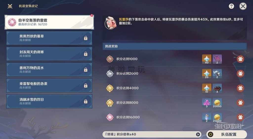 《原神》機謀變策戰記第一天瓦雷莎挑戰攻略懶人包 親愛的旅行者們,《原神》5.6版本推出了全新的「機謀變策戰記」限時主題挑戰!如果你正在為第一天「瓦雷莎」的關卡組隊感到困惑,這篇懶人包攻略絕對能幫你快速搞
