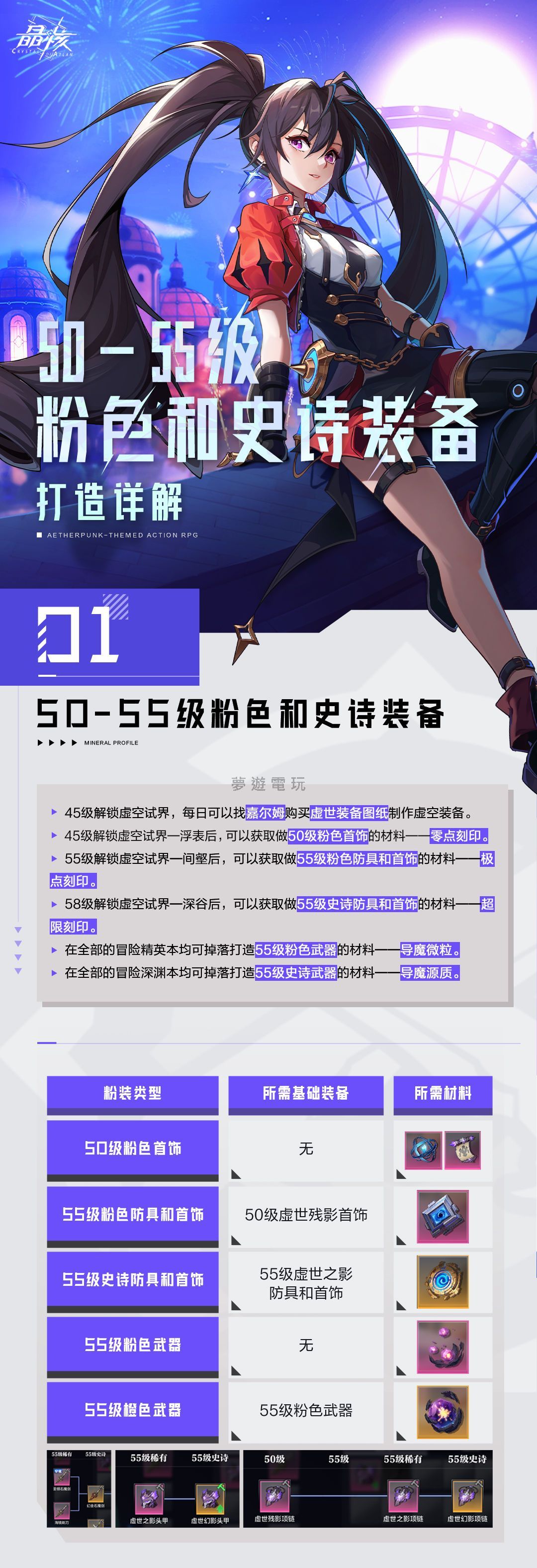 《晶核》50-55級進階裝備製作指南:提升戰力、輕鬆過渡! 各位冒險者們,隨著你們在《晶核》世界中的等級持續提升,是不是覺得手上的過渡期裝備漸漸跟不上腳步了呢?別擔心!今天這篇攻略懶人包,就是要來幫助大家