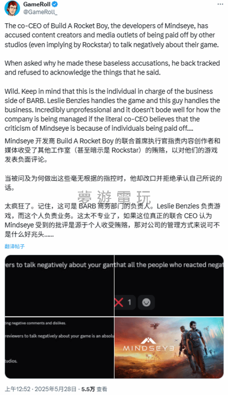 遊戲界近來上演一齣高潮迭起的羅生門!由前《GTA》系列核心製作人打造的第三人稱敘事新作《心之眼》(MindsEye),在發售前夕竟爆出災難性Bug連環爆,引發社群一片負評。然而,更令人咋舌的是,遊戲聯合CEO Mark Ger