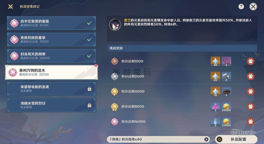 《原神》機謀變策戰記第四天「夜蘭」隊伍搭配懶人包:輕鬆拿滿獎勵! 各位旅行者大家好!《原神》5.6版本推出的「機謀變策戰記」主題戰鬥挑戰,相信許多玩家都在積極挑戰中吧?這次活動來到第四天,核心主題角色就