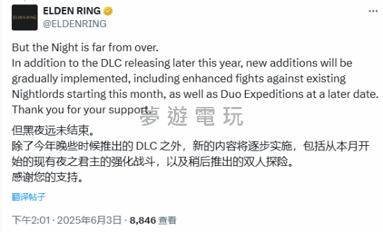 《艾爾登法環》作為 FromSoftware 旗下魂系大作的代表性作品,其衍生擴展內容《艾爾登法環:黑夜君臨》自推出以來便備受玩家社群矚目。近期,官方團隊再度為廣大褪色者們投下震撼彈,不僅證實了未來將有備受期待的雙