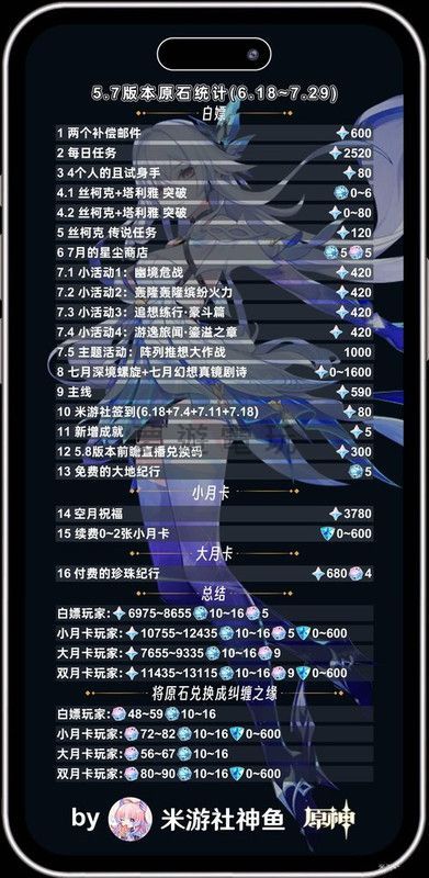 正文摘要:《原神》的5.7版本預計在六月十八日正式登場,想必不少玩家都很好奇,究竟在5.7版本中能累積到多少原石,以及能為自己的角色抽卡計畫帶來多少幫助。 以下將為各位旅行者們整理《原神》5.7版本的原石總量預估,希望能幫助大家掌握資源、妥善規劃未來的抽取方向。 👉 GM後台版 遊戲 推薦 ⬇️⬇️⬇️ 快速玩各種二次元動漫手遊app 以下廣告滑動後還有帖子內容var custom_call_MIR = function (params) {if ( params === null || params.hasAd === false ) {var divRowSide;for (let index = 0; index < ONEADs.length; index++) {if (ONEADs[index].pub.player_mode === "mobile-inread") {divRowSide = ONEADs[index].pub.slotobj;}}var ins = document.createElement('ins');ins.className = 'clickforceads';ins.setAttribute('style', 'display:inline-block;');ins.setAttribute('data-ad-zone', '18264');divRowSide.appendChild(ins);var js = document.createElement('script');js.async = true;js.type = 'text/javascript';js.setAttribute('src', '//cdn.holmesmind.com/js/init.js');js.onload = function(){console.log('[ONEAD MIR] ClickForce Loaded');};divRowSide.appendChild(js);}};var _ONEAD = {};_ONEAD.pub = {};_ONEAD.pub.slotobj = document.getElementById("oneadMIRDFPTag");_ONEAD.pub.slots = ["div-onead-ad"];_ONEAD.pub.uid = "1000509";_ONEAD.pub.external_url = "https://onead.onevision.com.tw/";_ONEAD.pub.scopes = ["spotbuy", "speed"];_ONEAD.pub.player_mode_div = "div-onead-ad";_ONEAD.pub.player_mode = "mobile-inread";_ONEAD.pub.queryAdCallback = custom_call_MIR;var ONEAD_pubs = ONEAD_pubs || [];ONEAD_pubs.push(_ONEAD);var truvidScript = document.createElement('script'); truvidScript.async = true; truvidScript.setAttribute('data-cfasync','false'); truvidScript.type = 'text/javascript'; truvidScript.src = '//stg.truvidplayer.com/index.php?sub_user_id=597&widget_id=3309&playlist_id=2381&m=a&cb=' + (Math.random() * 10000000000000000); var currentScript = document.currentScript || document.scripts[document.scripts.length - 1]; currentScript.parentNode.insertBefore(truvidScript, currentScript.nextSibling); 《原神》5.7版本原石相關常見問題Q&A Q:5.7版本什麼時候上線呢? A:根據官方消息,5.7版本預計在六月十八日正式登場。 Q:我該如何得知在5.7版本中能獲得多少原石? A:本篇攻略為大家整理了5.7版本中可獲得的原石總量預估,幫助你掌握資源。 Q:如果我錯過了某些活動,還能獲得足夠的原石嗎? A:即使錯過部分活動,遊戲內通常還有其他日常任務、深境螺旋或版本更新獎勵可以獲取一定數量的原石。 Q:原石除了抽卡還能做什麼? A:原石除了用於抽取新角色或武器,也可以用來購買體力(樹脂)或兌換其他遊戲內資源。 Q:這篇文章的攻略內容有包含所有原石獲取途徑嗎? A:這篇文章主要針對5.7版本常規可獲得的原石進行預估,實際情況仍可能因遊戲內活動或玩家進度而略有差異。 |