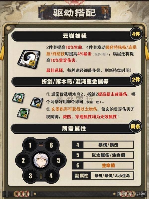 正文摘要:在《絕區零》這款遊戲中,每位角色都有自己最適合的驅動盤配置。對於新推出的角色「儀玄」,許多玩家可能都在煩惱該如何替她選擇最強的驅動盤套裝。別擔心,這篇攻略將為你詳細整理儀玄的驅動盤搭配技巧,讓你輕鬆打造出戰力爆表的儀玄! 👉 GM後台版 遊戲 推薦 ⬇️⬇️⬇️ 快速玩各種二次元動漫手遊app 儀玄驅動盤套裝怎麼選?新手必看 挑選儀玄的驅動盤套裝時,最關鍵的考量就是以下幾點: 首選畢業套裝「雲巋如我」:毫無疑問,「雲巋如我」是儀玄最頂級的畢業套裝。如果是過渡時期,才建議使用散搭的「2+2+2」組合。 「雲巋如我」四件套的獨特加成:這套裝的四件效果,能夠提供額外10%的「貫穿增傷」。這個增傷屬於「貫穿力增傷區」,是一個全新的獨立增傷區塊,與傳統的增傷效果計算方式不同,能顯著提升儀玄的傷害輸出。 兩件套搭配建議:在選擇兩件套時,可以優先考慮「折枝劍歌」或「啄木鳥電音」。主要看哪一套的詞條屬性比較好,選擇詞條優良的即可。 儀玄驅動盤詞條屬性怎麼挑? 選擇驅動盤上的詞條(也就是屬性)時,儀玄有其獨特的優先級。掌握這些重點,能讓你的儀玄戰力更上一層樓: 六號盤:只選生命值。請注意,「能量自動回復」這個詞條並不會提升閃能的恢復速度,所以六號盤務必選擇生命值。 五號盤:優先選擇以太增傷或生命值。由於「玄墨」是特殊的以太類型,能夠享受到以太增傷的加成。如果你的隊伍中增傷手段較少,優先選擇以太增傷效果會更為顯著。當然,如果能找到副詞條(次要屬性)非常好的五號生命盤,也可以考慮使用。 四號盤:優先選擇暴擊率或暴擊傷害。在儀玄的屬性收益中,生命值帶來的提升效益會比暴擊率與暴擊傷害低(在雙暴屬性未達到100%/260%之前)。因此,堆疊暴擊率與暴擊傷害是更有效益的選擇。 攻擊力堆疊的考量:雖然攻擊力也能部分轉化為貫穿力,但其帶來的收益遠不如暴擊率、暴擊傷害或生命百分比。因此,不需要特別去堆疊攻擊力。 儀玄關鍵屬性面板參考 以下是儀玄各個重要屬性面板的參考數值,幫助你檢視自己的儀玄是否達到理想狀態: 暴擊率 追求極致:65%以上(若有專屬武器,建議「0+1」面板不超過80%,「1+1」面板不超過70%)。 優秀面板:60.2%以上(若無專屬武器,此為優秀數值;有專武者可繼續往上提升)。 持續提升:55.4%以上(中後期過渡階段的參考數值,適合休閒玩家)。 前期過渡:50.6%以上(遊戲前期只需選擇一個帶有暴擊率的驅動盤,稍微有一點暴擊詞條即可)。 暴擊傷害 追求極致:142.8%以上(此數值主要針對選擇「青溟籠舍」音擎的情況,其他音擎則不作此要求)。 優秀面板:128%以上(若無專屬武器,此為優秀數值;有專武者可繼續往上提升)。 持續提升:109%以上(中後期過渡階段的參考數值,適合休閒玩家)。 前期過渡:90%以上(遊戲前中期可作為參考,先達到這個數值即可)。 生命值 請注意:暴擊率與暴擊傷害的優先級高於生命值。以下提供的生命值數值,是針對以太盤或生命盤的不同參考範圍。 青溟籠舍音擎搭配:16434以上 或 18946以上。 電波漫步音擎搭配:16015以上 或 18527以上。 幻變魔方音擎搭配:13922以上 或 16434以上。 「灰燼」-鈷藍音擎搭配:15596以上 或 18108以上。 以下廣告滑動後還有帖子內容var custom_call_MIR = function (params) {if ( params === null || params.hasAd === false ) {var divRowSide;for (let index = 0; index < ONEADs.length; index++) {if (ONEADs[index].pub.player_mode === "mobile-inread") {divRowSide = ONEADs[index].pub.slotobj;}}var ins = document.createElement('ins');ins.className = 'clickforceads';ins.setAttribute('style', 'display:inline-block;');ins.setAttribute('data-ad-zone', '18264');divRowSide.appendChild(ins);var js = document.createElement('script');js.async = true;js.type = 'text/javascript';js.setAttribute('src', '//cdn.holmesmind.com/js/init.js');js.onload = function(){console.log('[ONEAD MIR] ClickForce Loaded');};divRowSide.appendChild(js);}};var _ONEAD = {};_ONEAD.pub = {};_ONEAD.pub.slotobj = document.getElementById("oneadMIRDFPTag");_ONEAD.pub.slots = ["div-onead-ad"];_ONEAD.pub.uid = "1000509";_ONEAD.pub.external_url = "https://onead.onevision.com.tw/";_ONEAD.pub.scopes = ["spotbuy", "speed"];_ONEAD.pub.player_mode_div = "div-onead-ad";_ONEAD.pub.player_mode = "mobile-inread";_ONEAD.pub.queryAdCallback = custom_call_MIR;var ONEAD_pubs = ONEAD_pubs || [];ONEAD_pubs.push(_ONEAD);var truvidScript = document.createElement('script'); truvidScript.async = true; truvidScript.setAttribute('data-cfasync','false'); truvidScript.type = 'text/javascript'; truvidScript.src = '//stg.truvidplayer.com/index.php?sub_user_id=597&widget_id=3309&playlist_id=2381&m=a&cb=' + (Math.random() * 10000000000000000); var currentScript = document.currentScript || document.scripts[document.scripts.length - 1]; currentScript.parentNode.insertBefore(truvidScript, currentScript.nextSibling); 《絕區零》儀玄驅動盤常見問題Q&A Q:儀玄的畢業套裝是什麼? A:儀玄的畢業套裝是「雲巋如我」。這套裝的四件效果能提供獨特的貫穿增傷,對儀玄的輸出提升非常大。 Q:如果還沒湊齊畢業套裝,過渡時期怎麼辦? A:在還沒有湊齊「雲巋如我」四件套之前,可以先使用「2+2+2」的散搭組合作為過渡。 Q:儀玄的「貫穿增傷」跟一般增傷有什麼不同? A:儀玄「雲巋如我」四件套提供的「貫穿增傷」,屬於「貫穿力增傷區」,這是一個獨立的增傷乘區,計算方式與傳統的增傷效果不同,能帶來額外的傷害收益。 Q:儀玄的六號驅動盤一定要選擇生命值嗎? A:是