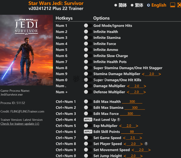 正文摘要:replyreload += ',' + 2391874; 想要在《星際大戰 絕地:倖存者》中享受更輕鬆的遊戲體驗嗎?這款最新版修改器提供了22種強大功能,讓你可以自由調整遊戲難度,無論是想要無敵通關還是快速升級,都能滿足你的需求! 👉 GM後台版 遊戲 推薦 ⬇️⬇️⬇️ 快速玩各種二次元動漫手遊app 修改器基本資訊 這款修改器支援《星際大戰 絕地:倖存者》v20241212版本及以上,提供了14個主要功能選項,讓玩家可以根據自己的喜好來調整遊戲體驗。 修改器功能詳細介紹 基礎戰鬥增強功能 Num 1 - 上帝模式/無視攻擊:完全免疫所有傷害Num 2 - 無限生命值:血量永遠保持滿格Num 3 - 無限體力:再也不用擔心體力耗盡Num 4 - 無限原力:隨時使用原力技能Num 5 - 無限彈藥:遠程武器永不缺彈Num 6 - 無限慢動作充能:時間操控技能無限使用Num 7 - 無限生命藥水:治療道具用不完 戰鬥傷害調整功能 Num 8 - 超級體力傷害/一擊暈眩:輕鬆打斷敵人動作Num 9 - 體力傷害倍率:自訂體力傷害程度Num 0 - 超級傷害/一擊必殺:秒殺所有敵人Num . - 傷害倍率:調整攻擊力倍數Num + - 防禦倍率:提升防禦能力 進階數值編輯功能 Ctrl+Num 1 - 編輯最大生命值:自訂血量上限Ctrl+Num 2 - 編輯最大體力:調整體力上限Ctrl+Num 3 - 編輯最大原力:設定原力值上限Ctrl+Num 4 - 快速升級:瞬間提升等級Ctrl+Num 5 - 經驗值倍率:調整獲得經驗的倍數Ctrl+Num 6 - 編輯技能點數:自由分配技能點 遊戲速度控制功能 Ctrl+Num 7 - 設定遊戲速度:調整整體遊戲節奏Ctrl+Num 8 - 設定玩家速度:只調整角色移動速度Ctrl+Num 9 - 設定移動速度:精確控制移動快慢Ctrl+Num 0 - 設定跳躍高度:調整跳躍能力 修改器下載與安裝教學 下載步驟 點擊下方下載連結,前往下載頁面等待下載完成,檔案名稱為 Star Wars Jedi Survivor v20241212 Plus 22 Trainer.exe建議將檔案放置在容易找到的資料夾中 下載連結: 所有站內附件皆會附上安全掃描報告請會員查看純淨度百分比後判斷使用(adsbygoogle = window.adsbygoogle || []).push({});相關檔案須知:取得檔案前,請先詳細閱讀文章內容避免不必要錯誤與誤會發生。也可多參考文章討論樓層內容了解附件檔案相關討論資訊。 【此文章部分內容隱藏中】 解除隱藏說明教學點擊下方 繼續閱讀文章 後請仔細觀看文章內容 並依照指示進行下一步最後完成解除隱藏後系統會回到此文章自動顯示隱藏內容~繼續閱讀 使用方法 確保遊戲版本為 v20241212 或更新版本先啟動《星際大戰 絕地:倖存者》遊戲以系統管理員身分執行修改器檔案等待修改器偵測到遊戲程序按下對應的快捷鍵啟用想要的功能 星際大戰 絕地:倖存者修改器_常見問題Q&A Q:修改器無法啟動怎麼辦? 請確保以系統管理員身分執行修改器,並檢查防毒軟體是否阻擋了執行檔。 Q:按下快捷鍵沒有反應? 確認遊戲已經完全載入,並且修改器有成功偵測到遊戲程序,建議重新啟動修改器。 Q:使用修改器會影響遊戲存檔嗎? 建議在使用修改器前先備份存檔,雖然大部分功能不會損壞存檔,但為了安全起見還是要小心。 Q:可以在線上模式使用嗎? 強烈不建議在任何線上功能中使用修改器,這可能導致帳號被封鎖。 Q:修改器支援哪些遊戲版本? 目前支援 v20241212 版本及以上,如果遊戲更新後修改器失效,請等待新版本修改器發布。 replyreload += ',' + 2391874; |