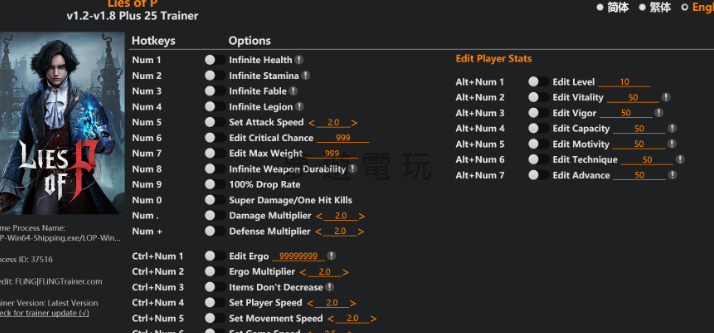 正文摘要:replyreload += ',' + 2391875; 想要在《P的謊言》中體驗更輕鬆的遊戲過程嗎?這款風靈月影修改器絕對是你的好幫手!這個修改器支援遊戲版本 v1.2 到 v1.8+,提供了多達 25 種不同的功能選項,讓你可以自由調整遊戲體驗。 👉 GM後台版 遊戲 推薦 ⬇️⬇️⬇️ 快速玩各種二次元動漫手遊app 修改器功能介紹 這款修改器提供了豐富的功能選項,讓你可以根據自己的需求來調整遊戲體驗: 基礎生存功能 Num 1 – 無限生命值:再也不用擔心死亡Num 2 – 無限體力:可以無限制地進行攻擊和閃避Num 3 – 無限寓言點數:技能使用不受限制Num 4 – 無限軍團點數:召喚能力隨時可用Num 8 – 無限武器耐久度:武器永遠不會損壞 戰鬥增強功能 Num 5 – 設定攻擊速度:讓你的攻擊更快更流暢Num 6 – 編輯暴擊機率:提高暴擊發生的機會Num 9 – 100% 掉落率:確保敵人必定掉落物品Num 0 – 超級傷害/一擊必殺:輕鬆解決強敵Num . – 傷害倍數:自訂傷害輸出倍率Num + – 防禦倍數:提升防禦能力 角色屬性調整 Num 7 – 編輯最大負重:攜帶更多裝備Ctrl+Num 1 – 編輯 Ergo 貨幣:調整遊戲內貨幣數量Ctrl+Num 2 – Ergo 倍數:獲得貨幣的倍率加成Ctrl+Num 3 – 物品不減少:使用物品後數量不會減少 移動與遊戲速度 Ctrl+Num 4 – 設定玩家速度:調整角色移動速度Ctrl+Num 5 – 設定移動速度:更精細的移動控制Ctrl+Num 6 – 設定遊戲速度:加快或放慢整體遊戲節奏 角色數值編輯 想要打造完美角色?這些功能讓你可以直接編輯角色的各項數值: Alt+Num 1 – 編輯等級Alt+Num 2 – 編輯生命力Alt+Num 3 – 編輯活力Alt+Num 4 – 編輯容量Alt+Num 5 – 編輯動力Alt+Num 6 – 編輯技巧Alt+Num 7 – 編輯進階 修改器下載與安裝 下載連結 修改器檔案名稱:Lies of P v1.2-v1.8 Plus 25 Trainer.exe 下載點: 所有站內附件皆會附上安全掃描報告請會員查看純淨度百分比後判斷使用(adsbygoogle = window.adsbygoogle || []).push({});相關檔案須知:取得檔案前,請先詳細閱讀文章內容避免不必要錯誤與誤會發生。也可多參考文章討論樓層內容了解附件檔案相關討論資訊。 【此文章部分內容隱藏中】 解除隱藏說明教學點擊下方 繼續閱讀文章 後請仔細觀看文章內容 並依照指示進行下一步最後完成解除隱藏後系統會回到此文章自動顯示隱藏內容~繼續閱讀 安裝步驟 點擊上方下載連結,前往下載頁面下載完成後,找到 Lies of P v1.2-v1.8 Plus 25 Trainer.exe 檔案確保你的《P的謊言》遊戲版本在 v1.2 到 v1.8+ 之間以系統管理員身分執行修改器啟動《P的謊言》遊戲在遊戲中按下對應的快捷鍵來啟用功能 使用注意事項 使用修改器時,建議先備份你的遊戲存檔,避免意外情況發生。另外,部分功能可能會影響遊戲平衡性,建議根據個人需求適度使用。 這款修改器最後更新時間為 2025.06.08,確保與最新版本的遊戲相容。如果你在使用過程中遇到任何問題,可以嘗試重新下載或檢查遊戲版本是否符合要求。 P的謊言修改器_常見問題Q&A Q:修改器支援哪些遊戲版本? 支援《P的謊言》v1.2 到 v1.8+ 版本,最後更新時間為 2025.06.08。 Q:使用修改器會不會影響遊戲存檔? 建議在使用前先備份存檔,雖然修改器通常不會損壞存檔,但預防措施總是好的。 Q:修改器無法啟動怎麼辦? 請確保以系統管理員身分執行修改器,並檢查防毒軟體是否阻擋了執行檔。 Q:可以同時使用多個功能嗎? 可以的,你可以根據需要同時啟用多個修改器功能,但建議適度使用以維持遊戲體驗。 Q:修改器的快捷鍵衝突怎麼處理? 如果快捷鍵與其他軟體衝突,可以嘗試關閉其他可能衝突的程式,或在遊戲全螢幕模式下使用。 replyreload += ',' + 2391875; |