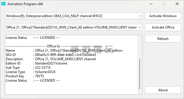 正文摘要:replyreload += ',' + 2392028;版本:1.12b01 更新日期:2024年06月03日 對於需要啟用 Windows 作業系統或 Microsoft Office 辦公軟體的用戶來說,尋找一款可靠且功能強大的工具至關重要。《Activation Program》正是為此而生,這款由知名開發者 Ratiborus 全新打造的啟用工具,以其穩定的表現和豐富的功能選項,成為許多用戶的首選。它基於高效的 MASSGRAVE 程式碼開發,旨在提供安全且持久的啟用解決方案,讓您的軟體能夠順利啟用,輕鬆使用。 深入瞭解 Activation Program 的強大功能 這套多功能的工具集結了多種獨特的啟用方法與實用功能,涵蓋以下幾個面向,讓您的啟用過程更為簡便與靈活: ZeroCID:能在您重灌系統或進行功能更新前,預先提供永久性的啟用狀態,讓您無後顧之憂。 KMS4k:支援離線KMS啟用模式,提供長達四千多年的啟用期限,幾乎等同於永久使用,非常適合長期需求。 AVMA4k:同樣提供離線AVMA啟用功能,啟用期限也超過四千年,此功能主要針對 Windows Server 2012 R2 及更高版本作業系統用戶。 評估計數器重置:能讓軟體評估期重新歸零,實現無限期的評估使用,讓您有充足時間體驗完整功能。 評估重置:與上述功能類似,目標是讓您能夠持續享有無限的評估使用權限,無需擔心試用期限制。 信任儲存重置/載入:協助您重設並重新載入信任儲存中的關鍵資料,確保軟體正常運作,解決可能出現的授權問題。 移除產品金鑰的唯一識別碼:此功能可有效防止產品金鑰在線上進行驗證,保障您的使用隱私與安全,點此參考更多相關資訊。 安裝生成產品金鑰:能夠為任何軟體或產品安裝所生成的產品金鑰,提供高度靈活性與便利性。 啟動現有KMS伺服器:即時啟動已存在的KMS伺服器,立即提供啟用所需的服務,適用於企業或專業用戶。 清除未經授權的存取記錄:有效解決因信任儲存損毀或被移除,所導致的異常存取問題,讓您的系統保持潔淨。 移除產品金鑰鎖定限制:解除對產品金鑰的限制,讓您能夠彈性更換金鑰以進行評估使用,增加操作自由度。 在軟體使用介面上,您可以清楚看到其直觀的設計,便於用戶快速上手操作: 👉 GM後台版 遊戲 推薦 ⬇️⬇️⬇️ 快速玩各種二次元動漫手遊app Activation Program v1.12b01 免安裝版下載 《Activation Program》提供便捷的免安裝版本,讓您無需複雜的安裝步驟即可快速啟用 Windows 或 Office。以下是最新版本 v1.12b01 的下載連結,請選擇適合您系統位元(32位元或64位元)的版本進行下載。 Activation Program (64位元版本): 所有站內附件皆會附上安全掃描報告請會員查看純淨度百分比後判斷使用(adsbygoogle = window.adsbygoogle || []).push({});相關檔案須知:取得檔案前,請先詳細閱讀文章內容避免不必要錯誤與誤會發生。也可多參考文章討論樓層內容了解附件檔案相關討論資訊。 【此文章部分內容隱藏中】 解除隱藏說明教學點擊下方 繼續閱讀文章 後請仔細觀看文章內容 並依照指示進行下一步最後完成解除隱藏後系統會回到此文章自動顯示隱藏內容~繼續閱讀 Activation Program (32位元版本 - x86): 下載鏈接replyreload += ',' + 2392028; |