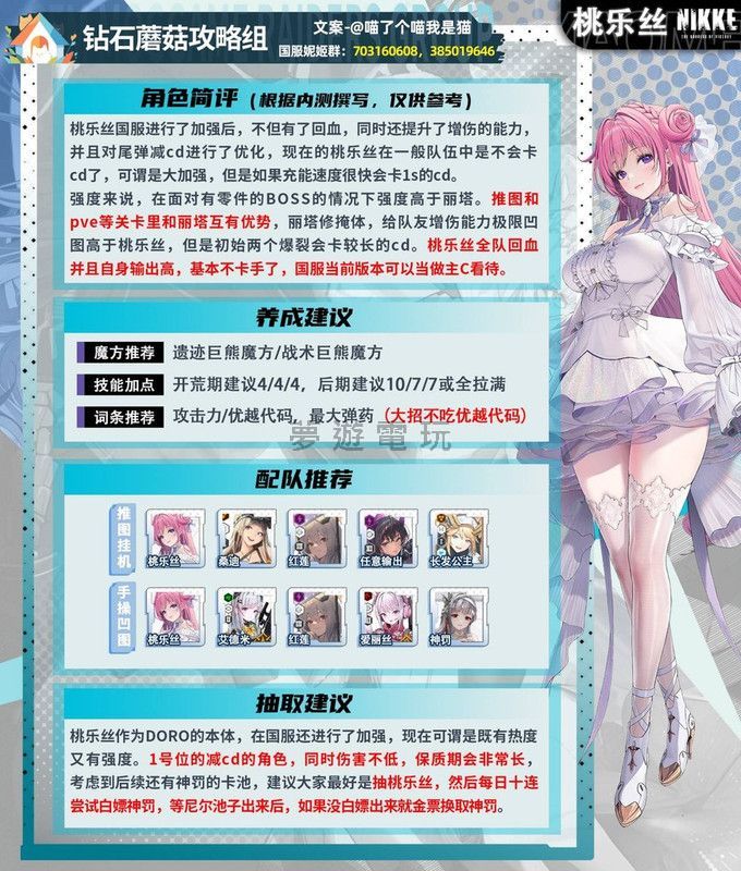 正文摘要:桃樂絲抽取建議與強度整理 新角色桃樂絲在遊戲更新後正式實裝了,這位新角色究竟值不值得抽?如果抽到了,又該怎麼搭配隊伍呢?這篇懶人圖攻略將會為您詳細整理。 關於桃樂絲的詳細強度分析,這篇懶人圖攻略已經解釋得很清楚了,這邊就不再重複說明。 👉 GM後台版 遊戲 推薦 ⬇️⬇️⬇️ 快速玩各種二次元動漫手遊app 這張節奏榜(Tier List)提供了目前遊戲中各角色的強度排名參考,能幫助您更全面地瞭解角色的實用性與隊伍搭配的潛力。您可以根據這張圖表,結合本篇攻略提供的抽取與收藏品建議,來規劃您的角色培養路線。 以下廣告滑動後還有帖子內容var custom_call_MIR = function (params) {if ( params === null || params.hasAd === false ) {var divRowSide;for (let index = 0; index < ONEADs.length; index++) {if (ONEADs[index].pub.player_mode === "mobile-inread") {divRowSide = ONEADs[index].pub.slotobj;}}var ins = document.createElement('ins');ins.className = 'clickforceads';ins.setAttribute('style', 'display:inline-block;');ins.setAttribute('data-ad-zone', '18264');divRowSide.appendChild(ins);var js = document.createElement('script');js.async = true;js.type = 'text/javascript';js.setAttribute('src', '//cdn.holmesmind.com/js/init.js');js.onload = function(){console.log('[ONEAD MIR] ClickForce Loaded');};divRowSide.appendChild(js);}};var _ONEAD = {};_ONEAD.pub = {};_ONEAD.pub.slotobj = document.getElementById("oneadMIRDFPTag");_ONEAD.pub.slots = ["div-onead-ad"];_ONEAD.pub.uid = "1000509";_ONEAD.pub.external_url = "https://onead.onevision.com.tw/";_ONEAD.pub.scopes = ["spotbuy", "speed"];_ONEAD.pub.player_mode_div = "div-onead-ad";_ONEAD.pub.player_mode = "mobile-inread";_ONEAD.pub.queryAdCallback = custom_call_MIR;var ONEAD_pubs = ONEAD_pubs || [];ONEAD_pubs.push(_ONEAD);var truvidScript = document.createElement('script'); truvidScript.async = true; truvidScript.setAttribute('data-cfasync','false'); truvidScript.type = 'text/javascript'; truvidScript.src = '//stg.truvidplayer.com/index.php?sub_user_id=597&widget_id=3309&playlist_id=2381&m=a&cb=' + (Math.random() * 10000000000000000); var currentScript = document.currentScript || document.scripts[document.scripts.length - 1]; currentScript.parentNode.insertBefore(truvidScript, currentScript.nextSibling); 桃樂絲抽取配隊與珍藏品常見問題Q&A Q:桃樂絲的強度定位如何?值得新手玩家抽嗎? A:桃樂絲屬於強力角色,對於新手玩家來說,如果沒有麗塔,她會是一個很好的選擇,能顯著提升隊伍戰力。 Q:為什麼說2B和A2目前不建議培養? A:根據國際服的表現,2B和A2目前的強度相對較弱,除非臺服有特別強化,否則主要作為收藏角色,不建議投入大量資源培養。 Q:收藏品一旦裝備後就無法卸下,這有什麼影響? A:這意味著您在為角色裝備收藏品時需要謹慎考量,避免裝備給不常使用的角色,因為一旦裝備就無法取下,除非有替換品。 Q:SR級收藏品前期比較少,該優先給哪些角色? A:建議優先給紅蓮、桃樂絲、白雪公主、連點流愛麗絲,以及未來會實裝的神罰這些核心輸出或強力輔助角色。 Q:珍藏品(專武)的解鎖條件是什麼?很難達成嗎? A:珍藏品解鎖需要SR收藏品達到15級,且角色好感度達30(二星)。這需要投入一定的資源和時間,對新手玩家來說前期會比較困難。 Q:為何普琳瑪的專武目前不建議開啟? A:普琳瑪的專武技能「無視防禦力傷害提升」在目前版本幾乎沒有角色能有效配合,效果過於超前,建議等待未來有相關角色實裝後再考慮。 Q:每日派遣的好感度道具該怎麼分配? A:建議優先給艾可希雅,其次迪賽爾,最後是普琳瑪,特別是如果你有計畫解鎖他們的珍藏品。 |