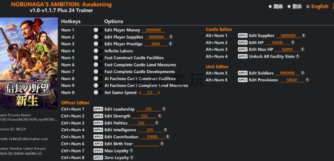 正文摘要:replyreload += ',' + 2393059; 想要在《信長之野望・新生》中體驗更自由的遊戲方式嗎?這款風靈月影修改器提供了豐富的功能,讓你可以輕鬆調整遊戲中的各種數值,加快建設進度,甚至控制AI行為。無論你是想要快速發展領地,還是專注於戰略規劃,這個修改器都能滿足你的需求。 👉 GM後台版 遊戲 推薦 ⬇️⬇️⬇️ 快速玩各種二次元動漫手遊app 修改器功能介紹 這款修改器提供了多達24種不同的功能,涵蓋了遊戲的各個層面。以下是主要功能的詳細說明: 基礎資源修改功能 Num 1 – 編輯玩家金錢:可以隨意調整你的資金數量Num 2 – 編輯玩家物資:修改你的物資儲備Num 3 – 編輯玩家威望:提升或調整威望值Num 4 – 無限勞力:讓你的勞力永遠不會耗盡 建設加速功能 這些功能可以大幅縮短建設時間,讓你快速發展領地: Num 5 – 快速建造城堡設施:瞬間完成設施建設Num 6 – 快速完成城堡土地措施:加速土地開發Num 7 – 快速完成城堡發展:快速提升城堡等級 AI控制功能 想要專注於自己的發展而不被AI打擾?這些功能可以限制AI的行為: Num 8 – AI勢力無法建造設施:阻止AI建設發展Num 9 – AI勢力無法完成土地措施:限制AI土地開發Num 0 – 設定遊戲速度:調整遊戲進行的快慢 武將編輯器功能 使用Ctrl組合鍵可以編輯武將的各項屬性: 快捷鍵功能說明Ctrl+Num 1編輯統率力</td> [/tr] Ctrl+Num 2編輯武力</td> [/tr] Ctrl+Num 3編輯政治力</td> [/tr] Ctrl+Num 4編輯智力</td> [/tr] Ctrl+Num 5編輯貢獻度</td> [/tr] Ctrl+Num 6編輯出生年份</td> [/tr] Ctrl+Num 7最大忠誠度</td> [/tr] Ctrl+Num 8零忠誠度</td> [/tr] 城堡編輯器功能 使用Alt組合鍵可以編輯城堡相關數值: Alt+Num 1 – 編輯物資:調整城堡的物資儲備Alt+Num 2 – 編輯HP:修改城堡當前血量Alt+Num 3 – 編輯最大HP:設定城堡最大血量Alt+Num 4 – 解鎖所有設施槽位:開放所有建設位置 部隊編輯器功能 管理你的軍隊變得更簡單: Alt+Num 5 – 編輯士兵數量:調整部隊兵力Alt+Num 6 – 編輯糧草:修改部隊的補給狀況 修改器下載與安裝 修改器檔名:NOBUNAGAS AMBITION Awakening v1.0-v1.1.7 Plus 24 Trainer.exe 下載連結: 所有站內附件皆會附上安全掃描報告請會員查看純淨度百分比後判斷使用(adsbygoogle = window.adsbygoogle || []).push({});相關檔案須知:取得檔案前,請先詳細閱讀文章內容避免不必要錯誤與誤會發生。也可多參考文章討論樓層內容了解附件檔案相關討論資訊。 【此文章部分內容隱藏中】 解除隱藏說明教學點擊下方 繼續閱讀文章 後請仔細觀看文章內容 並依照指示進行下一步最後完成解除隱藏後系統會回到此文章自動顯示隱藏內容~繼續閱讀 安裝步驟 點擊上方下載連結,前往下載頁面下載完成後,將修改器檔案放置在容易找到的位置確保遊戲已經安裝並可以正常運行以管理員身分執行修改器程式啟動《信長之野望・新生》遊戲在遊戲中按下對應的快捷鍵即可使用相關功能 信長之野望新生修改器常見問題Q&A Q:修改器無法正常運作怎麼辦? 確保以管理員身分執行修改器,並檢查遊戲版本是否在v1.0-v1.1.7範圍內。 Q:使用修改器會影響遊戲存檔嗎? 建議在使用修改器前先備份存檔,雖然一般不會造成問題,但預防總是比較安全。 Q:可以在線上模式使用修改器嗎? 修改器主要設計給單人遊戲使用,不建議在多人或線上模式中使用。 Q:快捷鍵沒有反應該怎麼處理? 確認遊戲是在前景執行,且修改器已正確載入。有時需要先進入遊戲主畫面後再按快捷鍵。 Q:修改器支援哪些遊戲版本? 此修改器支援《信長之野望・新生》v1.0到v1.1.7版本,其他版本可能無法正常使用。 replyreload += ',' + 2393059; |