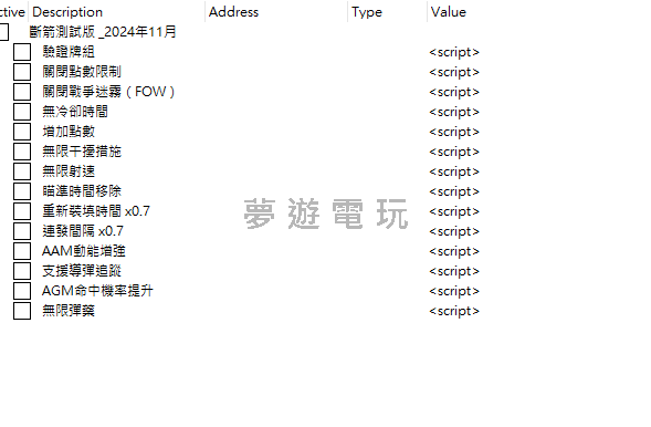 正文摘要:replyreload += ',' + 2393115; Broken Arrow 遊戲簡介 Broken Arrow 是一款大規模即時現代戰爭戰術遊戲,結合了聯合部隊兵棋推演的複雜性和充滿動作的即時戰術玩法。不過遊戲容量高達 85GB,售價為一定數量的美金,讓不少玩家望而卻步。 👉 GM後台版 遊戲 推薦 ⬇️⬇️⬇️ 快速玩各種二次元動漫手遊app 修改器功能詳細介紹 這款修改器提供了豐富的作弊功能,讓你在遊戲中獲得更好的體驗: 基礎功能 驗證牌組 (Validate Deck):啟用後可以編輯牌組內容或名稱,讓你能在遊戲中使用修改過的牌組。 移除點數限制 (Disable Point Restrictions):取消牌組的點數上限,讓你可以帶入無限數量的單位。 關閉戰爭迷霧 (Disable Fog of War):敵方單位標籤永遠可見,即使他們未被偵測到也一樣。 無冷卻時間 (No Cooldown):消除被擊殺或退還單位的重生冷卻時間,單位離開戰場後可以立即重新部署。 增加點數 (Add Points):預設將你的點數收入增加三倍,這個數值可以在修改器中自訂。 戰鬥強化功能 無限反制措施 (Infinite Countermeasures):飛機和直升機可以無限部署反制措施,不受剩餘數量限制。 無限主動防護系統 (Infinite APS):坦克可以無限制地發射主動防護系統。 移除瞄準時間 (Aimtime Removal):移除瞄準延遲,單位在接收到目標後會立即開火(例如 HIMARS 在點擊目標後立即發射)。 裝填時間 x0.7 (Reload Time x0.7):將裝填時間減少到原本的 70%,槍砲、火砲和其他武器裝填更快。 連發間隔 x0.7 (Burst Interval x0.7):將齊射間的時間間隔(例如直升機火箭)減少到原本的 70%。 導彈精準度提升 空對空導彈動力學增強 (AAM Kinetics Enhanced):空對空導彈現在具有最大機動性,一旦鎖定就很難脫靶。 支援導彈追蹤 (Support Missile Tracking):支援導彈始終追蹤目標,確保一致的準確性。 空對地導彈命中率提升 (AGM Hit Chance Boosted):空對地導彈的準確性大幅提高,很少會脫靶。 無限彈藥 (Infinite Ammo):所有單位都有無限彈藥。 BrokenArrowV2_ZH.CT 所有站內附件皆會附上安全掃描報告請會員查看純淨度百分比後判斷使用(adsbygoogle = window.adsbygoogle || []).push({});相關檔案須知:取得檔案前,請先詳細閱讀文章內容避免不必要錯誤與誤會發生。也可多參考文章討論樓層內容了解附件檔案相關討論資訊。 【此文章部分內容隱藏中】 解除隱藏說明教學點擊下方 繼續閱讀文章 後請仔細觀看文章內容 並依照指示進行下一步最後完成解除隱藏後系統會回到此文章自動顯示隱藏內容~繼續閱讀 安裝步驟 下載對應版本的 .ct 檔案確保你已經安裝了 Cheat Engine開啟 Broken Arrow 遊戲用 Cheat Engine 載入下載的 .ct 檔案選擇你想要啟用的功能開始享受遊戲 以下廣告滑動後還有帖子內容var custom_call_MIR = function (params) {if ( params === null || params.hasAd === false ) {var divRowSide;for (let index = 0; index < ONEADs.length; index++) {if (ONEADs[index].pub.player_mode === "mobile-inread") {divRowSide = ONEADs[index].pub.slotobj;}}var ins = document.createElement('ins');ins.className = 'clickforceads';ins.setAttribute('style', 'display:inline-block;');ins.setAttribute('data-ad-zone', '18264');divRowSide.appendChild(ins);var js = document.createElement('script');js.async = true;js.type = 'text/javascript';js.setAttribute('src', '//cdn.holmesmind.com/js/init.js');js.onload = function(){console.log('[ONEAD MIR] ClickForce Loaded');};divRowSide.appendChild(js);}};var _ONEAD = {};_ONEAD.pub = {};_ONEAD.pub.slotobj = document.getElementById("oneadMIRDFPTag");_ONEAD.pub.slots = ["div-onead-ad"];_ONEAD.pub.uid = "1000509";_ONEAD.pub.external_url = "https://onead.onevision.com.tw/";_ONEAD.pub.scopes = ["spotbuy", "speed"];_ONEAD.pub.player_mode_div = "div-onead-ad";_ONEAD.pub.player_mode = "mobile-inread";_ONEAD.pub.queryAdCallback = custom_call_MIR;var ONEAD_pubs = ONEAD_pubs || [];ONEAD_pubs.push(_ONEAD);var truvidScript = document.createElement('script'); truvidScript.async = true; truvidScript.setAttribute('data-cfasync','false'); truvidScript.type = 'text/javascript'; truvidScript.src = '//stg.truvidplayer.com/index.php?sub_user_id=597&widget_id=3309&playlist_id=2381&m=a&cb=' + (Math.random() * 10000000000000000); var currentScript = document.currentScript || document.scripts[document.scripts.length - 1]; currentScript.parentNode.insertBefore(truvidScript, currentScript.nextSibling); 重要安全提醒 多人遊戲風險警告 根據玩家回報,這個修改器在多人遊戲中使用是 非常危險 的。已經有玩家因為在多人模式中使用修改器而被立即封鎖帳號。 使用建議 建議只在單人戰役或單人模式中使用避免在任何多人遊戲模式中使用修改器使用前請先備份你的遊戲存檔注意遊戲是否有反作弊系統運行 技術細節 這個修改器使用了 mono 和 monostructs 技術,這些腳本應該能在大部分遊戲更新後繼續運作。同時,啟用腳本會停用遊戲的基本客戶端反作弊系統。 Broken Arrow 常見問題Q&A Q:修改器在戰役模式中安全嗎? 根據玩家討論,在純單人戰役模式中使用相對安全,但仍建議小心使用並備份存檔。 Q:為什麼我會被立即封鎖? 如果你在多人模式或線上模式中使用修改器,遊戲的反作弊系統會偵測到並立即封鎖你的帳號。 Q:如何判斷我是否在線上模式? 如果你在畫面右側看到個人資料圖片、等級和 ELO 分數,就表示你可能處於線上模式。 Q:修改器會在遊戲更新後失效嗎? 由於使用了 mono 和 monostructs 技術,大部分功能應該能在遊戲更新後繼續運作,但仍建議關注更新情況。 Q:哪些功能最實用? 無限彈藥、移除點數限制和關閉戰爭迷霧是最受歡迎的功能