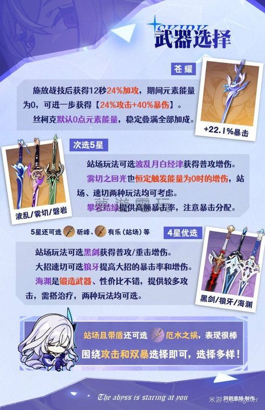 《原神》絲柯克武器搭配深度整理:新手也能輕鬆選! 各位旅行者大家好!《原神》5.7版本的新角色「絲柯克」已經正式登場了,相信許多玩家都想知道,這位強力角色到底要怎麼選擇最適合的武器呢?別擔心,本篇攻略將