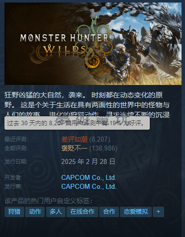 曾被譽為2025年開年鉅作的《魔物獵人:荒野》(Monster Hunter: Wilds),儘管年初風光上市,甚至在Steam平臺寫下近140萬人同時在線的驚人紀錄,一度被視為年度現象級大作。然而,令人訝異的是,這款備受期待的續作