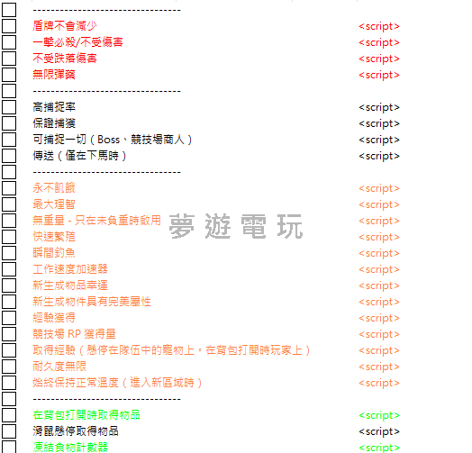 正文摘要:replyreload += ',' + 2394784;🎮 Palworld 幻獸帕魯修改器攻略省流懶人包 🎮 核心重點: ✨ 單人遊戲專用 - 不支援多人模式 🛡️ 戰鬥強化 - 無限生命、護盾、一擊必殺 🎯 捕捉系統 - 保證捕獲、高捕捉率、連塔主都能抓 ⚡ 便利功能 - 傳送系統、無重量限制、快速研究 🔧 製作強化 - 無限耐久、無視材料製作建造 📈 數值修改 - 經驗倍率、科技點數、完美屬性 注意事項: ⚠️ 超重時別開啟無重量限制功能 💾 記得儲存修改器設定檔案 適合對象:想要輕鬆體驗 Palworld 的單機玩家! 修改器基本資訊與注意事項 這款 Palworld 修改器是專為單人遊戲設計的 Cheat Table,作者在最新更新後重新分享了這個強化版本。如果你在使用過程中遇到任何問題,記得要詳細說明是哪個功能出現狀況,這樣比較容易找到解決方法。 重要提醒:此修改器僅在單人模式下測試過,作者沒有計劃支援多人遊戲模式。 👉 GM後台版 遊戲 推薦 ⬇️⬇️⬇️ 快速玩各種二次元動漫手遊app 戰鬥與生存強化功能 想要在 Palworld 的世界中無往不利嗎?這些戰鬥相關的功能絕對是你的好幫手: 無限護盾 - 再也不用擔心被怪物打破防禦無限生命值 + 一擊必殺 - 雙重保障讓你既打不死又能秒殺敵人無墜落傷害 - 從再高的地方跳下來都不會受傷無限彈藥 - 射個痛快,不用擔心子彈用完始終保持正常體溫 - 進入新區域時自動啟動,不會因為環境溫度而受影響 帕魯管理實用工具 照顧帕魯也變得更輕鬆了: 永不飢餓 - 帕魯們不會再因為肚子餓而工作效率下降滿理智值 - 保持帕魯們的心理健康,工作更有效率 捕捉系統全面升級 抓帕魯從此不再是難事: 高捕捉率 - 大幅提升捕捉成功機率(雖然不是百分百保證)保證捕獲 - 開啟後就是百分百成功捕捉塔主Boss - 連原本不能抓的強力Boss都能收服瞬間釣魚 - 釣魚不用等待時間 移動與便利性功能 讓遊戲體驗更順暢的實用功能: 傳送系統 這個功能可以讓你儲存和載入位置,不過要注意幾點: 只能在下坐騎狀態下使用記得要儲存修改器設定檔案,這樣下次遊戲時還能使用之前存的位置 無重量限制 ⚠️ 警告:如果你已經超重了,千萬不要直接開啟這個功能,否則可能會卡住。建議先丟掉一些物品再啟動。 繁殖與生成系統 想要培育完美的帕魯嗎?這些功能幫你達成: 新生成的帕魯都是幸運體質 - 天生就有好運加持新生成的帕魯擁有完美數值 - 各項能力都是滿點 進度與經驗相關功能 快速提升等級和解鎖科技: 經驗獲得倍率修改 - 自訂經驗值增長速度經驗值指針 - 只要打開背包或將滑鼠移到隊伍成員上就能使用(玩家65級需要130825100經驗值)競技場RP倍率修改 - 更快累積競技場點數快速研究 - 科技研究幾乎瞬間完成科技點數 - 包含指針功能和無限古代/一般科技點數 物品與製作系統強化 讓製作和建造變得更自由: 無限耐久度 - 工具和武器永遠不會壞打開背包時取得物品 - 包含倒數計時類物品滑鼠懸停取得物品 - 將滑鼠移到背包欄位上就能取得物品指針取得整疊物品 - 從生產設施中一次拿取多疊物品,即使是單次製作也能拿到多個凍結食物計數器 - 食物不會腐壞堆疊式創建 - 最新更新限制了創建數量為一疊可建造任何物品 - 只要解鎖了就能建造,不管有沒有材料可製作任何物品 - 只要解鎖了就能製作,不管有沒有材料 生產力提升功能 加速各種遊戲進程: 工作速度加速 - 帕魯們的工作效率大幅提升快速繁殖 - 縮短帕魯繁殖所需時間 除錯選項 對於想要深入了解修改器運作的玩家: 啟用通知和除錯訊息 - 在設定中可以開啟,方便追蹤功能狀態 Palworld修改器常見問題Q&A Q:這個修改器支援多人遊戲嗎? A:不支援。作者明確表示只在單人模式下測試,沒有計劃支援多人遊戲。 Q:無重量限制功能為什麼會卡住? A:如果在超重狀態下直接啟動會造成問題,建議先丟掉一些物品讓重量正常後再開啟功能。 Q:傳送功能的存檔位置會消失嗎? A:如果沒有儲存修改器設定檔案,下次遊戲時之前存的傳送點就會不見,記得要存檔。 Q:高捕捉率和保證捕獲有什麼差別? A:高捕捉率是提升成功機率但不保證百分百,保證捕獲則是完全不會失敗。 Q:經驗值指針要怎麼使用? A:打開背包就能看到玩家經驗值指針,將滑鼠移到隊伍中的帕魯上就能看到牠們的經驗值指針。 Q:為什麼有些功能沒有作用? A:請詳細說明是哪個功能出問題,這樣比較容易找到解決方案。確認遊戲版本和修改器版本是否相容也很重要。 Palworld-Win64-Shipping_ZH.CT 所有站內附件皆會附上安全掃描報告請會員查看純淨度百分比後判斷使用(adsbygoogle = window.adsbygoogle || []).push({});相關檔案須知:取得檔案前,請先詳細閱讀文章內容避免不必要錯誤與誤會發生。也可多參考文章討論樓層內容了解附件檔案相關討論資訊。 【此文章部分內容隱藏中】 解除隱藏說明教學點擊下方 繼續閱讀文章 後請仔細觀看文章內容 並依照指示進行下一步最後完成解除隱藏後系統會回到此文章自動顯示隱藏內容~繼續閱讀 replyreload += ',' + 2394784; |