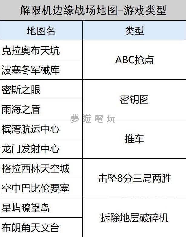 正文摘要:玩《解限機》時,你是不是也常常在選擇機甲的介面,搞不清楚接下來會進入哪種地圖模式呢?為了讓玩家們能快速掌握每個地圖的對應玩法,我們特別整理了這份《解限機》邊緣戰場地圖速查攻略,幫助你不再盲選,輕鬆掌握戰場動態! 《解限機》邊緣戰場地圖與模式對照表 這份表格能讓你一目瞭然地查到各個地圖所對應的遊戲類型,讓你選機甲不再憑感覺,而是精準出擊! 地圖名稱對應遊戲類型克拉奧布天坑ABC佔點波塞冬軍械庫ABC佔點 (水中地圖)密斯之眼鑰匙爭奪戰雨海之盾鑰匙爭奪戰檳灣航運中心護送任務龍門發射中心護送任務星嶼瞭望島摧毀鑽地機布朗角天文臺摧毀鑽地機格拉西林天空城擊墜爭奪戰 (目標8分,三戰兩勝制)空中巴比倫要塞擊墜爭奪戰 (目標8分,三戰兩勝制) 👉 GM後台版 遊戲 推薦 ⬇️⬇️⬇️ 快速玩各種二次元動漫手遊app 《解限機》常見問題Q&A Q:在《解限機》中,哪些地圖是屬於「ABC佔點」模式呢? A:目前「ABC佔點」模式的地圖有「克拉奧布天坑」和「波塞冬軍械庫」。值得注意的是,「波塞冬軍械庫」是水下地圖喔。 Q:想玩「護送任務」,有哪些地圖可以選? A:如果你喜歡「護送任務」玩法,可以留意「檳灣航運中心」跟「龍門發射中心」這兩張地圖。 Q:在「擊墜爭奪戰」模式中,有哪些地圖是三戰兩勝制的? A:目前「擊墜爭奪戰」模式中,採用目標8分、三戰兩勝制的地圖是「格拉西林天空城」和「空中巴比倫要塞」。 Q:遊戲裡有地圖是需要「摧毀鑽地機」的嗎? A:有的!「星嶼瞭望島」和「布朗角天文臺」這兩張地圖的目標,就是去摧毀對方的鑽地機。 Q:為什麼在選機甲的時候,看不到地圖的具體模式? A:這是遊戲目前的設計機制,你在選擇機甲的介面確實無法直接看到地圖的詳細遊戲類型。建議可以參考這篇攻略,預先了解各個地圖的對應模式,方便你提前做好戰術準備! 以下廣告滑動後還有帖子內容var custom_call_MIR = function (params) {if ( params === null || params.hasAd === false ) {var divRowSide;for (let index = 0; index < ONEADs.length; index++) {if (ONEADs[index].pub.player_mode === "mobile-inread") {divRowSide = ONEADs[index].pub.slotobj;}}var ins = document.createElement('ins');ins.className = 'clickforceads';ins.setAttribute('style', 'display:inline-block;');ins.setAttribute('data-ad-zone', '18264');divRowSide.appendChild(ins);var js = document.createElement('script');js.async = true;js.type = 'text/javascript';js.setAttribute('src', '//cdn.holmesmind.com/js/init.js');js.onload = function(){console.log('[ONEAD MIR] ClickForce Loaded');};divRowSide.appendChild(js);}};var _ONEAD = {};_ONEAD.pub = {};_ONEAD.pub.slotobj = document.getElementById("oneadMIRDFPTag");_ONEAD.pub.slots = ["div-onead-ad"];_ONEAD.pub.uid = "1000509";_ONEAD.pub.external_url = "https://onead.onevision.com.tw/";_ONEAD.pub.scopes = ["spotbuy", "speed"];_ONEAD.pub.player_mode_div = "div-onead-ad";_ONEAD.pub.player_mode = "mobile-inread";_ONEAD.pub.queryAdCallback = custom_call_MIR;var ONEAD_pubs = ONEAD_pubs || [];ONEAD_pubs.push(_ONEAD);var truvidScript = document.createElement('script'); truvidScript.async = true; truvidScript.setAttribute('data-cfasync','false'); truvidScript.type = 'text/javascript'; truvidScript.src = '//stg.truvidplayer.com/index.php?sub_user_id=597&widget_id=3309&playlist_id=2381&m=a&cb=' + (Math.random() * 10000000000000000); var currentScript = document.currentScript || document.scripts[document.scripts.length - 1]; currentScript.parentNode.insertBefore(truvidScript, currentScript.nextSibling); |