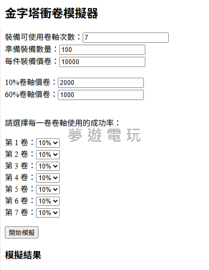 正文摘要:《Artale楓之谷世界》衝卷懶人包 🎲 想衝神裝又怕血本無歸?這篇給你最需要的工具! ⚔️ 金字塔衝卷成本計算機:想知道衝到+10要準備多少裝備跟楓幣嗎?輸入成功率、成本,一鍵幫你估算期望值,告別盲目亂點!✨ 玄學派衝卷模擬器:相信自己的手氣?來試試這款有音效的模擬器,提供沉浸式體驗,看看你是不是天選之人!💪 同場加映:作者佛心提供的角色素質計算機,幫你算出最好的裝備配法! 別再當衝卷賭狗了,先算再衝才科學!省錢練功看這篇就對啦~ 😉 前言:衝裝備總是讓你心驚膽跳嗎? 你是否也曾為了打造一把+100攻的十字槍而夜不成眠?在《Artale楓之谷世界》裡,衝卷是強化裝備的必經之路,但每次點下卷軸,心臟都漏跳一拍,深怕所有家當付諸流水。 最近有位熱心玩家因為沉迷於衝裝,特別製作了一個超實用的「金字塔衝卷成本計算器」,幫助大家在衝卷前能先有個底,控制好預算,別再當個無頭蒼蠅亂衝一通啦!這篇攻略就來教大家怎麼使用這個方便的小工具。 金字塔衝卷計算機 使用教學 這個工具主打的是「金字塔衝卷法」,意思很簡單:只有當前一卷成功時,才會繼續衝下一卷,這樣能有效控制成本,避免在一件已經失敗的裝備上浪費更多卷軸。 工具傳送門:https://hermanl1106.github.io/ArtaleTools/gamble.html 參考資料 衝裝模擬器 https://forum.gamer.com.tw/C.php ... nA=1686&tnum=10 以下廣告滑動後還有帖子內容var custom_call_MIR = function (params) {if ( params === null || params.hasAd === false ) {var divRowSide;for (let index = 0; index < ONEADs.length; index++) {if (ONEADs[index].pub.player_mode === "mobile-inread") {divRowSide = ONEADs[index].pub.slotobj;}}var ins = document.createElement('ins');ins.className = 'clickforceads';ins.setAttribute('style', 'display:inline-block;');ins.setAttribute('data-ad-zone', '18264');divRowSide.appendChild(ins);var js = document.createElement('script');js.async = true;js.type = 'text/javascript';js.setAttribute('src', '//cdn.holmesmind.com/js/init.js');js.onload = function(){console.log('[ONEAD MIR] ClickForce Loaded');};divRowSide.appendChild(js);}};var _ONEAD = {};_ONEAD.pub = {};_ONEAD.pub.slotobj = document.getElementById("oneadMIRDFPTag");_ONEAD.pub.slots = ["div-onead-ad"];_ONEAD.pub.uid = "1000509";_ONEAD.pub.external_url = "https://onead.onevision.com.tw/";_ONEAD.pub.scopes = ["spotbuy", "speed"];_ONEAD.pub.player_mode_div = "div-onead-ad";_ONEAD.pub.player_mode = "mobile-inread";_ONEAD.pub.queryAdCallback = custom_call_MIR;var ONEAD_pubs = ONEAD_pubs || [];ONEAD_pubs.push(_ONEAD);var truvidScript = document.createElement('script'); truvidScript.async = true; truvidScript.setAttribute('data-cfasync','false'); truvidScript.type = 'text/javascript'; truvidScript.src = '//stg.truvidplayer.com/index.php?sub_user_id=597&widget_id=3309&playlist_id=2381&m=a&cb=' + (Math.random() * 10000000000000000); var currentScript = document.currentScript || document.scripts[document.scripts.length - 1]; currentScript.parentNode.insertBefore(truvidScript, currentScript.nextSibling); Artale衝卷計算機_常見問題Q&A Q:這個金字塔衝卷計算機的結果準確嗎? A:這個工具是使用「期望值」來估算的,這是一個統計學上的概念,可以提供非常有價值的參考,但並非100%的絕對結果。實際情況還是要看你當下的運氣喔! Q:為什麼我輸入大量的裝備數量(例如一萬件),網頁就沒反應了? A:原作者有提到,因為下方結果會逐一模擬,所以當裝備數量設定得太多,網頁的計算量會變得非常大,可能會跑到天荒地老甚至當掉。建議將數量控制在100件以內進行測試,比較能順暢得到結果。 Q:攻略提到的「金字塔衝卷法」到底是什麼意思? A:這是一種控制成本的策略。意思就是,你只在裝備的前一張卷軸衝成功的情況下,才繼續衝下一張。如果中途有任何一卷失敗了,就果斷放棄這件裝備,換下一件新的來衝。這樣可以避免在已經「黑掉」的裝備上浪費更多卷軸。 Q:所以10%成功率的卷軸真的完全不建議衝嗎? A:根據原作者使用計算機得出的結論是「別當10%賭狗」。因為從期望值來看,要用10%卷軸打造出全身通過的神裝,需要的裝備數量和成本可能會是天文數字,CP值遠不如用60%卷軸慢慢堆屍。 Q:除了算成本的,還有其他衝卷相關的工具可以玩嗎? A:有的!文章內有提到另一款由其他玩家製作的「衝裝模擬器」,那款工具還附帶音效,讓你體驗模擬衝卷的快感,適合想測試自己當天運氣的「玄學派」玩家。 |
