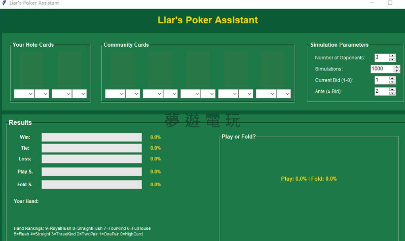 正文摘要:replyreload += ',' + 2397158;🎯 Liar's Bar 騙子酒吧 Python 牌面存活概率計算器懶人包 🃏 核心功能: 存活概率計算:根據下注量、底注、底牌和公共牌,精準計算你的存活機率智能建議系統:基於概率分析,提供「跟注」或「棄牌」的最佳策略建議Python 程式工具:免費下載使用,不用自己算複雜的機率 💡 適合玩家:不想憑感覺下注,想用數學提升勝率的聰明玩家! 🔧 使用方式:下載 ZIP 檔案,解壓縮後執行 Python 程式即可開始計算 ⚡ 省流重點:用科學方法玩 Liar's Bar,告別瞎猜時代! 🎲 想在 Liar's Bar 騙子酒吧中提升勝率嗎?這款 Python 牌面存活概率計算器絕對是你的最佳夥伴!透過科學的概率分析,讓你不再憑感覺下注,而是用數據說話。 工具功能介紹 這個 Python 計算器主要提供兩大核心功能,讓你在遊戲中做出更明智的決策: 👉 GM後台版 遊戲 推薦 ⬇️⬇️⬇️ 快速玩各種二次元動漫手遊app 存活概率精準計算 程式會根據你輸入的遊戲資訊,包括: 下注量(你投入的子彈數)底注(入場需支付的子彈數)底牌資訊公共牌資訊 透過這些數據,計算器會幫你算出在當前牌面下的存活概率,讓你清楚知道繼續下注的風險有多高。 智能策略建議系統 更棒的是,這個工具不只是單純計算概率,還會基於分析結果給你明確的建議: 跟注建議:當存活概率較高時,建議你繼續跟注棄牌建議:當風險過高時,建議你及時棄牌保命 下載與安裝教學 步驟一:下載檔案 首先,你需要下載這個 Python 計算器的壓縮檔: 檔案名稱:Liars-Poker-Assistant.zip 下載連結: 所有站內附件皆會附上安全掃描報告請會員查看純淨度百分比後判斷使用(adsbygoogle = window.adsbygoogle || []).push({});相關檔案須知:取得檔案前,請先詳細閱讀文章內容避免不必要錯誤與誤會發生。也可多參考文章討論樓層內容了解附件檔案相關討論資訊。 【此文章部分內容隱藏中】 解除隱藏說明教學點擊下方 繼續閱讀文章 後請仔細觀看文章內容 並依照指示進行下一步最後完成解除隱藏後系統會回到此文章自動顯示隱藏內容~繼續閱讀 步驟二:解壓縮檔案 下載完成後,使用你的解壓縮軟體(如 WinRAR、7-Zip)將 ZIP 檔案解壓縮到你喜歡的資料夾中。 步驟三:執行程式 解壓縮完成後,找到主程式檔案並執行。由於這是 Python 程式,你可能需要先安裝 Python 環境(如果電腦中還沒有的話)。 使用小技巧 要充分發揮這個計算器的效果,建議你: 在每次重要決策前都使用一次計算記錄自己按照建議執行後的結果,驗證工具的準確性結合自己的遊戲經驗,不要完全依賴程式建議 Liar's Bar 騙子酒吧 Python 概率計算器常見問題Q&A Q:這個計算器準確嗎? A:計算器基於數學概率理論,在輸入正確資訊的前提下,計算結果是相當準確的。 Q:需要什麼系統需求? A:需要安裝 Python 環境,建議使用 Python 3.6 以上版本。 Q:計算速度快嗎? A:程式執行速度很快,通常在幾秒內就能得出結果和建議。 Q:可以離線使用嗎? A:可以,這是本地程式,不需要網路連線就能使用。 Q:支援所有牌型嗎? A:程式設計涵蓋了 Liar's Bar 中的主要牌型和情況,適用於大部分遊戲場景。 replyreload += ',' + 2397158; |