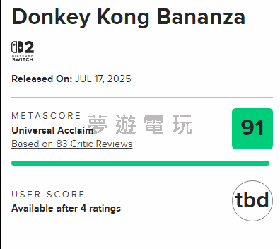 任天堂Switch 2(NS2)的遊戲陣容,在近期迎來了一位重量級的新星:《咚奇剛:蕉力全開》。這款備受期待的作品甫一上市,便在全球權威評分網站Metacritic上斬獲驚人的91分高分,並獲頒「MUST PLAY」(必玩遊戲)殊榮
