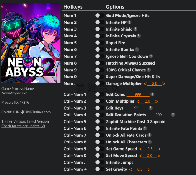 正文摘要:replyreload += ',' + 2399167; 🎮 霓虹深淵2修改器懶人包 🎮 23項超狂功能一次滿足! ⚡ 戰鬥系統:無敵模式、無限血量、護盾、暴擊100%武器強化:連射、超傷害、一擊必殺資源無限:金幣、鑰匙、水晶、炸彈通通不用愁角色解鎖:全角色、全命運卡片秒解鎖遊戲體驗:調整遊戲速度、移動速度、無限跳躍 💡 適用版本:Early Access+ 搶先體驗版 🔥 2025最新版本,功能完整穩定! 想要在霓虹深淵2中體驗無敵的爽快感嗎?這款風靈月影修改器絕對是你的最佳選擇!擁有多達23項強大功能,讓你在這款Roguelike射擊遊戲中暢行無阻。 👉 GM後台版 遊戲 推薦 ⬇️⬇️⬇️ 快速玩各種二次元動漫手遊app 修改器功能完整介紹 這款修改器提供了23種不同的功能,涵蓋戰鬥、資源、角色等各個層面,讓你可以根據需求自由調整遊戲體驗。 基礎戰鬥功能(數字鍵1-0、小數點) Num 1 – 無敵模式/忽略傷害:角色不會受到任何傷害Num 2 – 無限血量:血量永遠維持滿格狀態Num 3 – 無限護盾:護盾值不會減少Num 4 – 無限水晶:水晶數量不會消耗Num 5 – 快速射擊:武器射速大幅提升Num 6 – 無限炸彈:炸彈數量用不完Num 7 – 忽略技能冷卻:技能可以連續使用Num 8 – 孵化必定成功:寵物孵化100%成功率Num 9 – 100%暴擊機率:每次攻擊都是暴擊Num 0 – 超級傷害/一擊必殺:攻擊力大幅提升Num . – 傷害倍數調整:可自訂傷害倍率 進階功能(Ctrl+數字鍵組合) Ctrl+Num 1 – 編輯金幣:直接修改金幣數量Ctrl+Num 2 – 金幣倍數:獲得金幣時的倍率加成Ctrl+Num 3 – 編輯鑰匙:修改鑰匙數量Ctrl+Num 4 – 編輯進化點數:調整角色進化所需點數Ctrl+Num 5 – Zapbit機器免費:使用機器不需消耗ZapcoinCtrl+Num 6 – 無限命運點數:命運點數用不完Ctrl+Num 7 – 解鎖全命運卡片:所有命運卡片瞬間解鎖Ctrl+Num 8 – 解鎖全角色:所有可玩角色立即開放Ctrl+Num 9 – 設定遊戲速度:調整整體遊戲進行速度Ctrl+Num 0 – 設定移動速度:調整角色移動速度Ctrl+Num . – 無限跳躍:可以無限次跳躍Ctrl+Num + – 設定重力:調整遊戲內重力效果 修改器下載與安裝教學 第一步:下載修改器檔案 修改器檔案名稱為 Neon Abyss 2 Early Access Plus 23 Trainer.exe,你可以透過以下連結下載: 所有站內附件皆會附上安全掃描報告請會員查看純淨度百分比後判斷使用(adsbygoogle = window.adsbygoogle || []).push({});相關檔案須知:取得檔案前,請先詳細閱讀文章內容避免不必要錯誤與誤會發生。也可多參考文章討論樓層內容了解附件檔案相關討論資訊。 【此文章部分內容隱藏中】 解除隱藏說明教學點擊下方 繼續閱讀文章 後請仔細觀看文章內容 並依照指示進行下一步最後完成解除隱藏後系統會回到此文章自動顯示隱藏內容~繼續閱讀 第二步:安裝前準備 下載完成後,建議先將修改器檔案放置在容易找到的資料夾中。執行前請確保: 已經安裝霓虹深淵2遊戲遊戲版本為Early Access或更新版本關閉防毒軟體的即時防護(避免誤判) 第三步:啟動修改器 先啟動霓虹深淵2遊戲 進入遊戲主選單後,執行修改器檔案 修改器會自動偵測遊戲程序 看到修改器介面出現後,即可開始使用各項功能 霓虹深淵2修改器_常見問題Q&A Q:修改器支援哪些遊戲版本? 支援Early Access搶先體驗版及後續更新版本,最後更新日期為2025年7月27日。 Q:為什麼修改器無法啟動? 請確認遊戲已經先啟動,並且關閉防毒軟體的即時防護功能,某些防毒軟體可能會將修改器誤判為病毒。 Q:可以只使用部分功能嗎? 當然可以!每個功能都有獨立的熱鍵,你可以根據需要選擇性啟用想要的功能。 Q:使用修改器會影響遊戲存檔嗎? 建議在使用修改器前先備份遊戲存檔,雖然通常不會有問題,但以防萬一。 Q:熱鍵沒有反應怎麼辦? 確認修改器是否成功連接遊戲,並且在遊戲視窗為焦點狀態下按下熱鍵。如果還是沒反應,可以嘗試重新啟動修改器。 Q:Ctrl組合鍵功能如何使用? 按住Ctrl鍵不放,然後按下對應的數字鍵,例如編輯金幣功能需要按下Ctrl+1。 replyreload += ',' + 2399167; |