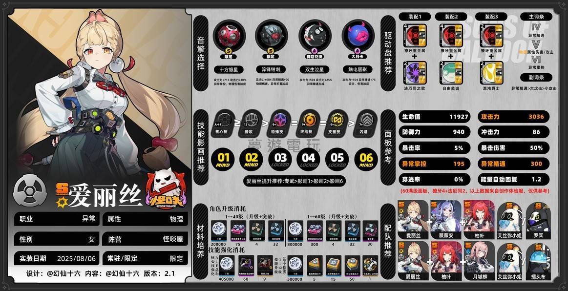 正文摘要:絕區零新手必看!愛麗絲培養懶人包圖文攻略! ✨ 愛麗絲是一位能主動觸發強擊的物理異常爆發型角色,具備高頻率紊亂觸發能力。 🚀 技能加點:核心技&普攻優先點滿,接著是特殊技、必殺技、支援技,閃避最後。 🔊 音擎(武器):專武優先,其次是「淬鋒鉗刺」,平民首選「雙生泣星」。 🛡️ 驅動盤:推薦獠牙重金屬4件套搭配法厄同2件套。主屬性選「異常精通」、「物理傷害加成」、「異常掌控」。 💖 命座(影畫):2影(二命)性價比超高,大幅提升輸出與循環,強烈建議抽取! 🤝 隊伍搭配:主推「愛麗絲 + 薇薇安 + 柚葉」,或是「愛麗絲 + 柚葉 + 月城柳」。 💡 核心技巧:善用「劍儀」發動極性強擊,可無視敵人異常積蓄直接觸發紊亂,讓你輕鬆打出超高傷害! 《絕區零》愛麗絲角色定位與特色整理 即將登場的「愛麗絲」是《絕區零》中一名強力的爆發型物理異常屬性代理人。她獨特的戰鬥機制,讓她在面對敵人時能打出驚人的傷害。透過這篇詳細的攻略指南,相信能幫助各位代理人更深入瞭解愛麗絲的培養方向與實戰技巧。 愛麗絲的核心戰鬥特色在於: 主動觸發強力攻擊:她能透過累積特定資源,發動特殊的蓄力攻擊,進而無視敵人當前的異常積蓄進度,直接觸發「強力攻擊」。 物理持續傷害:當愛麗絲的隊友對敵人施加物理異常狀態後,敵人會額外附加物理持續傷害狀態,這類傷害將隨著時間的推移,提升其紊亂傷害倍率。 高頻率紊亂觸發:愛麗絲不僅能透過特殊的強力攻擊立即結算紊亂傷害,更能結算自身的物理異常狀態,達成「自我紊亂」的效果。 總結來說,愛麗絲是一名可以主動發動強擊的異常爆發型輸出角色,她能為敵人施加高倍率的持續傷害狀態,並且透過特殊強擊迅速觸發紊亂,包含她自身的物理異常效果。想要深入瞭解愛麗絲的面板、技能升級、音擎、命座、驅動盤、隊伍搭配與培養材料等細節嗎?下方這張重點整理圖,將為您提供最完整的資訊。 當隊伍中存在另一名「異常」或「支援」角色時,此能力將被觸發: 進入戰場時,為愛麗絲充滿劍儀。 隊伍內任意角色觸發紊亂時,也會使愛麗絲回復一定劍儀。 當愛麗絲的異常掌控超過一定數值時,超出的異常掌控會全部轉換為愛麗絲的異常精通,且此轉換沒有上限。 然而,目前代理人在沒有武器加成的情況下,異常掌控最高僅能達到195點。 實戰操作技巧 愛麗絲的戰鬥思路主要圍繞著累積核心資源「劍儀」來展開。 當劍儀未滿時,愛麗絲可以透過自身,或與隊友配合觸發強力攻擊與紊亂,來快速回復劍儀。也可切換隊友施加增益效果,讓其他異常屬性隊友累積一定異常積蓄,為愛麗絲後續的爆發做鋪墊。 當劍儀積滿時,就進入愛麗絲的爆發期:發動三段蓄力攻擊,打出極性強擊的爆發傷害,在為敵人施加持續傷害的同時,也為自己附加積蓄效率提升的增益效果。 在敵人進入失衡狀態時,需要適當地掌控敵人的積蓄進度,透過離場觸發連攜的蓄力攻擊,讓極性強擊與普通強力攻擊、其他異常狀態相互結算紊亂,這是優化愛麗絲爆發流程的關鍵。 注意:在三段蓄力時,愛麗絲在角色消失的瞬間即可脫手連攜。 以下廣告滑動後還有帖子內容var custom_call_MIR = function (params) {if ( params === null || params.hasAd === false ) {var divRowSide;for (let index = 0; index < ONEADs.length; index++) {if (ONEADs[index].pub.player_mode === "mobile-inread") {divRowSide = ONEADs[index].pub.slotobj;}}var ins = document.createElement('ins');ins.className = 'clickforceads';ins.setAttribute('style', 'display:inline-block;');ins.setAttribute('data-ad-zone', '18264');divRowSide.appendChild(ins);var js = document.createElement('script');js.async = true;js.type = 'text/javascript';js.setAttribute('src', '//cdn.holmesmind.com/js/init.js');js.onload = function(){console.log('[ONEAD MIR] ClickForce Loaded');};divRowSide.appendChild(js);}};var _ONEAD = {};_ONEAD.pub = {};_ONEAD.pub.slotobj = document.getElementById("oneadMIRDFPTag");_ONEAD.pub.slots = ["div-onead-ad"];_ONEAD.pub.uid = "1000509";_ONEAD.pub.external_url = "https://onead.onevision.com.tw/";_ONEAD.pub.scopes = ["spotbuy", "speed"];_ONEAD.pub.player_mode_div = "div-onead-ad";_ONEAD.pub.player_mode = "mobile-inread";_ONEAD.pub.queryAdCallback = custom_call_MIR;var ONEAD_pubs = ONEAD_pubs || [];ONEAD_pubs.push(_ONEAD);var truvidScript = document.createElement('script'); truvidScript.async = true; truvidScript.setAttribute('data-cfasync','false'); truvidScript.type = 'text/javascript'; truvidScript.src = '//stg.truvidplayer.com/index.php?sub_user_id=597&widget_id=3309&playlist_id=2381&m=a&cb=' + (Math.random() * 10000000000000000); var currentScript = document.currentScript || document.scripts[document.scripts.length - 1]; currentScript.parentNode.insertBefore(truvidScript, currentScript.nextSibling); 愛麗絲角色養成常見問題Q&A Q:愛麗絲在隊伍中的核心定位是什麼? A:愛麗絲是一名爆發型物理異常屬性代理人,主要定位是輸出核心,能主動觸發強力攻擊,並透過高頻率紊亂造成大量傷害。 Q:愛麗絲的技能加點優先順序為何? A:建議優先點滿核心技能與普通攻擊,接著依序提升特殊技能、必殺技(大絕)與支援技能,最後再考慮閃避。 Q:愛麗絲的命座(影畫)哪些最推薦抽取? A:二命(影畫2)的性價比極高,能大幅提升愛麗絲的輸出與循環能力,非常建議抽取。 Q:專屬音擎(武器)對愛麗絲有多重要? A:專屬音擎是愛麗絲的核心裝備,它能大幅提升異常掌控,進而轉換為高額的異常精通,對愛麗絲的輸出能力有顯著提升,建議優先獲取。 Q:愛