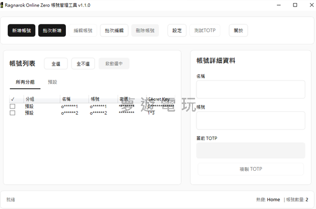 正文摘要:🚀《仙境傳說 Zero》ROZeroLoginer 帳號登入神器 懶人包 玩RO Zero還在慢慢打帳號密碼跟Google驗證碼?這篇要介紹的免費小工具讓你一鍵搞定! ✅ 主要功能: 專為《仙境傳說 Zero》設計的帳號管理與自動登入工具。 🔐 安全驗證: 完整支援 TOTP (Google Authenticator) 雙重驗證,帳號資料經 AES 加密儲存在你的電腦,安全有保障。 ⌨️ 一鍵登入: 只要按下自訂熱鍵(預設 HOME 鍵),就能秒選帳號自動登入,多分頁玩家救星! ✨ 下載簡單: 免安裝,下載後直接執行就能用。 👉 一句話總結: 告別手動輸入的痛苦,讓這款小工具幫你輕鬆登入遊戲! ROZeroLoginer 是什麼? 各位《仙境傳說 Zero》的玩家們,安安!你是否也覺得每次登入遊戲,都要手動輸入落落長的帳號、密碼,還要打開手機看那稍縱即逝的 TOTP 驗證碼,感到有點麻煩呢?特別是對於擁有多個帳號,或是需要頻繁重登的玩家來說,這過程簡直是精神時光屋。 今天就是要來介紹一款專為 RO Zero 玩家設計的帳號管理神器——ROZeroLoginer。這是一款現代化的帳號管理工具,可以幫你安全地儲存帳號資訊,並透過一個簡單的熱鍵,實現自動輸入帳號、密碼和 TOTP 驗證碼的「自動登入」功能!接下來的攻略會一步一步教大家如何設定與使用。 ROZeroLoginer 功能特色 在開始安裝前,我們先來看看這款工具有哪些強大的功能吧! 🔐 帳號加密儲存:你所有的帳號密碼等敏感資料,都會透過 AES 加密技術儲存在你自己的電腦上,不會上傳到任何外部伺服器。🔑 支援TOTP雙重驗證:完美整合以時間為基礎的動態密碼(Time-based One-Time Password),也就是我們常用的 Google Authenticator。🚀 全域熱鍵支援:在遊戲登入畫面,只要按下你設定的熱鍵(預設是 HOME 鍵),就能快速選擇要登入的帳號。🤖 自動登入功能:選擇帳號後,程式會自動幫你填入帳號、密碼和最新的TOTP驗證碼,超級方便!👁️ 遊戲視窗偵測:只有在偵測到《仙境傳說 Zero》的遊戲視窗時,熱鍵功能才會啟動,避免在做其他事情時誤觸。🎨 現代化介面:擁有乾淨、直覺的使用者介面,管理帳號或查看即時 TOTP 驗證碼都一目了然。 👉 GM後台版 遊戲 推薦 ⬇️⬇️⬇️ 快速玩各種二次元動漫手遊app 系統需求 在下載前,請先確認你的電腦符合以下基本需求: 作業系統: Windows 10 / 11必要元件: .NET Framework 4.8適用遊戲: 已啟用 TOTP 雙重驗證的《仙境傳說 Zero》 安裝教學:新手三步驟搞定 這款工具最棒的地方就是「免安裝」,下載下來就可以直接用囉! 首先,前往工具的官方發布頁面。 點我前往 ROZeroLoginer 下載頁面在頁面中找到最新的版本,點擊下載 ROZeroLoginer.exe 檔案。下載完成後,直接點兩下執行 ROZeroLoginer.exe 就可以開始使用了,完全不需要任何安裝步驟! 使用教學:如何設定與快速登入? 程式打開後,我們需要進行一些簡單的設定,才能開始享受一鍵登入的快感。 第一步:新增你的遊戲帳號 在程式主畫面,點擊「新增帳號」按鈕。依序輸入以下資訊: 帳號名稱: 給這個帳號一個你好記的名稱(例如:主帳號、小鐵匠)。使用者名稱: 你的遊戲登入帳號。密碼: 你的遊戲登入密碼。TOTP 密鑰: 這個是當初你設定 Google Authenticator 時,所顯示的那一長串英文數字組合的密鑰。 輸入完成後按下儲存即可。重複此步驟,可以新增多個帳號。 第二步:設定你習慣的熱鍵(可選) 如果你不喜歡預設的 HOME 鍵,可以點擊「設定」按鈕。在設定視窗中,你可以自訂喜歡的熱鍵組合來呼叫帳號選擇視窗。 第三步:體驗快速登入! 開啟《仙境傳說 Zero》遊戲,並停在登入畫面。按下你設定好的熱鍵(預設是 HOME 鍵)。畫面上會彈出一個小視窗,顯示你所有已儲存的帳號列表。使用鍵盤的上下鍵選擇你想要登入的帳號。按下 ENTER 鍵確認,程式就會奇蹟般地幫你把帳號、密碼、TOTP碼全部輸入完成! 鍵盤快捷鍵懶人包 HOME (或你自訂的熱鍵):開啟帳號選擇視窗ENTER:選擇目前反白的帳號並自動登入ESC:取消選擇,關閉帳號視窗 安全注意事項與免責聲明 根據開發者說明,所有敏感資料(帳號、密碼、密鑰)皆使用 AES 加密後儲存在你的本機電腦,不會傳輸到任何外部伺服器。TOTP 時間驗證碼的機制本身也為帳號提供了額外的安全保護。本工具僅為提供教育與便利目的而生,玩家需自行承擔使用風險。作者不對任何因使用本軟體可能產生的問題負責。 以下廣告滑動後還有帖子內容var custom_call_MIR = function (params) {if ( params === null || params.hasAd === false ) {var divRowSide;for (let index = 0; index < ONEADs.length; index++) {if (ONEADs[index].pub.player_mode === "mobile-inread") {divRowSide = ONEADs[index].pub.slotobj;}}var ins = document.createElement('ins');ins.className = 'clickforceads';ins.setAttribute('style', 'display:inline-block;');ins.setAttribute('data-ad-zone', '18264');divRowSide.appendChild(ins);var js = document.createElement('script');js.async = true;js.type = 'text/javascript';js.setAttribute('src', '//cdn.holmesmind.com/js/init.js');js.onload = function(){console.log('[ONEAD MIR] ClickForce Loaded');};divRowSide.appendChild(js);}};var _ONEAD = {};_ONEAD.pub = {};_ONEAD.pub.slotobj = document.getElementById("oneadMIRDFPTag");_ONEAD.pub.slots = ["div-onead-ad"];_ONEAD.pub.uid = "1000509";_ONEAD.pub.external_url = "https://onead.onevision.com.tw/";_ONEAD.pub.scopes = ["spotbuy", "speed"];_ONEAD.pub.player_mode_div = "div-onead-ad";_ONEAD.pub.player_mode = "mobile-inread";_ONEAD.pub.queryAdCallback = custom_call_MIR;var ONEAD_pubs = ONEAD_pubs || [];ONEAD_pubs.push(_ONEAD);var truvid
