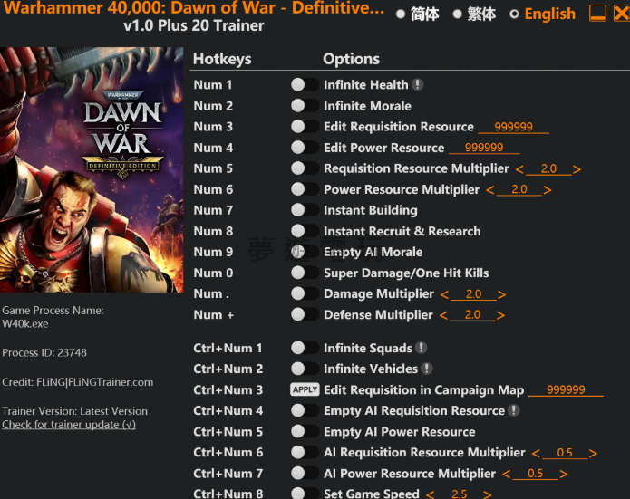 正文摘要:replyreload += ',' + 2401695; 🚀《戰槌40,000:破曉之戰》決定版 玩家福音來啦! 還在為資源不夠、單位一直死而煩惱嗎?這款 風靈月影修改器 讓你輕鬆過關斬將! ✨ 主要功能:無限生命、無限資源、一擊秒殺、即時建造與研發通通有!🎮 版本支援:遊戲版本 v1.0 以上皆可使用。🔗 快速上手:本篇提供完整功能介紹、新手安裝教學與檔案下載點,讓你一看就懂! 本文章目錄 修改器功能介紹document.currentScript.previousElementSibling.href = location.href.split('#')[0] + '#func_intro'; 安裝與使用教學document.currentScript.previousElementSibling.href = location.href.split('#')[0] + '#install_guide'; 檔案下載點 🔽document.currentScript.previousElementSibling.href = location.href.split('#')[0] + '#download_point'; 《戰槌40,000:破曉之戰》修改器_常見問題Q&Adocument.currentScript.previousElementSibling.href = location.href.split('#')[0] + '#faq'; 《戰槌40K:破曉之戰》決定版 風靈月影修改器介紹 各位指揮官,安安!本篇要分享的是由風靈月影大神製作,針對《戰槌40,000:破曉之戰》決定版 (Warhammer 40,000: Dawn of War - Definitive Edition) 的專用修改器工具。如果你在戰役中卡關,或是單純想體驗一下當神的快感,這款修改器提供了包含無限資源、無限部隊、超級傷害等總共20項超實用功能,保證讓你橫掃戰場! 以下將會詳細說明各項功能以及如何安裝使用,幫助你快速上手。 👉 GM後台版 遊戲 推薦 ⬇️⬇️⬇️ 快速玩各種二次元動漫手遊app 修改器功能介紹 這款修改器功能非常全面,從玩家自身強化到削弱敵方AI都有,以下是各項功能的熱鍵與效果說明: 玩家強化功能 數字鍵 1 – 無限生命 (Infinite Health) 數字鍵 2 – 無限士氣 (Infinite Morale) 數字鍵 7 – 建築物秒蓋 (Instant Building) 數字鍵 8 – 單位、科技秒完成 (Instant Recruit & Research) 數字鍵 0 – 超級傷害 / 一擊必殺 (Super Damage/One Hit Kills) Ctrl+數字鍵 1 – 無限小隊人口 (Infinite Squads) Ctrl+數字鍵 2 – 無限載具人口 (Infinite Vehicles) 資源與數值調整 數字鍵 3 – 編輯請求資源 (Edit Requisition Resource) 數字鍵 4 – 編輯能量資源 (Edit Power Resource) 數字鍵 5 – 請求資源獲取倍率 (Requisition Resource Multiplier) 數字鍵 6 – 能量資源獲取倍率 (Power Resource Multiplier) 數字鍵 . – 傷害倍率調整 (Damage Multiplier) 數字鍵 + – 防禦倍率調整 (Defense Multiplier) Ctrl+數字鍵 3 – 編輯戰役地圖請求資源 (Edit Requisition in Campaign Map) Ctrl+數字鍵 8 – 設定遊戲速度 (Set Game Speed) 削弱敵人AI功能 數字鍵 9 – 清空敵人AI士氣 (Empty AI Morale) Ctrl+數字鍵 4 – 清空敵人AI請求資源 (Empty AI Requisition Resource) Ctrl+數字鍵 5 – 清空敵人AI能量資源 (Empty AI Power Resource) Ctrl+數字鍵 6 – 調整敵人AI請求資源倍率 (AI Requisition Resource Multiplier) Ctrl+數字鍵 7 – 調整敵人AI能量資源倍率 (AI Power Resource Multiplier) 安裝與使用教學 對於新手玩家來說,不知道修改器怎麼用是很正常的。別擔心,只要跟著下面的步驟操作,保證你也能輕鬆上手! 下載並解壓縮:首先,從下方的下載點取得修改器檔案,並將它解壓縮到任何你方便存取的地方。 啟動遊戲:先正常地從Steam或其他平台開啟《戰槌40,000:破曉之戰》決定版,然後進入主選單或讀取存檔。 執行修改器:接著,以系統管理員身分執行剛剛解壓縮出來的修改器程式(.exe檔)。 按下熱鍵:進入遊戲後,根據上面功能列表的需求,按下對應的熱鍵即可開啟或關閉該功能。聽到提示音效就代表成功囉! 檔案下載點 🔽 檔案名稱:Warhammer 40,000 Dawn of War Definitive Edition v1.0 Plus 20 Trainer.exe 最後更新:2025.08.17 下載連結: 所有站內附件皆會附上安全掃描報告請會員查看純淨度百分比後判斷使用(adsbygoogle = window.adsbygoogle || []).push({});相關檔案須知:取得檔案前,請先詳細閱讀文章內容避免不必要錯誤與誤會發生。也可多參考文章討論樓層內容了解附件檔案相關討論資訊。 【此文章部分內容隱藏中】 解除隱藏說明教學點擊下方 繼續閱讀文章 後請仔細觀看文章內容 並依照指示進行下一步最後完成解除隱藏後系統會回到此文章自動顯示隱藏內容~繼續閱讀 《戰槌40,000:破曉之戰》修改器_常見問題Q&A Q:為什麼我按了熱鍵卻沒有反應? A:請確認幾件事:第一,遊戲版本是否為v1.0或更新版本。第二,修改器是否以「系統管理員身分」執行。第三,某些防毒軟體可能會阻擋修改器,可以嘗試暫時關閉或將修改器加入白名單。 Q:使用這個修改器會被封鎖帳號嗎? A:強烈建議只在「單人戰役模式」或與朋友私下對戰時使用。如果在線上多人配對模式中使用,極有可能會因為作弊而被遊戲系統偵測並封鎖帳號,請務必注意。 Q:資源或傷害的「倍率」功能要怎麼使用? A:這類功能通常是在你開啟修改器後,可以在修改器的介面上輸入你想要的倍數(例如2倍、10倍),能讓你更彈性地調整遊戲難度,而不是鎖死一個固定數值。 Q:下載檔案時,防毒軟體跳出警告,這正常嗎? A:修改器因為需要讀取遊戲記憶體數據,所以很容易被防毒軟體誤判為病毒或惡意程式,這是常見的「誤報」情況。如果你是從風靈月影的官方來源下載,通常是安全的。你可以自行決定是否要信任並將其加入防毒軟體的排除清單。 Q:要如何關閉已經開啟的功能? A:大部分的修改器功能都是開關式的,只要再按一次相同的熱鍵,就可以關閉該功能。你會聽到不同的提示音效來區別是開啟還是關閉。 replyreload += ',