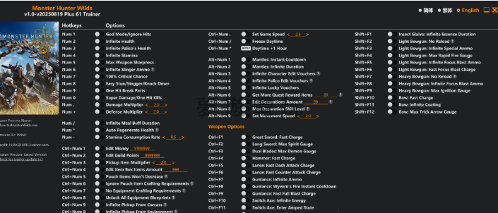 正文摘要:🔥 《魔物獵人 荒野》修改器懶人包 🔥 獵人們,想輕鬆狩獵嗎?這份攻略教你怎麼用FLiNG大神製作的61項功能修改器,讓你秒變高手! 核心功能:上帝模式、無限血量耐力、一擊必殺、無限道具、免製作材料,還有各種武器專屬神技!💪 安裝注意:這款修改器需要搭配「REFramework」前置插件才能用喔! 快速上手:只要下載REFramework,把一個檔案丟進遊戲資料夾,再啟動修改器就搞定啦! 省流教學:詳細步驟和下載點都在下面,跟著做準沒錯! 本文章目錄 修改器功能介紹document.currentScript.previousElementSibling.href = location.href.split('#')[0] + '#features'; - 玩家戰鬥相關document.currentScript.previousElementSibling.href = location.href.split('#')[0] + '#features_player'; - 系統與資源相關document.currentScript.previousElementSibling.href = location.href.split('#')[0] + '#features_system'; - 各武器專屬功能document.currentScript.previousElementSibling.href = location.href.split('#')[0] + '#features_weapon'; 安裝與使用教學document.currentScript.previousElementSibling.href = location.href.split('#')[0] + '#installation'; 檔案下載點 🔽document.currentScript.previousElementSibling.href = location.href.split('#')[0] + '#download'; 常見問題Q&Adocument.currentScript.previousElementSibling.href = location.href.split('#')[0] + '#faq'; 《魔物獵人 荒野》61項功能修改器介紹 各位獵人安安!這次要分享的是由知名修改器作者FLiNG所製作,針對《魔物獵人 荒野》的超強輔助工具。這款修改器提供了多達61項的自訂功能,從基本的上帝模式、無限耐力,到進階的傷害倍率調整、免材料製作等應有盡有,能大幅降低狩獵的難度。本篇攻略將會一步一步教你如何正確安裝與使用,讓你輕鬆成為頂尖獵人! 👉 GM後台版 遊戲 推薦 ⬇️⬇️⬇️ 快速玩各種二次元動漫手遊app 修改器功能介紹 (共61項) 這款修改器功能超多,底下幫大家整理成幾個類別,方便快速查找! 玩家戰鬥相關 數字鍵 1 – 上帝模式/無視攻擊 數字鍵 2 – 無限生命 數字鍵 3 – 隨從無限生命 數字鍵 4 – 無限耐力 數字鍵 5 – 武器斬味最大 數字鍵 6 – 投射器彈藥無限 數字鍵 7 – 100% 會心率 數字鍵 8 – 容易造成魔物昏厥/失衡/倒地 數字鍵 9 – 一擊破壞部位 數字鍵 0 – 超級傷害/一擊必殺 數字鍵 . – 傷害倍率調整 數字鍵 + – 防禦倍率調整 數字鍵 / – 貓飯效果無限持續 數字鍵 * – 自動回復生命 數字鍵 - – 耐力消耗率調整 Alt+數字鍵 1 – 特殊衣裝瞬間冷卻 Alt+數字鍵 2 – 特殊衣裝無限持續時間 Alt+數字鍵 8 – 裝飾品技能等級最大化 Alt+數字鍵 9 – 設定移動速度 系統與資源相關 Ctrl+數字鍵 1 – 編輯持有金錢 Ctrl+數字鍵 2 – 編輯公會點數 Ctrl+數字鍵 3 – 採集道具倍率 Ctrl+數字鍵 4 – 編輯道具箱內物品數量 Ctrl+數字鍵 5 – 隨身袋道具不減 Ctrl+數字鍵 6 – 無視隨身袋道具調合材料 Ctrl+數字鍵 7 – 無視裝備製作材料 Ctrl+數字鍵 8 – 解鎖所有裝備藍圖 Ctrl+數字鍵 9 – 無限剝取魔物素材 Ctrl+數字鍵 0 – 無限採集環境素材 Ctrl+數字鍵 . – 設定遊戲速度 Ctrl+數字鍵 / – 凍結時間 Ctrl+數字鍵 * – 時間快轉一小時 Alt+數字鍵 3 – 無限角色編輯券 Alt+數字鍵 4 – 無限隨從編輯券 Alt+數字鍵 5 – 無限幸運券 Alt+數字鍵 6 – 獲得更多任務獎勵道具 Alt+數字鍵 7 – 編輯裝飾品數量 各武器專屬功能 Ctrl+F1 – 大劍:快速蓄力 Ctrl+F2 – 太刀:練氣槽最大 Ctrl+F3 – 雙劍:鬼人計量表最大 Ctrl+F4 – 大錘:快速蓄力 Ctrl+F5 – 長槍:快速衝刺攻擊蓄力 Ctrl+F6 – 長槍:快速反擊攻擊蓄力 Ctrl+F7 – 銃槍:彈藥無限 Ctrl+F8 – 銃槍:龍擊砲瞬間冷卻 Ctrl+F9 – 銃槍:快速全彈發射蓄力 Ctrl+F10 – 斬擊斧:能量無限 Ctrl+F11 – 斬擊斧:直接進入高出力狀態 Ctrl+F12 – 充能斧:強化效果無限持續 Shift+F1 – 操蟲棍:獵蟲精華無限持續 Shift+F2 – 輕弩:免裝填 Shift+F3 – 輕弩:特殊彈藥無限 Shift+F4 – 輕弩:速射計量表最大 Shift+F5 – 輕弩:起爆龍彈無限 Shift+F6 – 輕弩:起爆龍彈快速蓄力 Shift+F7 – 重弩:免裝填 Shift+F8 – 重弩:狙擊龍彈無限 Shift+F9 – 重弩:機關龍彈計量表最大 Shift+F10 – 弓:快速蓄力 Shift+F11 – 弓:瓶無限 Shift+F12 – 弓:秘箭計量表最大 安裝與使用教學 這款修改器需要一個名為「REFramework」的前置插件來繞過遊戲的保護機制。請務必跟著以下步驟操作,才能成功啟用喔! 安裝步驟 新手懶人包 首先,你需要下載 REFramework。下載解壓縮後,找到裡面的 dinput8.dll 這個檔案,把它複製到你的遊戲安裝根目錄下(也就是能找到 MonsterHunterWilds.exe 的那個資料夾)。 接著,直接啟動遊戲,REFramework 就會自動載入。然後你就可以打開從本篇下載的修改器,開始享受各種便利功能啦! 重要注意事項 如果遊戲未來有更新,可能會導致 REFramework 或修改器失效。你可以到 REFramework 的官方 Github 頁面下載最新版本來解決這個問題。 REFramework 最新版下載點: https://github.com/praydog/REFramework-nightly/releases 修改器檔案下載點 🔽 檔案名稱: Monster.Hunter.Wilds.v1.0-v20250819.Plus.61.Trainer-FLiNG.rar 下載連結: https://pixeldrain.com/u/96Hz8XhK 以下廣告滑動後還有帖子內容var custom_call_MIR = function (params) {if ( params === null || params.hasAd === false ) {var divRowSide;for (let index = 0; index < ONEADs.length; index++) {if (ONEADs[index].pub.player_mode === "mobile-inread") {divRowSide = ONEADs[index].pub.slotobj;}}var ins = document.createElement('ins');ins.className = 'clickforceads';ins.setAttribu