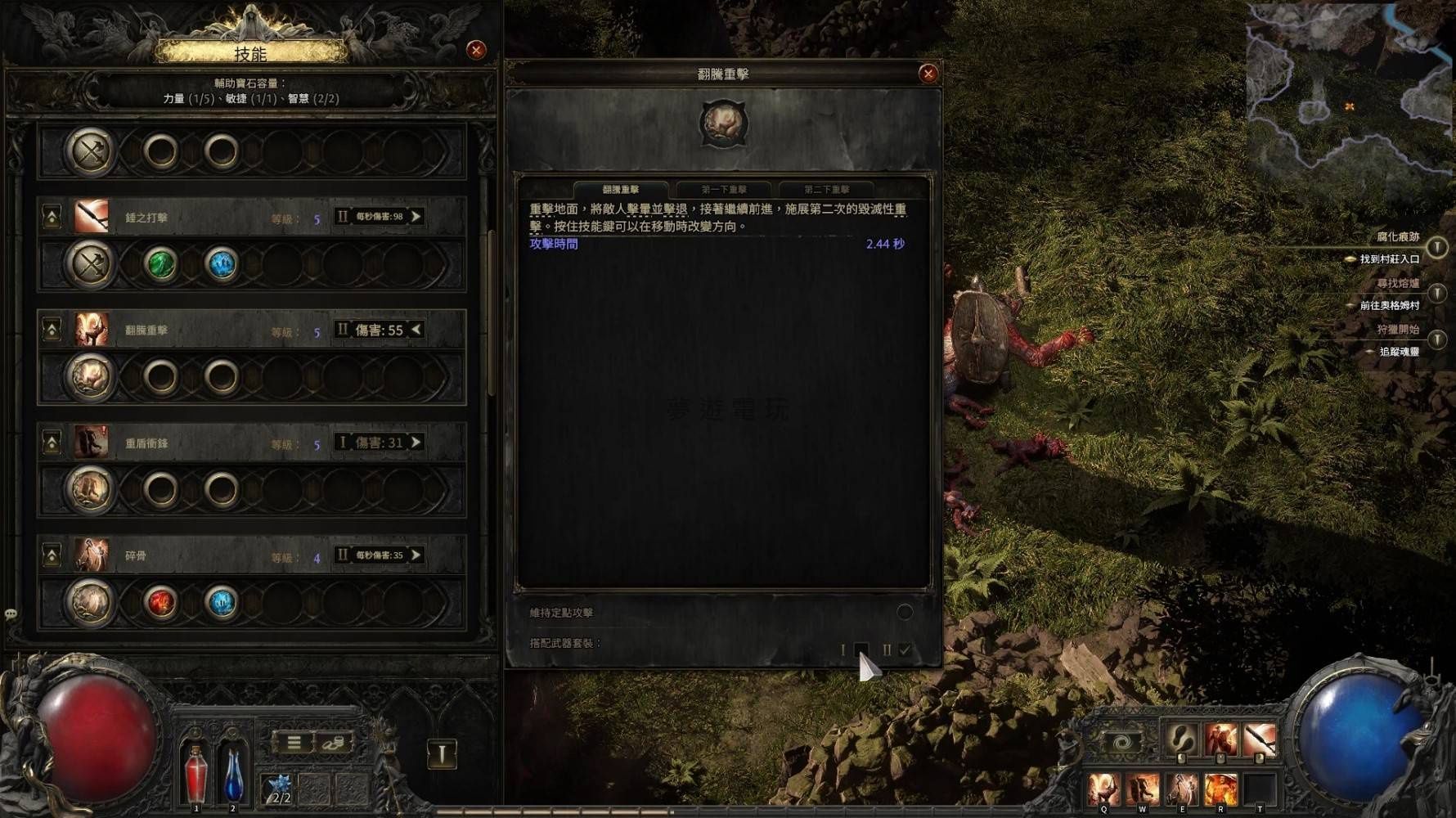 正文摘要:戰士碎骨爆炸流開荒懶人包! 🔰新手必玩,輕鬆從開荒爽到畢業。重點抓準黃點傷害,所有技能都用雙手錘觸發!記得學「脫離戰鬥」技能,讓位移更順暢! 本篇攻略目錄 BD構築、注意事項與天賦配置document.currentScript.previousElementSibling.href = location.href.split('#')[0] + '#build_overview'; 天賦點法參考document.currentScript.previousElementSibling.href = location.href.split('#')[0] + '#talent_ref'; 核心技能連結與說明document.currentScript.previousElementSibling.href = location.href.split('#')[0] + '#skill_links'; 裝備詞綴選擇建議document.currentScript.previousElementSibling.href = location.href.split('#')[0] + '#gear_tips'; 機動性提升:脫離戰鬥技能取得document.currentScript.previousElementSibling.href = location.href.split('#')[0] + '#mobility_guide'; 第一章:開荒流程與技能運用document.currentScript.previousElementSibling.href = location.href.split('#')[0] + '#chapter1_guide'; 第二章:核心技能取得與裝備更新document.currentScript.previousElementSibling.href = location.href.split('#')[0] + '#chapter2_guide'; 第三章:後期天賦與裝備強化document.currentScript.previousElementSibling.href = location.href.split('#')[0] + '#chapter3_guide'; 《流亡黯道2》戰士碎骨爆炸流常見問題Q&Adocument.currentScript.previousElementSibling.href = location.href.split('#')[0] + '#faq'; BD構築、注意事項與天賦配置 各位《流亡黯道2》的玩家們大家好!如果你是剛接觸遊戲的新手,或是想找一個操作簡單、練功打寶都輕鬆的職業,那戰士絕對是你的最佳選擇。戰士不僅容易上手,在遊戲初期開荒打劇情時更是順暢無比。本篇攻略將深入整理「碎骨爆炸流」戰士的詳細開荒教學,幫助你輕鬆度過劇情,一路成長為遊戲後期的強力角色! 戰士可說是《流亡黯道2》中最適合萌新(新手)的職業了。它的優點是能夠非常舒適地度過遊戲前期的劇情階段,而且到了遊戲後期,無論是刷圖效率還是攻擊能力都表現亮眼,也是許多高手玩家常駐的熱門玩法之一。過去在劇情開荒階段,戰士曾有圖騰流和碎骨爆炸流兩種主流玩法,但經過數個賽季的調整與演變,目前僅剩下碎骨爆炸流作為戰士最主要的開荒 BD(Build Development,角色構築)。今天,我們將為大家帶來最詳盡的碎骨爆炸流開荒教學。 最棒的是,這套 BD 不僅適合開荒,在遊戲後期也能持續發揮強大威力,讓你輕鬆挑戰並全破所有高難度內容! 重要注意事項:掌握「小黃點」機制 傷害平衡是關鍵: 這套流派的核心玩法,在於每一次攻擊都能在怪物身上打出「小黃點」,這代表你對敵人造成了有效的眩暈或特殊觸發。因此,我們需要隨時注意技能造成的傷害,切記不可過高,也不可過低。若傷害過高可能直接擊殺敵人導致無法觸發,過低則難以打出小黃點。 「壓倒性力量」輔助寶石: 這個輔助寶石是否裝備,完全取決於你當前的傷害需求。如果你的傷害已經足夠應付敵人,那麼可以完全不用連結這個寶石,省下寶石插槽給其他更有用的輔助。 武器綁定: 在學習任何新技能之後,務必手動調整該技能所使用的武器。請確保每一次技能釋放,都必須是由你的「雙手錘」來觸發,這是這套 BD 傷害輸出的基礎。 調整天賦以適應裝備: 為了能夠裝備這把武器,我甚至為此修改了我的天賦配置,投入了大量的屬性點,以達到換裝的要求。 輕鬆全破劇情: 一旦你的角色成形,搭配上這樣一把強力武器,基本上後面的劇情就是一路「秒秒秒」的碾壓過去了! 防具與生存: 之後的章節主要是按部就班地跑圖推進,重點在於持續更新你的防具。藉由戰士技能本身超高的傷害係數,再搭配一把合適的武器,絕對足以讓你輕鬆全破所有劇情內容。後續的細節就不再一一贅述,大家只要盡可能地堆疊你的抗性,提升生存能力即可。 延伸閱讀 更多《流亡黯道2》相關攻略與資訊,請點擊此處前往專區。 以下廣告滑動後還有帖子內容var custom_call_MIR = function (params) {if ( params === null || params.hasAd === false ) {var divRowSide;for (let index = 0; index < ONEADs.length; index++) {if (ONEADs[index].pub.player_mode === "mobile-inread") {divRowSide = ONEADs[index].pub.slotobj;}}var ins = document.createElement('ins');ins.className = 'clickforceads';ins.setAttribute('style', 'display:inline-block;');ins.setAttribute('data-ad-zone', '18264');divRowSide.appendChild(ins);var js = document.createElement('script');js.async = true;js.type = 'text/javascript';js.setAttribute('src', '//cdn.holmesmind.com/js/init.js');js.onload = function(){console.log('[ONEAD MIR] ClickForce Loaded');};divRowSide.appendChild(js);}};var _ONEAD = {};_ONEAD.pub = {};_ONEAD.pub.slotobj = document.getElementById("oneadMIRDFPTag");_ONEAD.pub.slots = ["div-onead-ad"];_ONEAD.pub.uid = "1000509";_ONEAD.pub.external_url = "https://onead.onevision.com.tw/";_ONEAD.pub.scopes = ["spotbuy", "speed"];_ONEAD.pub.player_mode_div = "div-onead-ad";_ONEAD.pub.player_mode = "mobile-inread";_ONEAD.pub.queryAdCallback = custom_call_MIR;var ONEAD_pubs = ONEAD_pubs || [];ONEAD_pubs.push(_ONEAD);var truvidScript = document.createElement('script'); truvidScript.async = true; truvidScript.setAttribute('data-cfasync','false'); truvidScript.type = 'text/javascript'; truvidScript.src = '//stg.truvidplayer.com/index.php?sub_user_id=597&widget_id=3309&playlist_id=2381&m=a&cb=' + (Math.random() * 10000000000000000); var currentScript = document.currentScript || document.scripts[document.scripts.length - 1]; currentScript.parentNode.insertBefore(truvidScript, currentScript.nextSibling); 《流亡黯道2》戰士碎骨爆炸流常見問題Q&A Q:為什麼要選擇碎骨爆炸流作為開荒 BD? A: