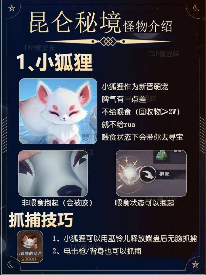 《超自然行動組》昆崙祕境怪物攻略! 小狐狸:餵飽飽帶你尋寶。 狐妖:看完舞蹈再抓,用電擊槍從背後吸。 木偶:新舊移速大不同,觀察就能輕鬆搞定! 本篇攻略目錄 小狐狸攻略:新寵物的互動與尋寶document.curren