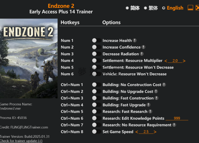 正文摘要:replyreload += ',' + 2402380; 《Endzone 2 末日地帶2》修改器 快速閱讀精華 🔧 修改器功能: 本文提供由風靈月影製作的14項功能修改器,包含資源、建造、研究等全方位輔助。🔽 檔案下載: 文末提供最新版修改器的直接下載點,讓你快速取得工具。🔑 核心亮點: 無限資源: settlement (聚落) 和 vehicle (載具) 的資源都不會減少。免費建設: 建築和升級都不需要任何材料。瞬間完工: 建造、升級、研究通通都能快速完成。 🎮 支援版本: 遊戲版本 Early Access+。 .article-toc { border: 1px solid #ddd; padding: 15px; background: #f9f9f9; border-radius: 6px; margin: 20px 0; width: 90%;}.article-toc br { display: none;}.toc-title { /* --- 以下是合併進來的 H2 樣式 --- */ font-size: 1.25em; /* 125% */ border-left: 5px solid #2A98DA; border-radius: 2px; padding: 5px 0px 5px 10px; font-weight: bold; margin: 0 0 15px 0; /* 調整了 margin,只留下方 15px */ color: #333; line-height: 1.5; background-color: #f8f8f8; /* --- 樣式合併結束 --- */}.toc-list { list-style: none; padding-left: 0;}.toc-list li { margin: 8px 0;}.toc-list a { color: #2A98DA; text-decoration: none;}.toc-list a:hover { text-decoration: underline;}.back-to-top { display: block; margin-top: 10px; font-size: 0.9em; color: #666;}本文章目錄修改器功能介紹document.currentScript.previousElementSibling.href = location.href.split('#')[0] + '#features';修改器下載點 🔽document.currentScript.previousElementSibling.href = location.href.split('#')[0] + '#download';使用前注意事項document.currentScript.previousElementSibling.href = location.href.split('#')[0] + '#notes';常見問題Q&Adocument.currentScript.previousElementSibling.href = location.href.split('#')[0] + '#faq'; 如果你在《Endzone 2 末日地帶2》的末日世界中生存得有點辛苦,或是想專心體驗建設的樂趣,那麼這款由知名開發者「風靈月影」所製作的修改器,絕對能幫上大忙。本篇攻略將詳細整理這款修改器的所有功能,並提供最新的下載連結,幫助你輕鬆上手。 👉 GM後台版 遊戲 推薦 ⬇️⬇️⬇️ 快速玩各種二次元動漫手遊app Endzone 2 修改器功能介紹 (vEarly Access+) 這款修改器總共提供了14項實用的功能,涵蓋了生存、資源、建設與研究等各個層面。玩家可以根據自己的需求,透過對應的熱鍵來啟用。 角色與環境控制 數字鍵 1 – 增加生命值 (Increase Health)數字鍵 2 – 增加信心 (Increase Confidence)數字鍵 3 – 降低輻射 (Decrease Radiation) 資源管理 數字鍵 4 – 聚落:資源倍增 (Settlement: Resource Multiplier)數字鍵 5 – 聚落:資源不減 (Settlement: Resource Won’t Decrease)數字鍵 6 – 載具:資源不減 (Vehicle: Resource Won’t Decrease) 建築與研究加速 Ctrl + 數字鍵 1 – 建築:無建造費用 (Building: No Construction Cost)Ctrl + 數字鍵 2 – 建築:無升級費用 (Building: No Upgrade Cost)Ctrl + 數字鍵 3 – 建築:快速建造 (Building: Fast Construction)Ctrl + 數字鍵 4 – 建築:快速升級 (Building: Fast Upgrade)Ctrl + 數字鍵 5 – 研究:快速研究 (Research: Fast Research)Ctrl + 數字鍵 6 – 研究:編輯知識點數 (Research: Edit Knowledge Points)Ctrl + 數字鍵 7 – 研究:無資源需求 (Research: No Resource Requirement) 遊戲速度 Ctrl + 數字鍵 8 – 設定遊戲速度 (Set Game Speed) 風靈月影《Endzone 2》修改器下載點 🔽 請點擊下方連結下載修改器檔案。建議使用前先關閉防毒軟體,避免檔案被誤判為病毒。 檔案名稱: Endzone 2 Early Access Plus 14 Trainer Updated 2025.08.24.exe 所有站內附件皆會附上安全掃描報告請會員查看純淨度百分比後判斷使用(adsbygoogle = window.adsbygoogle || []).push({});相關檔案須知:取得檔案前,請先詳細閱讀文章內容避免不必要錯誤與誤會發生。也可多參考文章討論樓層內容了解附件檔案相關討論資訊。 【此文章部分內容隱藏中】 解除隱藏說明教學點擊下方 繼續閱讀文章 後請仔細觀看文章內容 並依照指示進行下一步最後完成解除隱藏後系統會回到此文章自動顯示隱藏內容~繼續閱讀 使用前注意事項 使用任何第三方工具前,強烈建議備份你的遊戲存檔,以防萬一。修改器僅限於單人模式使用,請勿在任何形式的多人連線模式下開啟,以免帳號被鎖。當遊戲版本更新後,舊版修改器可能會失效,需等待作者釋出對應新版本的更新。 Endzone 2 修改器 常見問題Q&A Q:這個修改器支援哪個遊戲版本? A:根據作者提供的資訊,此修改器支援《Endzone 2 末日地帶2》的「Early Access+」版本。 Q:為什麼我啟動修改器後,遊戲閃退或功能沒反應? A:請先確認幾件事: 你的遊戲版本是否與修改器支援的版本相符。是否以系統管理員權限執行修改器。防毒軟體或Windows Defender是否阻擋了修改器的運作。 Q:使用修改器會不會讓遊戲檔案壞掉? A:一般情況下不會直接損壞遊戲主程式,但有可能會造成遊戲存檔異常。這也是為什麼我們一再強調,使用前一定要先備份存檔。 Q:下載連結失效了怎麼辦? A:檔案分享連結有時效性,如果連結失效,建議直接前往「風靈月影」的發布頁面尋找最新的版本。 replyreload += ',' + 2402380; |