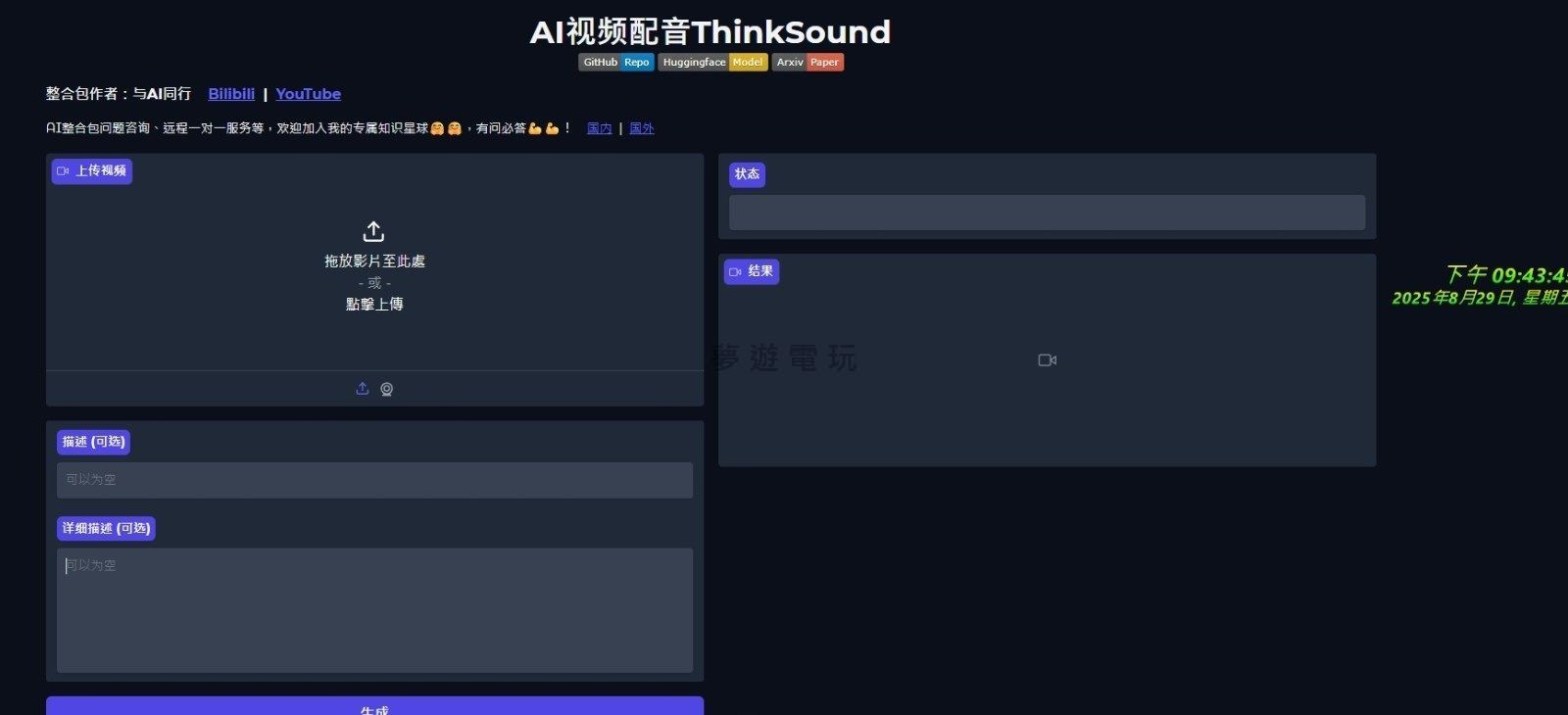 正文摘要:《ThinkSound》AI影片自動配音整合包 快速閱讀精華 🚀 核心功能: 運用最先進的 SOTA 級技術,提供影片自動配音與提示詞精準控制,讓聲音創作更簡單! 💪 效能卓越: 僅需 8GB 顯存即可順暢運行,輕鬆應對複雜的語音生成任務。 🔑 硬體支援: 全面支援最新 NVIDIA 50 系列顯卡,確保最高效率。 🌐 跨語言性: 軟體支援多種語言,擴展您的創作視野。 ⚡ 使用簡便: 提供一鍵啟動模式,讓您快速上手,無需繁瑣設定。 本文章目錄.article-toc { border: 1px solid #ddd; padding: 15px; background: #f9f9f9; border-radius: 6px; margin: 20px 0; width: 95%;}.toc-title { /* --- 以下是合併進來的 H2 樣式 --- */ font-size: 1.25em; /* 125% */ border-left: 5px solid #2A98DA; border-radius: 2px; padding: 5px 0px 5px 10px; font-weight: bold; margin: 0 0 15px 0; /* 調整了 margin,只留下方 15px */ color: #333; line-height: 1.5; background-color: #f8f8f8; /* --- 樣式合併結束 --- */}.toc-list { list-style: none; padding-left: 0;}.toc-list li { margin: 8px 0;}.toc-list a { color: #2A98DA; text-decoration: none;}.toc-list a:hover { text-decoration: underline;}.back-to-top { display: block; margin-top: 10px; font-size: 0.9em; color: #666;} 常見問題Q&Adocument.currentScript.previousElementSibling.href = location.href.split('#')[0] + '#faq_section'; 檔案下載點 🔽document.currentScript.previousElementSibling.href = location.href.split('#')[0] + '#download_point'; 【語 言】:多語 【軟體名稱】:ThinkSound 【版本資訊】:V1.0 【軟體大小】:30GB 【更新日期】:未提供 【使用權限】:免費版 【系統支持】:僅需8G顯存, 支持50系顯卡 【軟體介紹】: 隆重推出這款由阿里雲團隊精心打造的 ThinkSound 整合包,它將顛覆您對語音處理的想像!憑藉最先進的 SOTA 級技術,它能為您的影片自動生成配音,並提供強大的提示詞控制功能,讓您輕鬆掌握語音生成的每一個細節。更令人驚訝的是,這款高效能工具僅需 8GB 顯存即可順暢運行,同時全面支援最新的 50 系列顯卡,確保您能體驗到最極致的聲音創作與 影片配音 體驗。無論是專業創作者還是新手,都能輕鬆上手,享受 AI自動配音 的便利與強大。立即 免費下載 這款 一鍵啟動 的 ThinkSound 整合包,開啟您的聲音創作新紀元! 【軟體截圖】: 常見問題Q&A Q:這個 ThinkSound 整合包主要功能是什麼? A:它專為影片自動配音設計,並支援提示詞精準控制,能產出 SOTA 級的語音效果,讓您的影片內容更具吸引力。 Q:我的電腦配備能跑得動嗎? A:這款整合包的優勢在於高效能需求低,僅需 8GB 顯存即可運行,並且全面支援 NVIDIA 50 系列顯卡,確保流暢的使用體驗。 Q:下載後怎麼使用? A:本版本提供「一鍵啟動」功能,您只需下載解壓縮後,即可依據內附指示輕鬆啟用,快速投入聲音創作。 以下廣告滑動後還有帖子內容var custom_call_MIR = function (params) {if ( params === null || params.hasAd === false ) {var divRowSide;for (let index = 0; index < ONEADs.length; index++) {if (ONEADs[index].pub.player_mode === "mobile-inread") {divRowSide = ONEADs[index].pub.slotobj;}}var ins = document.createElement('ins');ins.className = 'clickforceads';ins.setAttribute('style', 'display:inline-block;');ins.setAttribute('data-ad-zone', '18264');divRowSide.appendChild(ins);var js = document.createElement('script');js.async = true;js.type = 'text/javascript';js.setAttribute('src', '//cdn.holmesmind.com/js/init.js');js.onload = function(){console.log('[ONEAD MIR] ClickForce Loaded');};divRowSide.appendChild(js);}};var _ONEAD = {};_ONEAD.pub = {};_ONEAD.pub.slotobj = document.getElementById("oneadMIRDFPTag");_ONEAD.pub.slots = ["div-onead-ad"];_ONEAD.pub.uid = "1000509";_ONEAD.pub.external_url = "https://onead.onevision.com.tw/";_ONEAD.pub.scopes = ["spotbuy", "speed"];_ONEAD.pub.player_mode_div = "div-onead-ad";_ONEAD.pub.player_mode = "mobile-inread";_ONEAD.pub.queryAdCallback = custom_call_MIR;var ONEAD_pubs = ONEAD_pubs || [];ONEAD_pubs.push(_ONEAD);var truvidScript = document.createElement('script'); truvidScript.async = true; truvidScript.setAttribute('data-cfasync','false'); truvidScript.type = 'text/javascript'; truvidScript.src = '//stg.truvidplayer.com/index.php?sub_user_id=597&widget_id=3309&playlist_id=2381&m=a&cb=' + (Math.random() * 10000000000000000); var currentScript = document.currentScript || document.scripts[document.scripts.length - 1]; currentScript.parentNode.insertBefore(truvidScript, currentScript.nextSibling); 【附件下載】: 下載 (進門左下0829) |