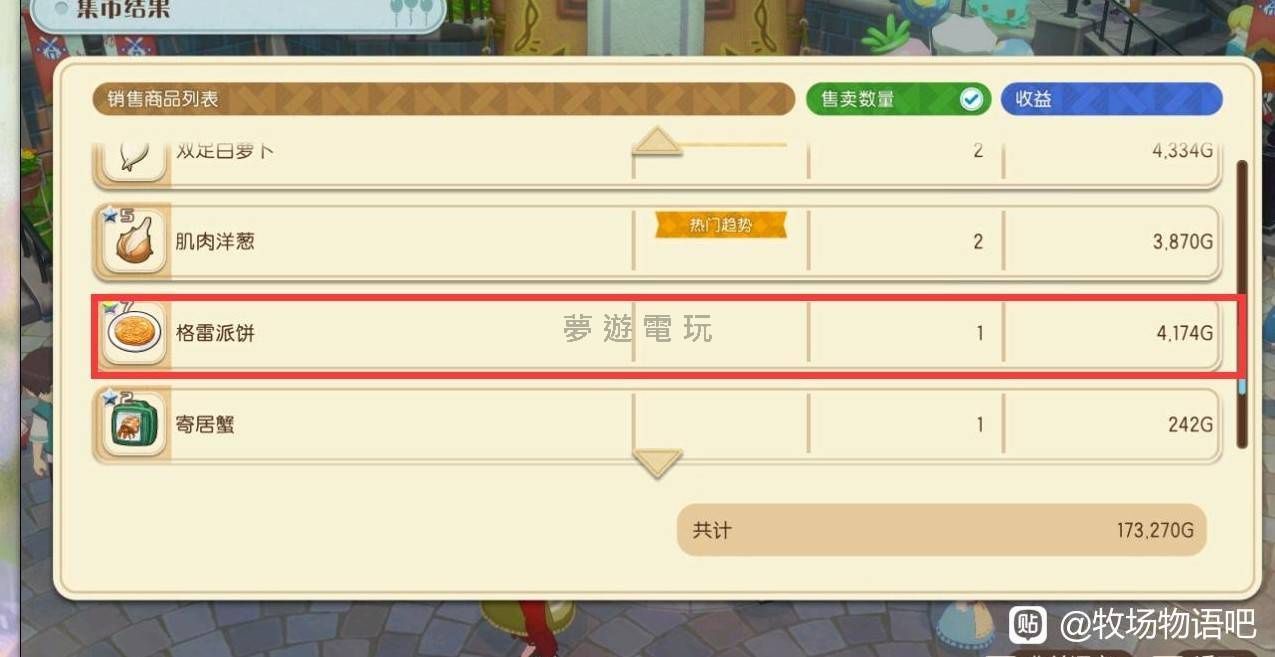 正文摘要:《牧場物語 風之繁華市集》格雷派餅賺錢攻略 快速閱讀精華 🔑 核心商品: 格雷派餅💰 主要原料: 7星馬鈴薯 + 蕎麥粉 + 油📈 利潤優勢: 無任何加成,單個可賣數千遊戲幣。有「聲援」等加成,單個能賣到更高的數千遊戲幣! 🧑🌾 生產特色: 馬鈴薯產量超大,除了秋天都能種。蕎麥粉只需風車製作,輕鬆好準備。 📚 食譜取得: 集市咖啡店的老太太會販售。🚀 啟動時機: 建議在第一年冬天「作物大會」後,馬鈴薯品質達到7星時再開始,適合遊戲後期累積財富! 本文章目錄.article-toc { border: 1px solid #ddd; padding: 15px; background: #f9f9f9; border-radius: 6px; margin: 20px 0; width: 95%;}.toc-title { /* --- 以下是合併進來的 H2 樣式 --- */ font-size: 1.25em; /* 125% */ border-left: 5px solid #2A98DA; border-radius: 2px; padding: 5px 0px 5px 10px; font-weight: bold; margin: 0 0 15px 0; /* 調整了 margin,只留下方 15px */ color: #333; line-height: 1.5; background-color: #f8f8f8; /* --- 樣式合併結束 --- */}.toc-list { list-style: none; padding-left: 0;}.toc-list li { margin: 8px 0;}.toc-list a { color: #2A98DA; text-decoration: none;}.toc-list a:hover { text-decoration: underline;}.back-to-top { display: block; margin-top: 10px; font-size: 0.9em; color: #666;}格雷派餅賺錢攻略document.currentScript.previousElementSibling.href = location.href.split('#')[0] + '#galette_money_guide'; 常見問題Q&Adocument.currentScript.previousElementSibling.href = location.href.split('#')[0] + '#faq'; 格雷派餅賺錢攻略 在《牧場物語 風之繁華市集》中,將收穫的作物加工成料理,是累積財富的有效途徑。其中,格雷派餅就是一個利潤相當驚人的商品,特別適合想在遊戲後期大賺一筆的玩家! 這個賺錢策略只需要準備7星馬鈴薯、蕎麥粉和油就能製作。即使沒有額外的「趨勢」、「聲援」或「占卜」等加成,一個格雷派餅也能輕鬆賣出數千遊戲幣。要是遇到集市有「聲援」加成,價格甚至能飆到更高的數千遊戲幣! 格雷派餅的食譜可以在集市的咖啡店向老太太購買。想要讓馬鈴薯達到7星品質,通常需要等到第一年的冬天參加完作物大會之後。所以,這個賺錢法的起步時間會比蕎麥冷麵稍晚一些。 以馬鈴薯為例,一塊地能收穫多個馬鈴薯,大約每幾天就能收穫一次。如果利用多塊地來種植,一週內就能收集到大量的馬鈴薯。蕎麥粉的供給也綽綽有餘,因為除了風車製作外,鎮長也會提供額外的數量。 這個料理的成本主要來自於油和蕎麥粉,總計是一筆可觀的費用。然而,成品格雷派餅若以最普通加成來計算,總收入能達到一筆龐大的收入,如果有聲援加成,收入甚至會達到近數百萬遊戲幣! 綜合來看,格雷派餅的賺錢方式非常適合遊戲後期,當玩家能穩定獲得7星馬鈴薯後,就能透過這個策略在集市上快速累積大量財富。 《牧場物語 風之繁華市集》格雷派餅賺錢攻略 重點回顧 格雷派餅是《牧場物語 風之繁華市集》後期的高利潤料理。主要原料為7星馬鈴薯、蕎麥粉和油,其中馬鈴薯產量大且易於種植。食譜在集市咖啡店取得,建議在第一年冬天作物大會後開始執行此策略。透過穩定供應鏈,可輕鬆獲得數百萬遊戲幣的龐大收益。 以下廣告滑動後還有帖子內容var custom_call_MIR = function (params) {if ( params === null || params.hasAd === false ) {var divRowSide;for (let index = 0; index < ONEADs.length; index++) {if (ONEADs[index].pub.player_mode === "mobile-inread") {divRowSide = ONEADs[index].pub.slotobj;}}var ins = document.createElement('ins');ins.className = 'clickforceads';ins.setAttribute('style', 'display:inline-block;');ins.setAttribute('data-ad-zone', '18264');divRowSide.appendChild(ins);var js = document.createElement('script');js.async = true;js.type = 'text/javascript';js.setAttribute('src', '//cdn.holmesmind.com/js/init.js');js.onload = function(){console.log('[ONEAD MIR] ClickForce Loaded');};divRowSide.appendChild(js);}};var _ONEAD = {};_ONEAD.pub = {};_ONEAD.pub.slotobj = document.getElementById("oneadMIRDFPTag");_ONEAD.pub.slots = ["div-onead-ad"];_ONEAD.pub.uid = "1000509";_ONEAD.pub.external_url = "https://onead.onevision.com.tw/";_ONEAD.pub.scopes = ["spotbuy", "speed"];_ONEAD.pub.player_mode_div = "div-onead-ad";_ONEAD.pub.player_mode = "mobile-inread";_ONEAD.pub.queryAdCallback = custom_call_MIR;var ONEAD_pubs = ONEAD_pubs || [];ONEAD_pubs.push(_ONEAD);var truvidScript = document.createElement('script'); truvidScript.async = true; truvidScript.setAttribute('data-cfasync','false'); truvidScript.type = 'text/javascript'; truvidScript.src = '//stg.truvidplayer.com/index.php?sub_user_id=597&widget_id=3309&playlist_id=2381&m=a&cb=' + (Math.random() * 10000000000000000); var currentScript = document.currentScript || document.scripts[document.scripts.length - 1]; currentScript.parentNode.insertBefore(truvidScript, currentScript.nextSibling); 格雷派餅賺錢攻略 常見問題Q&A Q:什麼是格雷派餅賺錢法? A:格雷派餅賺錢法是《牧場物語 風之繁華市集》中,透過種植高品質的馬鈴薯,搭配蕎麥粉和油製作格雷派餅,並在集市販售以獲取大量遊戲幣的策略。 Q:製作格雷派餅需要哪些材料? A:主要材料是7星馬鈴薯、蕎麥粉和油。其中馬鈴薯的品質(7星)是關鍵。 Q:為什麼要用馬鈴薯來製作格雷派餅? A:馬鈴薯的優點在於產量大且除了秋天之外都能種植,確保了原料的穩定供給。 Q:格雷派餅的食譜要去哪裡買? A:格雷派餅的食譜可以在集市的咖啡店裡,向老太太購買取得。 Q:這個賺錢法什麼時候開始最有效率? A:最有效的啟動時機通常是第一年冬天參加完「作物大會」之後,此時較容易將馬鈴薯品質提升到7星,可以