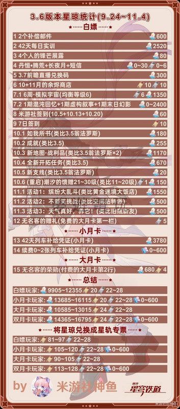 正文摘要:《崩壞:星穹鐵道》3.6版本星瓊獲取統計 快速閱讀精華 🚀 核心重點: 本篇攻略整理了《崩壞:星穹鐵道》3.6版本中,玩家預計能獲取的星瓊總量!🔍 詳細數據: 具體數字與來源分類,請參考文章內的詳細圖表!💰 大月卡影響: 無論你是無課玩家,或是購買了標準版大月卡或進階版大月卡,這份統計都能幫助你規劃資源。💡 輕鬆規劃: 瞭解各管道的星瓊數量,讓你更有效率地規劃抽卡策略! 親愛的開拓者們,在《崩壞:星穹鐵道》3.6版本前瞻直播結束後,大家最關心的肯定就是這個版本到底能累積多少星瓊,好讓荷包滿滿準備抽新角色吧!這份攻略將為大家整理3.6版本預計能獲得的星瓊總量,幫助你快速掌握資源配置。 無論你是無課玩家,還是會購買付費大月卡的玩家,這份統計都能提供實用的參考。如果你是選擇費用較低的標準版大月卡玩家,圖表中的數字將直接適用;如果你選擇的是費用較高的進階版大月卡,則可以在標準版的基礎上,額外再獲得一定數量的星瓊獎勵喔! 詳細的星瓊獲取來源與數量,都在下面的圖表中一目瞭然! 👉 GM後台版 遊戲 推薦 ⬇️⬇️⬇️ 快速玩各種二次元動漫手遊app 以下廣告滑動後還有帖子內容var custom_call_MIR = function (params) {if ( params === null || params.hasAd === false ) {var divRowSide;for (let index = 0; index < ONEADs.length; index++) {if (ONEADs[index].pub.player_mode === "mobile-inread") {divRowSide = ONEADs[index].pub.slotobj;}}var ins = document.createElement('ins');ins.className = 'clickforceads';ins.setAttribute('style', 'display:inline-block;');ins.setAttribute('data-ad-zone', '18264');divRowSide.appendChild(ins);var js = document.createElement('script');js.async = true;js.type = 'text/javascript';js.setAttribute('src', '//cdn.holmesmind.com/js/init.js');js.onload = function(){console.log('[ONEAD MIR] ClickForce Loaded');};divRowSide.appendChild(js);}};var _ONEAD = {};_ONEAD.pub = {};_ONEAD.pub.slotobj = document.getElementById("oneadMIRDFPTag");_ONEAD.pub.slots = ["div-onead-ad"];_ONEAD.pub.uid = "1000509";_ONEAD.pub.external_url = "https://onead.onevision.com.tw/";_ONEAD.pub.scopes = ["spotbuy", "speed"];_ONEAD.pub.player_mode_div = "div-onead-ad";_ONEAD.pub.player_mode = "mobile-inread";_ONEAD.pub.queryAdCallback = custom_call_MIR;var ONEAD_pubs = ONEAD_pubs || [];ONEAD_pubs.push(_ONEAD);var truvidScript = document.createElement('script'); truvidScript.async = true; truvidScript.setAttribute('data-cfasync','false'); truvidScript.type = 'text/javascript'; truvidScript.src = '//stg.truvidplayer.com/index.php?sub_user_id=597&widget_id=3309&playlist_id=2381&m=a&cb=' + (Math.random() * 10000000000000000); var currentScript = document.currentScript || document.scripts[document.scripts.length - 1]; currentScript.parentNode.insertBefore(truvidScript, currentScript.nextSibling); 《崩壞:星穹鐵道》3.6版本星瓊統計 常見問題Q&A Q:這份星瓊統計包含哪些來源? A:這份統計會涵蓋3.6版本更新、日常任務、活動獎勵、版本簽到、模擬宇宙等主要星瓊獲取來源,力求提供最完整的預估。 Q:我是無課玩家,也能從這份統計中參考嗎? A:當然可以!圖表中會清楚標示出無課玩家可獲得的基礎星瓊數量,幫助你瞭解免費資源的上限。 Q:大月卡的兩種版本對星瓊獲取有什麼差別? A:主要差異在於費用較高的進階版大月卡會比標準版大月卡提供額外一定數量的星瓊獎勵,以及其他更豐厚的遊戲內道具。 Q:圖表中的數字是確定的嗎? A:這份統計是根據官方前瞻直播內容與遊戲更新慣例所做的預估數值,實際遊戲中可能會因個人進度或官方調整而有微幅差異。 Q:這些星瓊足夠抽到我想要的新角色嗎? A:這取決於你的抽卡運氣與星瓊規劃。這份統計能幫助你瞭解版本可獲取的總量,方便你預估並制定抽卡策略,但最終能否抽到目標角色仍有隨機性。 |