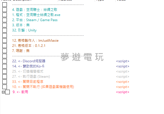 正文摘要:replyreload += ',' + 2405167; 《空洞騎士:絲綢之歌》CE腳本 快速閱讀精華 🔧 必備工具:本攻略需搭配 Cheat Engine 7.5 或以上版本使用。💪 核心功能: 戰鬥無憂: 無敵模式、鎖定最大生命值、輕鬆擊殺。資源無限: 無限絲線、吉歐幣修改、碎片修改、道具無限使用。探索神技: 無限跳躍、隨時衝刺、解鎖全地圖、穿牆模式 (No Clip)。 🎮 支援平台: PC 平台的 Steam 與 Game Pass 版本皆適用。⚠️ 風險提醒: 修改遊戲具備一定風險,特別是「成就解鎖」功能,請謹慎使用並自行承擔後果。 本文章目錄.article-toc { border: 1px solid #ddd; padding: 15px; background: #f9f9f9; border-radius: 6px; margin: 20px 0; width: 95%;}.toc-title { /* --- 以下是合併進來的 H2 樣式 --- */ font-size: 1.25em; /* 125% */ border-left: 5px solid #2A98DA; border-radius: 2px; padding: 5px 0px 5px 10px; font-weight: bold; margin: 0 0 15px 0; /* 調整了 margin,只留下方 15px */ color: #333; line-height: 1.5; background-color: #f8f8f8; /* --- 樣式合併結束 --- */}.toc-list { list-style: none; padding-left: 0;}.toc-list li { margin: 8px 0;}.toc-list a { color: #2A98DA; text-decoration: none;}.toc-list a:hover { text-decoration: underline;}.back-to-top { display: block; margin-top: 10px; font-size: 0.9em; color: #666;}事前準備:安裝主程式document.currentScript.previousElementSibling.href = location.href.split('#')[0] + '#prep';開始之前的重要提醒document.currentScript.previousElementSibling.href = location.href.split('#')[0] + '#warning';CE腳本功能完整一覽document.currentScript.previousElementSibling.href = location.href.split('#')[0] + '#features';腳本檔案下載點 🔽document.currentScript.previousElementSibling.href = location.href.split('#')[0] + '#download';CE腳本基礎使用教學document.currentScript.previousElementSibling.href = location.href.split('#')[0] + '#usage';常見問題Q&Adocument.currentScript.previousElementSibling.href = location.href.split('#')[0] + '#faq'; 《空洞騎士:絲綢之歌》的廣大世界與充滿挑戰性的戰鬥,是不是讓你既期待又怕受傷害呢?對於想專心體驗劇情、或是卡關卡到心累的玩家來說,有時候一點小小的幫助就能讓遊戲體驗大幅提升。 這篇攻略就是要為大家介紹一款針對《絲綢之歌》設計的 Cheat Engine (CE) 中文化腳本,我們團隊實際測試後,它能穩定支援 Steam 和 Game Pass 版本。透過這個腳本,你可以自由調整多項遊戲數值,從無敵到無限跳躍,讓你化身最強的黃蜂小姐,輕鬆探索聖巢的秘密! 事前準備:安裝主程式 在開始使用這個強大的腳本之前,你必須先在電腦上安裝 Cheat Engine 這個主程式。它就像是工具的「作業系統」,沒有它,腳本檔是無法運作的喔! 【小知識】 什麼是 Cheat Engine (CE)?它是一款記憶體修改編輯工具,玩家可以透過它來修改遊戲中的數據,例如生命值、金錢等,是製作和使用遊戲修改器的神器。 底下我們為大家整理了不同版本的中文化 CE 主程式,可以根據你的需求下載安裝: 《Cheat Engine》V7.5 中文化版:點此前往下載頁面《Cheat Engine》V7.6 中文化版:點此前往下載頁面 開始之前的重要提醒 ⚠️ 風險聲明 ⚠️ 使用任何第三方工具修改遊戲都存在潛在風險。這份腳本主要是為了增加單機遊玩的樂趣、幫助卡關的玩家順利通關而設計。其中「解鎖/重置所有成就」的功能,雖然方便,但也可能違反平台的使用者條款。 我們強烈建議: 在單機、離線模式下使用,享受個人的遊戲樂趣。對於「成就」相關功能,請務必了解其風險後再決定是否啟用。任何因此造成的帳號問題,後果需由玩家自行承擔。 CE腳本功能完整一覽 這份腳本提供了非常全面的修改選項,幾乎涵蓋了所有你想得到的便利功能。大家可以根據自己的需求勾選啟用: 👉 GM後台版 遊戲 推薦 ⬇️⬇️⬇️ 快速玩各種二次元動漫手遊app Max Health:鎖定最大生命值,讓你不再貧血。Max Silk:鎖定最大絲線量,技能放不停。Invulnerability:無敵模式,站著給王打都沒問題!Geo Changer*:吉歐幣修改器。(註*:這個功能會同步更新遊戲內的顯示數值,比手動修改更直觀。)Shards Changer*:碎片修改器。(註*:同樣會同步更新遊戲內的顯示數值。)Infinite Jumps:無限跳躍,想去哪就去哪,輕鬆飛越各種地形。Dash Anytime**:隨時衝刺。(註**:主要為測試用,若你已正常解鎖此能力則無效果。)Harpoon Dash Anytime**:隨時使用魚叉衝刺。(註**:同上,為測試用功能。)Play Needolin Anytime**:隨時演奏風琴。(註**:同上,為測試用功能。)Easy Kills:輕鬆擊殺,小怪或頭目都能快速解決。Infinite Tool Usage:道具無限使用。Equip / Change Tools Anywhere:隨時隨地更換裝備/道具。Toggle Unlock All Maps:一鍵解鎖所有地圖,路痴玩家的福音。Toggle No Clip****:穿牆模式開關。(註****:特別注意!啟用此功能會讓你的角色立刻從當前地面往下掉落,請小心使用。)Award / Reset All Achievements***:解鎖或重置所有成就。(註***:高風險功能,使用前請三思,後果自負。) 腳本檔案下載點 🔽 確認你已經安裝好 Cheat Engine 主程式後,就可以下載這次攻略的主角——`.CT` 腳本檔囉! 腳本檔案名稱: HollowKnightSilksong_ZH.CT 所有站內附件皆會附上安全掃描報告請會員查看純淨度百分比後判斷使用(adsbygoogle = window.adsbygoogle || []).push({});相關檔案須知:取得檔案前,請先詳細閱讀文章內容避免不必要錯誤與誤會發生。也可多參考文章討論樓層內容了解附件檔案相關討論資訊。 【此文章部分內容隱藏中】 解除隱藏說明教學點擊下方 繼續閱讀文章 後請仔細觀看文章內容 