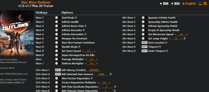 正文摘要:《星際大戰:亡命之徒》修改器 快速閱讀精華 🚀 修改器版本: 風靈月影製作,支援遊戲版本 v1.0 至 v1.7+。💪 核心戰鬥功能: 上帝模式、無限生命武器不會過熱、技能無冷卻一擊必殺、潛行模式 💰 資源與屬性: 無限金錢(Credits)無限道具數量快速提升派系聲望 🛸 載具與移動: 飛車與太空船無限生命/護盾自訂移動速度與跳躍高度傳送功能(儲存/讀取位置) 🔽 直接下載: 點我直接跳到下載位置document.currentScript.previousElementSibling.href = location.href.split('#')[0] + '#download_point'; 本文章目錄.article-toc { border: 1px solid #ddd; padding: 15px; background: #f9f9f9; border-radius: 6px; margin: 20px 0; width: 95%;}.toc-title { /* --- 以下是合併進來的 H2 樣式 --- */ font-size: 1.25em; /* 125% */ border-left: 5px solid #2A98DA; border-radius: 2px; padding: 5px 0px 5px 10px; font-weight: bold; margin: 0 0 15px 0; /* 調整了 margin,只留下方 15px */ color: #333; line-height: 1.5; background-color: #f8f8f8; /* --- 樣式合併結束 --- */}.toc-list { list-style: none; padding-left: 0;}.toc-list li { margin: 8px 0;}.toc-list a { color: #2A98DA; text-decoration: none;}.toc-list a:hover { text-decoration: underline;}.back-to-top { display: block; margin-top: 10px; font-size: 0.9em; color: #666;}重要提醒:使用前必讀document.currentScript.previousElementSibling.href = location.href.split('#')[0] + '#risk_warning';修改器功能全解析document.currentScript.previousElementSibling.href = location.href.split('#')[0] + '#feature_list';- 角色戰鬥功能document.currentScript.previousElementSibling.href = location.href.split('#')[0] + '#combat_features';- 資源與聲望調整document.currentScript.previousElementSibling.href = location.href.split('#')[0] + '#resource_features';- 載具與移動輔助document.currentScript.previousElementSibling.href = location.href.split('#')[0] + '#vehicle_features';修改器檔案下載點 🔽document.currentScript.previousElementSibling.href = location.href.split('#')[0] + '#download_point';風靈月影修改器 常見問題Q&Adocument.currentScript.previousElementSibling.href = location.href.split('#')[0] + '#faq'; 各位在銀河系中闖蕩的亡命之徒們,安安!在廣大的宇宙中冒險,有時候是不是覺得資源不夠、戰鬥太硬,或只是想體驗一下當神的感覺?別擔心,這篇攻略就是你的救星! 我們為大家準備了由知名開發者風靈月影製作的《星際大戰:亡命之徒》專用修改器,支援 v1.0-v1.7+ 的遊戲版本。這款工具提供了多達26項超實用功能,從戰鬥、資源到載具,全方位強化你的遊戲體驗,讓你輕鬆稱霸宇宙! 👉 GM後台版 遊戲 推薦 ⬇️⬇️⬇️ 快速玩各種二次元動漫手遊app 重要提醒:使用前必讀 單人模式專用: 為了確保遊戲公平性並避免帳號風險,這類修改器強烈建議只在單人離線模式下使用。在任何連線或多人模式中使用都可能導致帳號被鎖。防毒軟體提示: 修改器通常會被防毒軟體誤判為有風險的程式。這屬於正常現象,但下載與使用前請自行評估風險。版本對應: 請確保你的遊戲版本符合修改器支援的範圍(v1.0-v1.7+)。若遊戲更新,修改器可能會失效,需等待作者更新。 修改器功能全解析 接下來,我們將所有功能分門別類,讓你一眼就能找到需要的項目。操作方式很簡單,只要在遊戲中按下對應的熱鍵即可啟動或關閉。 角色戰鬥功能 想成為戰場上的神,誰也擋不住你?這些功能直接讓你變身超級英雄。 熱鍵功能說明數字鍵 1上帝模式 (God Mode),刀槍不入!數字鍵 2無限生命 (Infinite Health)數字鍵 3無限Bacta醫療瓶 (Infinite Bacta Vials)數字鍵 4無限手榴彈 (Infinite Grenades)數字鍵 5無限腎上腺素 (Infinite Adrenaline)數字鍵 6武器不會過熱 (Weapon No Overheat)數字鍵 7電擊槍立即冷卻 (Stun Shot Instant Cooldown)數字鍵 8潛行模式 (Stealth Mode),敵人通通變瞎子。數字鍵 9設定遊戲速度 (Set Game Speed),體驗子彈時間或高速戰鬥。數字鍵 0超級傷害/一擊必殺 (Super Damage/One Hit Kills)數字鍵 .傷害倍率調整 (Damage Multiplier)數字鍵 +防禦倍率調整 (Defense Multiplier) 資源與聲望調整 覺得錢不夠用、聲望升太慢?這些功能幫你一秒變大亨! 熱鍵功能說明Ctrl+數字鍵 1編輯金錢(Credits),想改多少就改多少。Ctrl+數字鍵 2編輯選定物品的數量 (Edit Selected Item Amount)Ctrl+數字鍵 3派系聲望全滿 (Max Faction Reputation)Ctrl+數字鍵 4派系聲望獲取倍率 (Faction Reputation Multiplier)Ctrl+數字鍵 5編輯派克集團聲望 (Edit Pyke Syndicate Reputation)Ctrl+數字鍵 6編輯赤紅黎明聲望 (Edit Crimson Dawn Reputation)Ctrl+數字鍵 7編輯赫特卡特爾聲望 (Edit Hutt Cartel Reputation) 載具與移動輔助 不論是陸上飛馳還是宇宙遨遊,這些功能都能讓你暢行無阻。 熱鍵功能說明Alt+數字鍵 1飛車無限生命 (Speeder Infinite Health)Alt+數字鍵 2太空船無限生命 (Spaceship Infinite Health)Alt+數字鍵 3太空船無限護盾 (Infinite Spaceship Shield)Alt+數字鍵 4清空敵人太空船護盾 (Empty AI Spaceship Shield)Alt+數字鍵 5設定移動速度 (Set Movement Speed),跑得比飛還快!Alt+數字鍵 6設定跳躍高度 (Set Jump Height),輕鬆飛簷走壁。Alt+數字鍵 7儲存目前位置 (Save Location)Alt+數字鍵 8傳送至儲存點 (Teleport)Alt+數字鍵 9回到傳送前的位置 (Undo Teleport) 修改器檔案下載點 🔽 準備好體驗無敵的快感了嗎?下方提供修改器的下載連結。 檔案名稱: Star Wars Outlaws v1.0-v1.7 Plus 26 Trainer.exe 下載連結: https://pixeldrain.com/u/gNhiaPzZ 【小知識】下載後,建議先開啟遊戲,再開啟修改器,然後在遊戲中按下對應熱鍵即可。 以下廣告滑動後還有帖子內容var cus